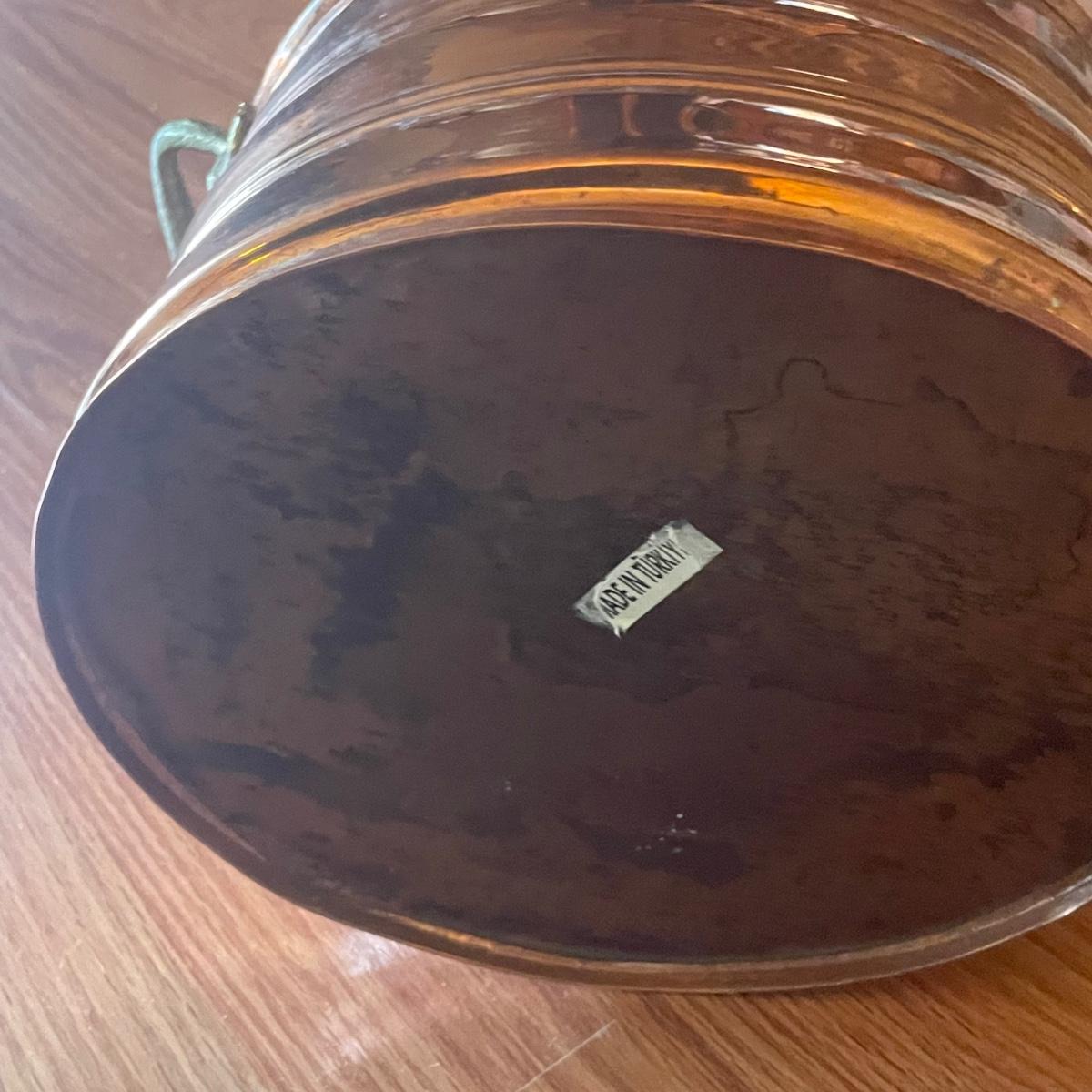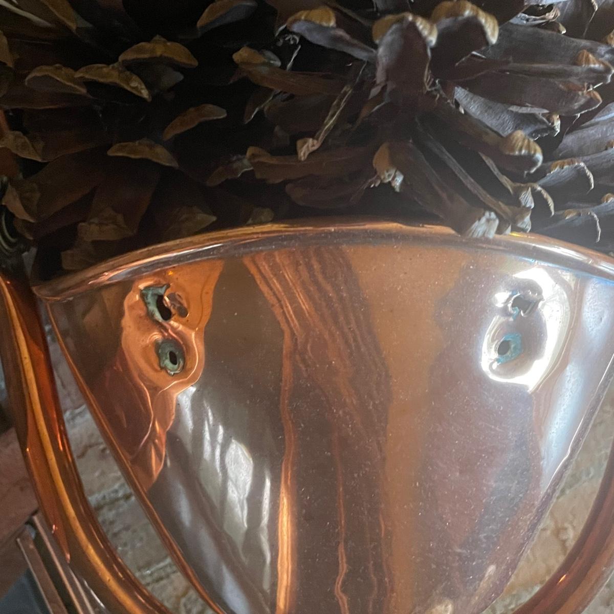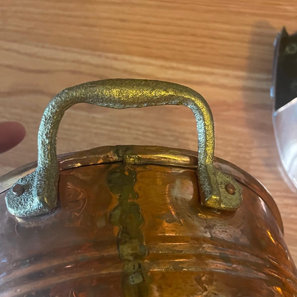 These three items are all copper; small bucket has brass handles and scoop has a wooden handle. The coal bucket has a loose piece of metal on its base and a couple of holes on the top but otherwise all items are in great condition. Pine cones are included.