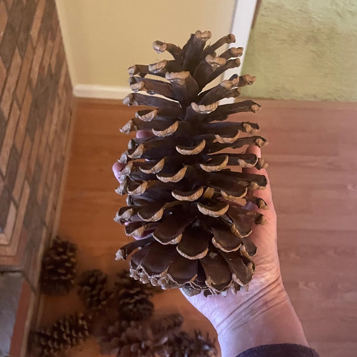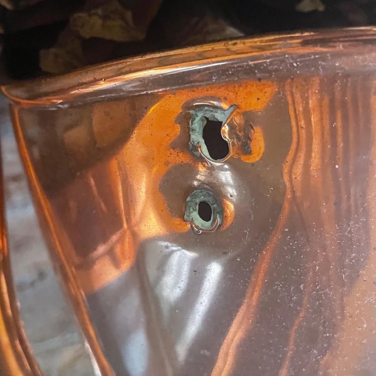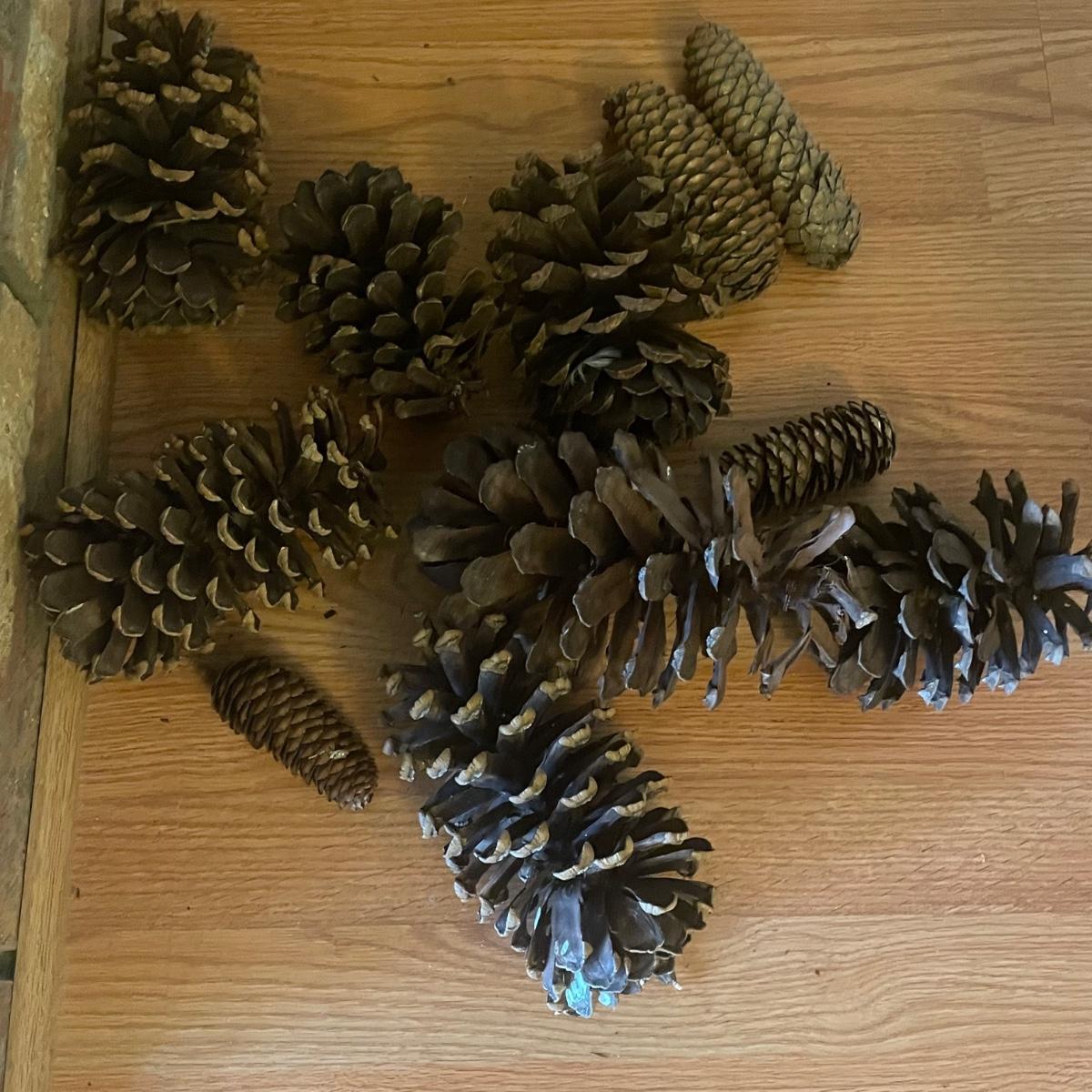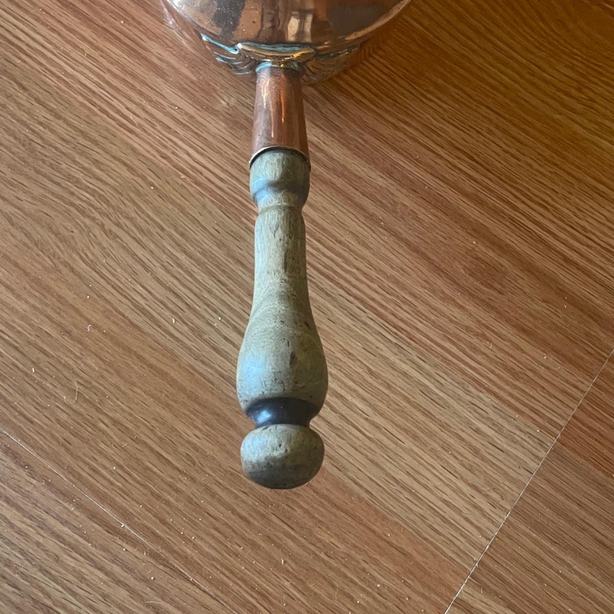 These three items are all copper; small bucket has brass handles and scoop has a wooden handle. The coal bucket has a loose piece of metal on its base and a couple of holes on the top but otherwise all items are in great condition. Pine cones are included.