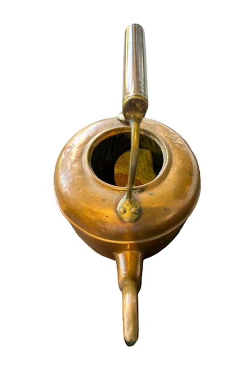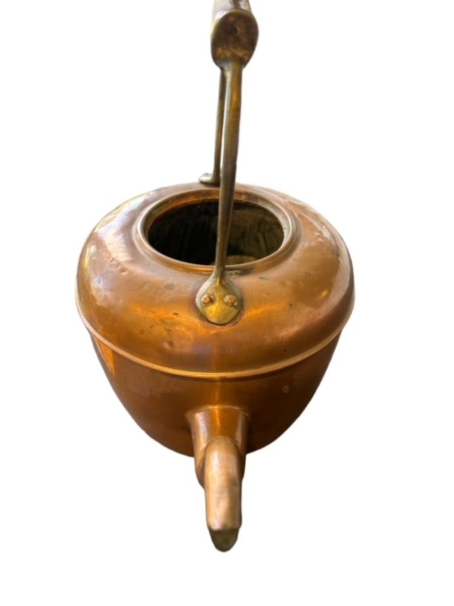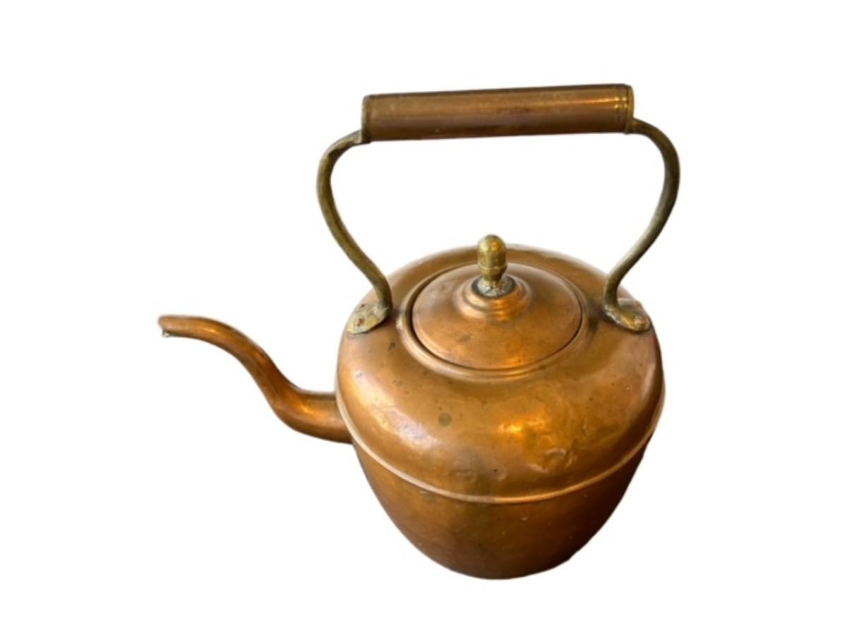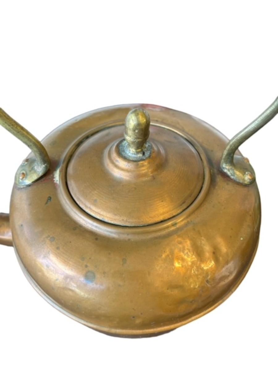 This tea Kettle is pre-owned with some minor dents/dings and naturally earned patina from decades of use....adds to the rustic charm of the piece. Cannot make out the mark on the bottom of the kettle.