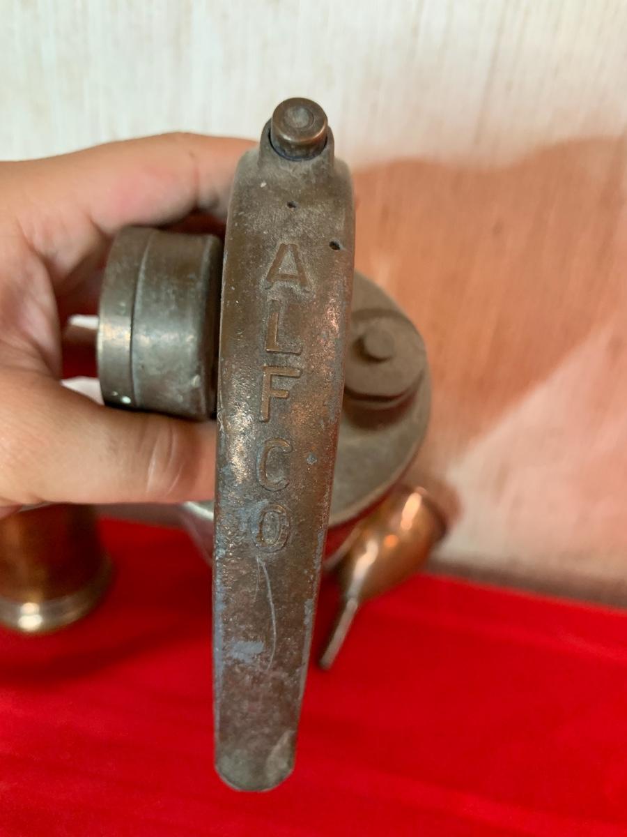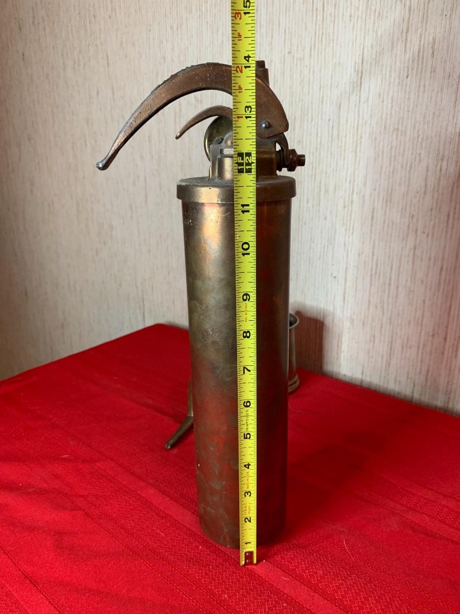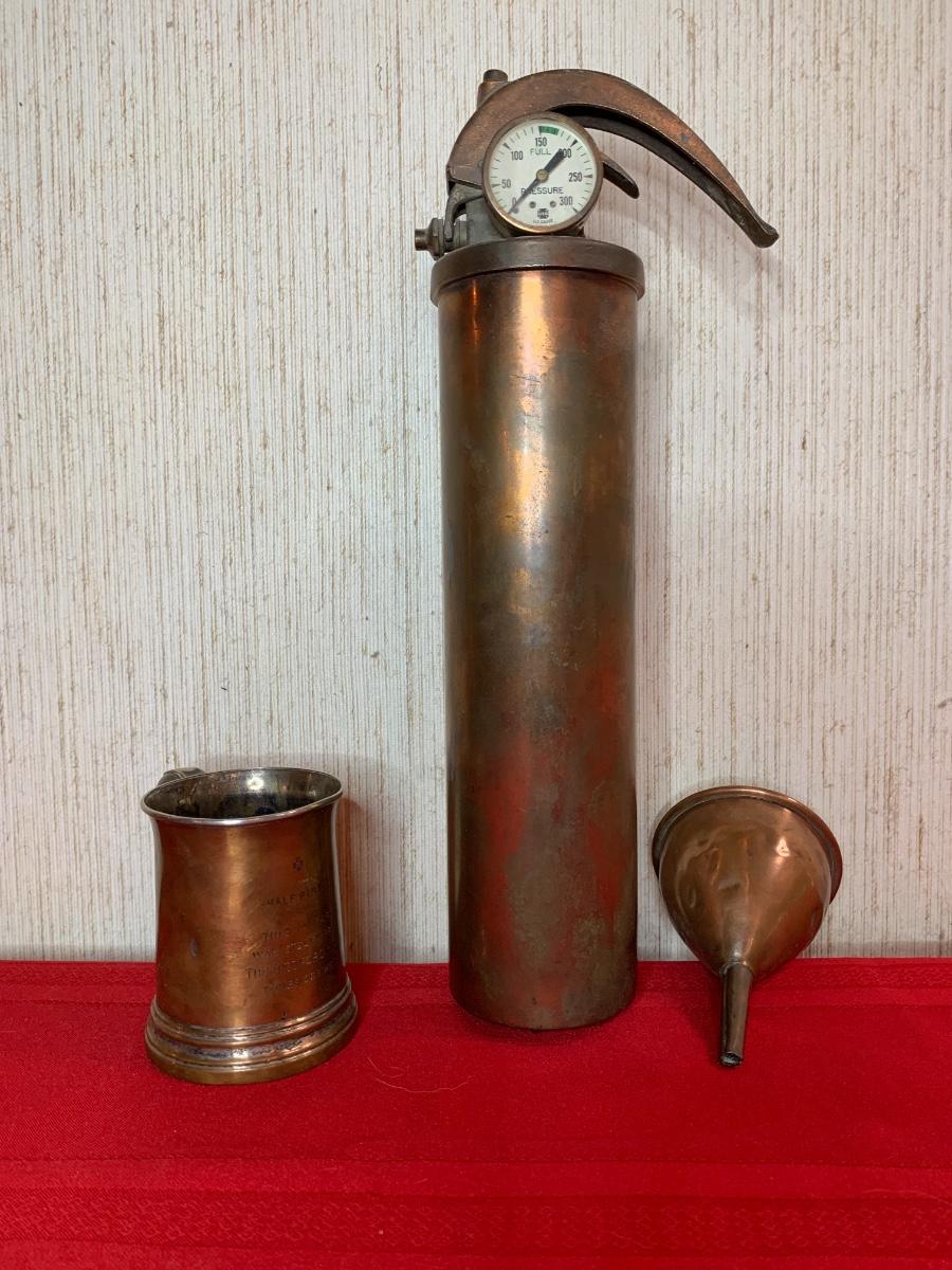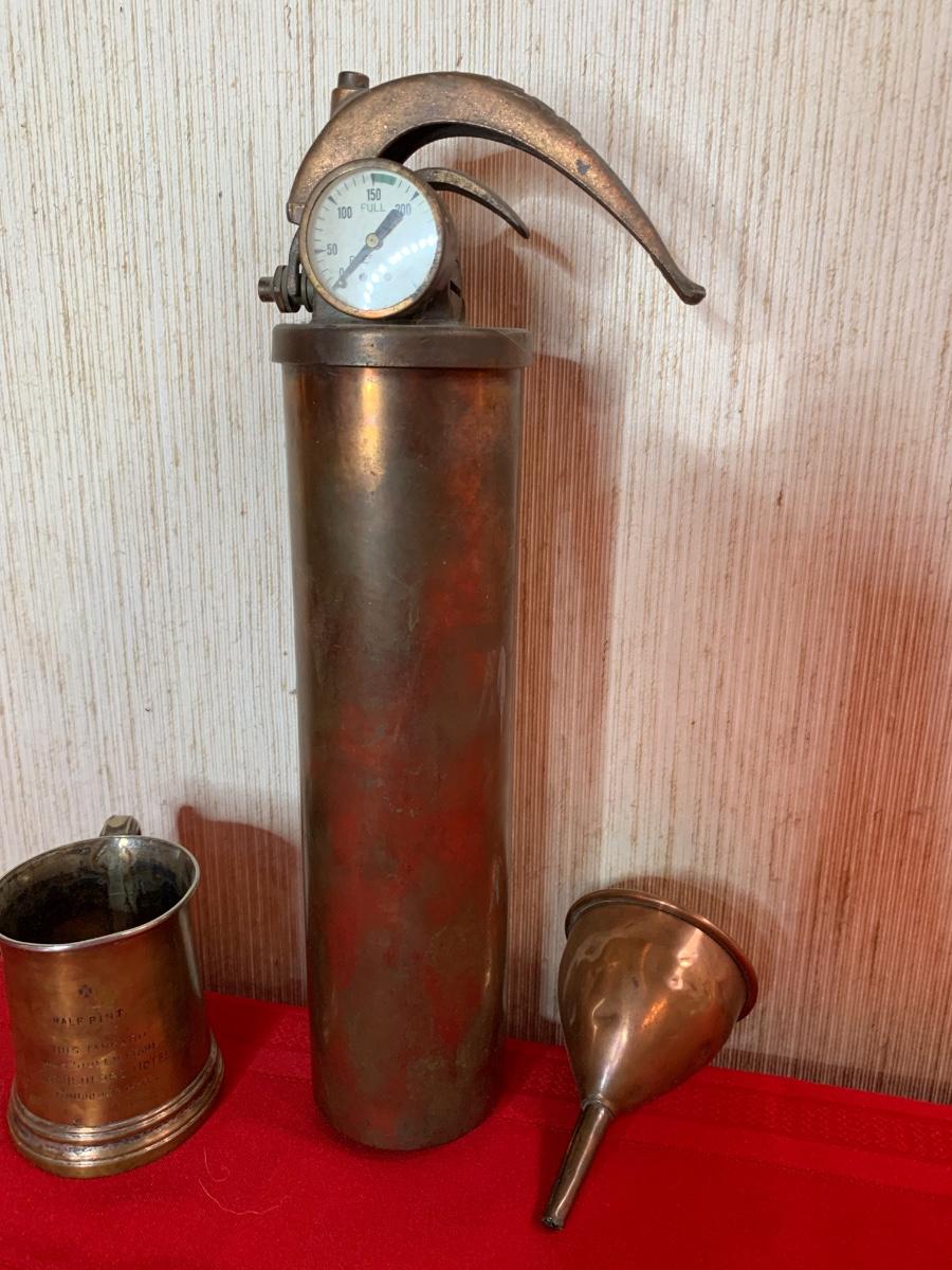 Alfco antique fire extinguisher, Bedford Hotel 1/2 pint and copper funnel.