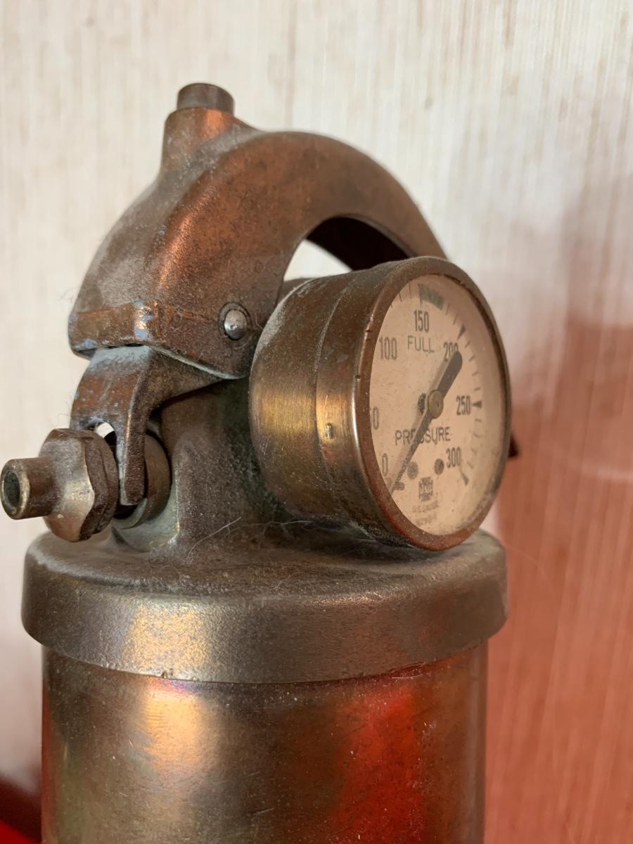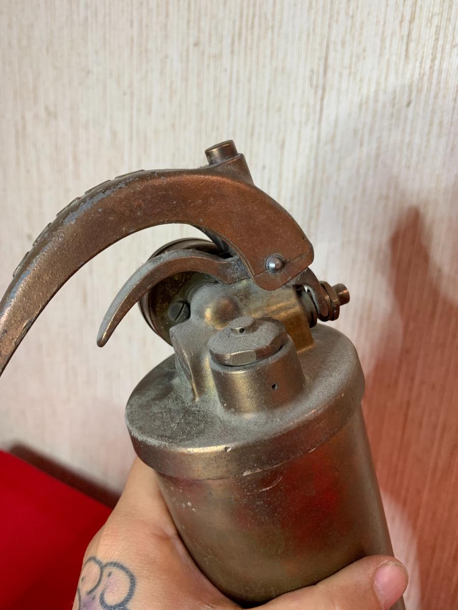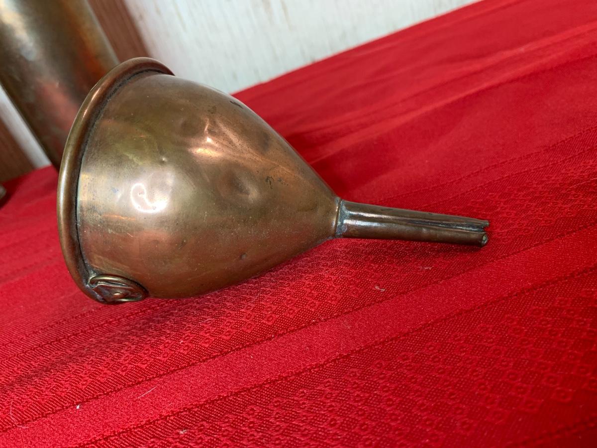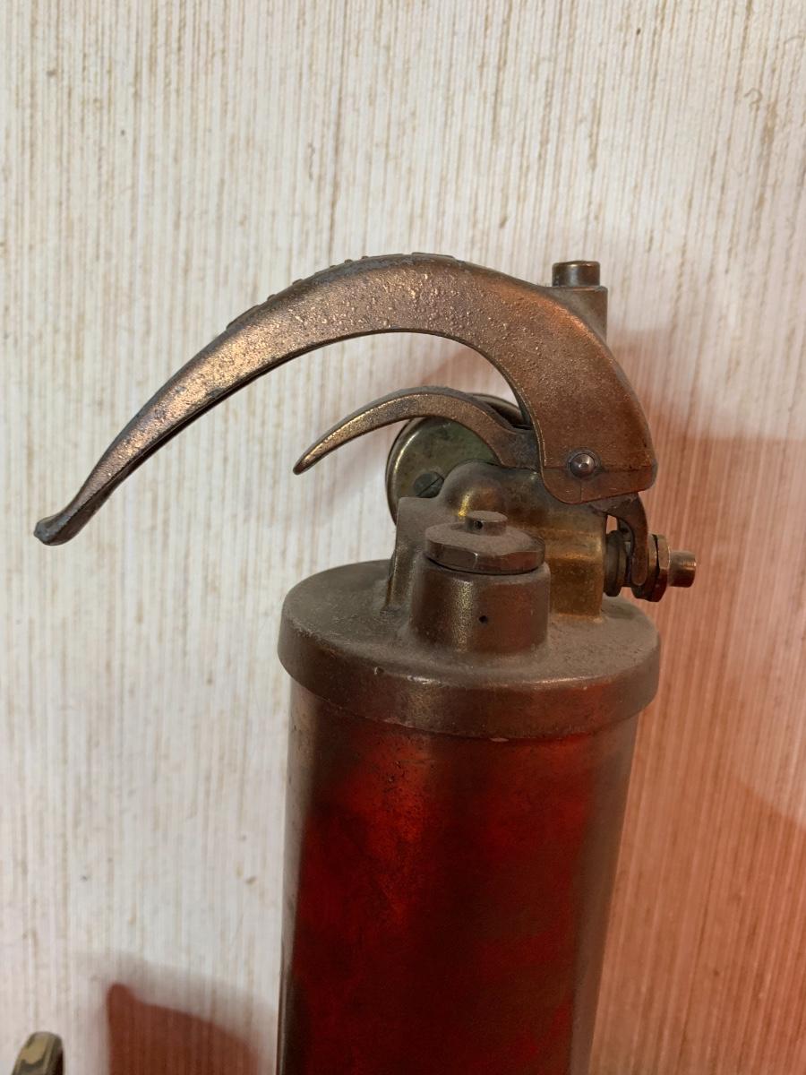 Alfco antique fire extinguisher, Bedford Hotel 1/2 pint and copper funnel.