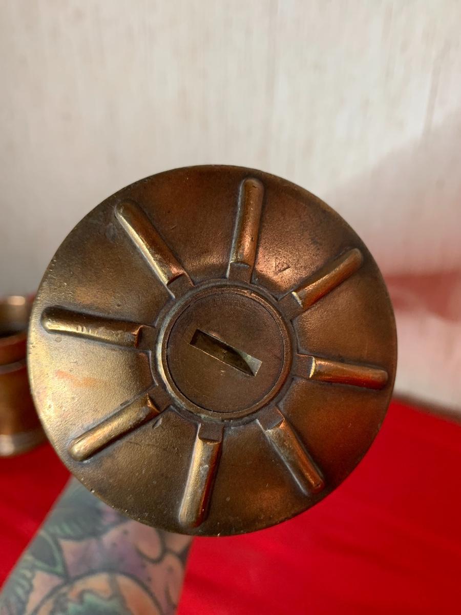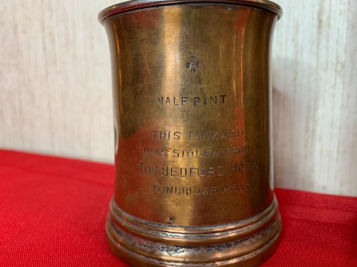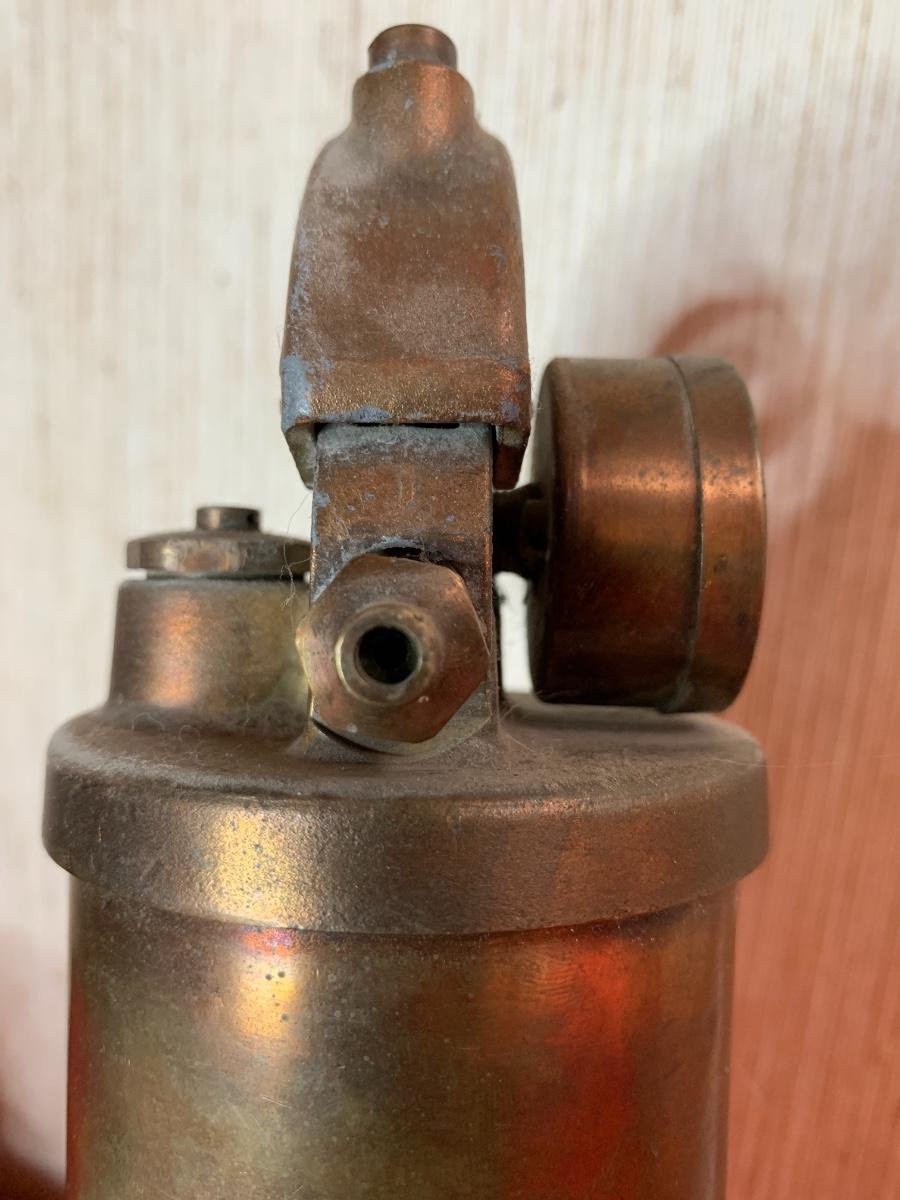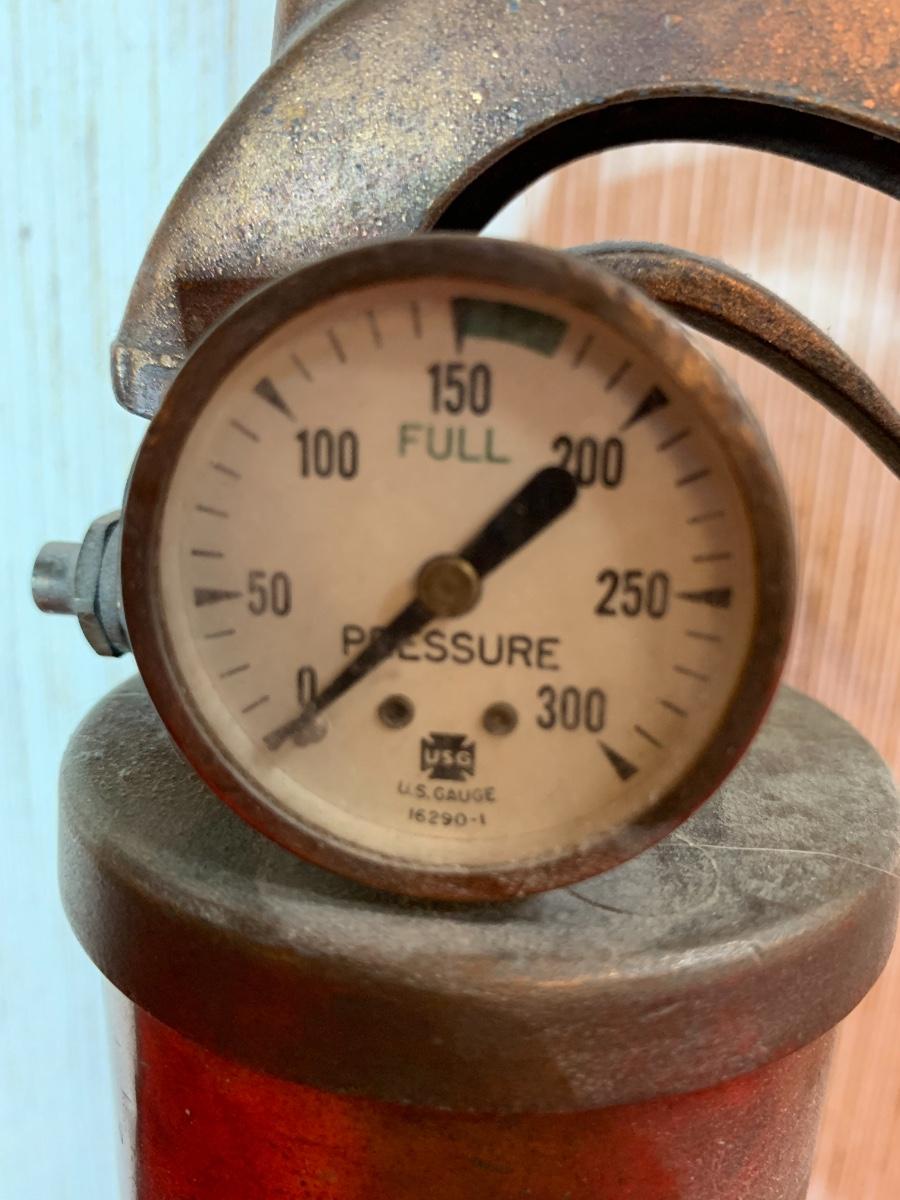 Alfco antique fire extinguisher, Bedford Hotel 1/2 pint and copper funnel.