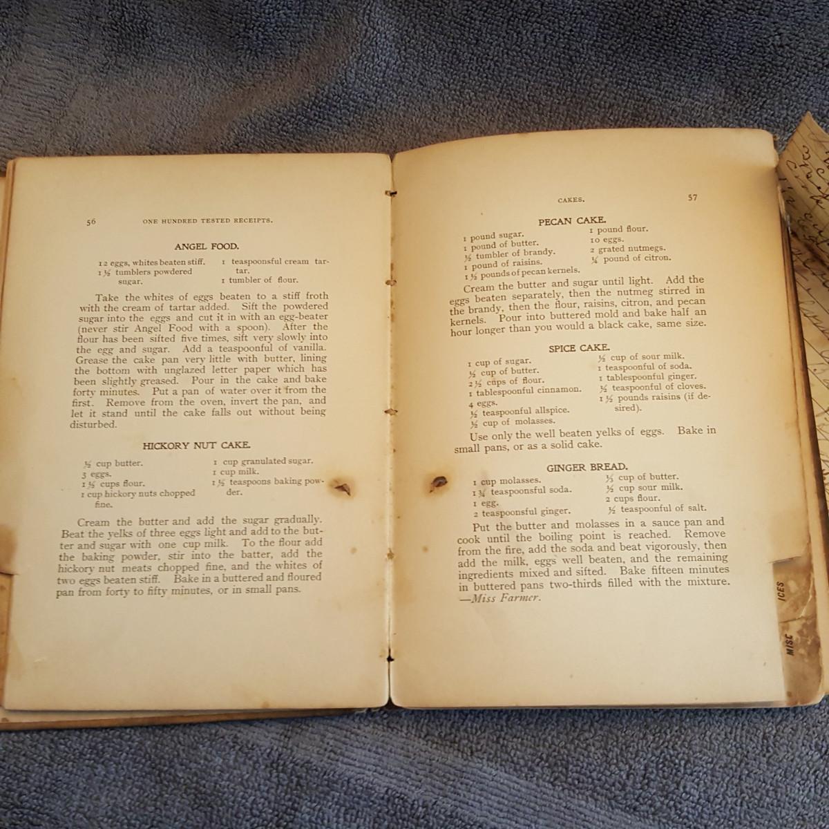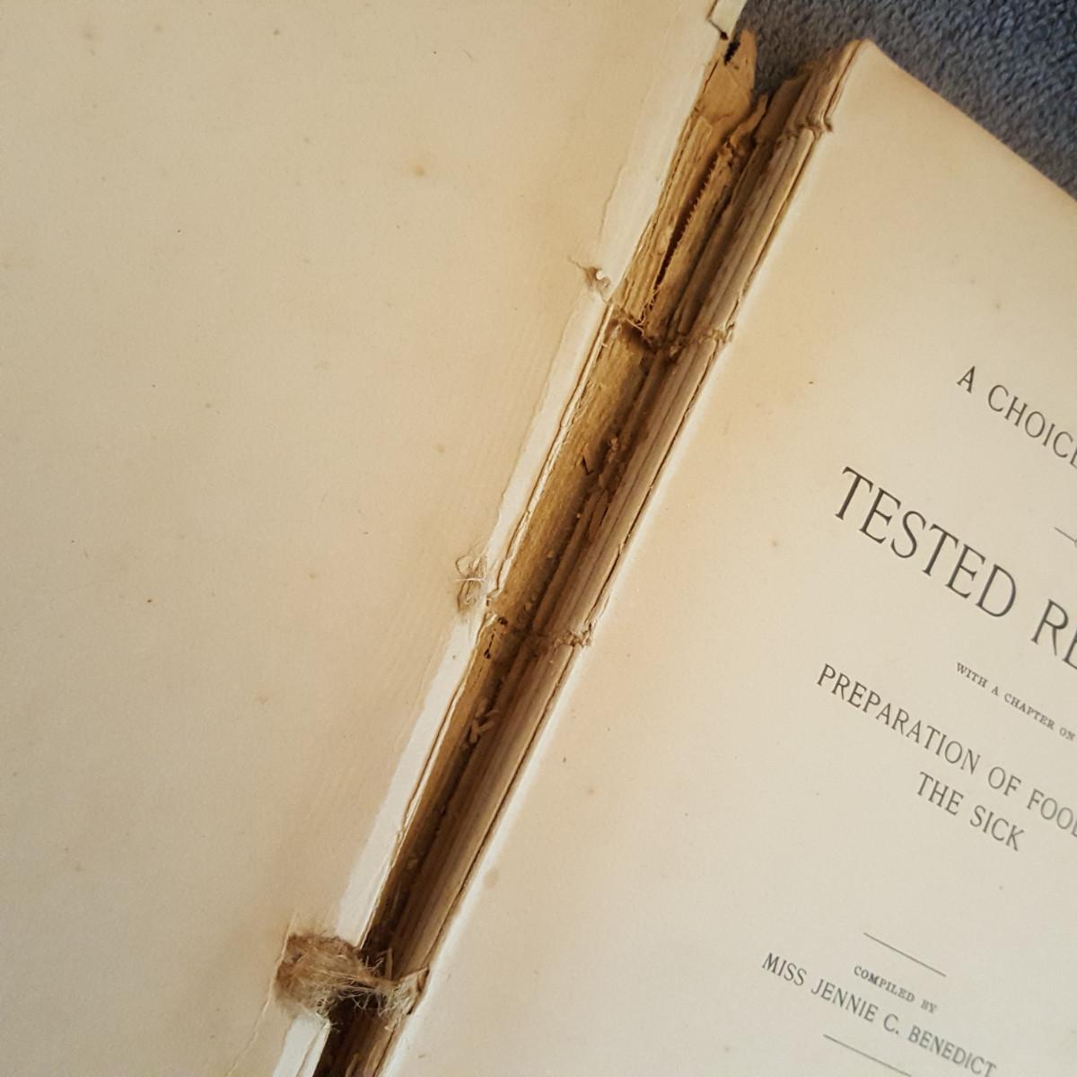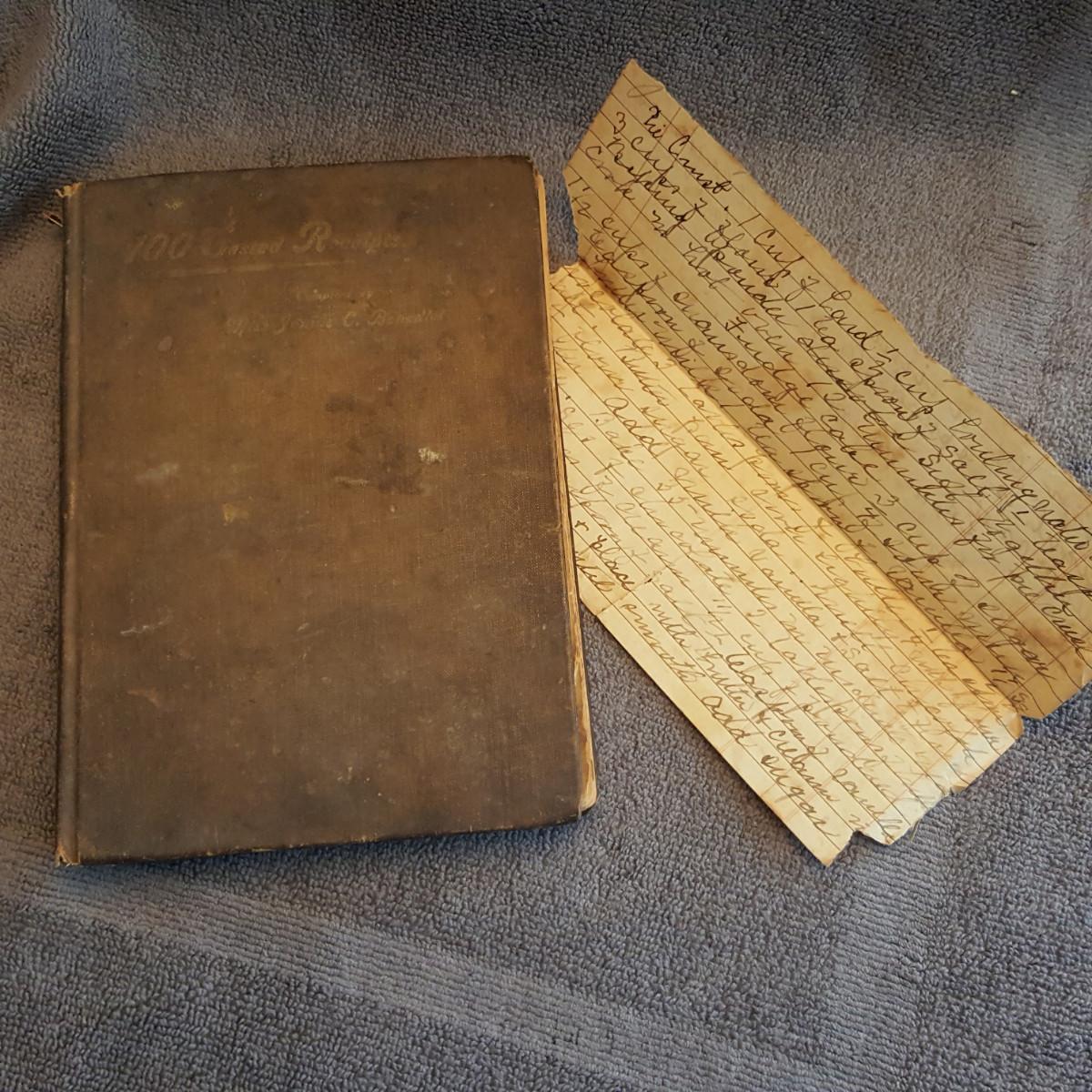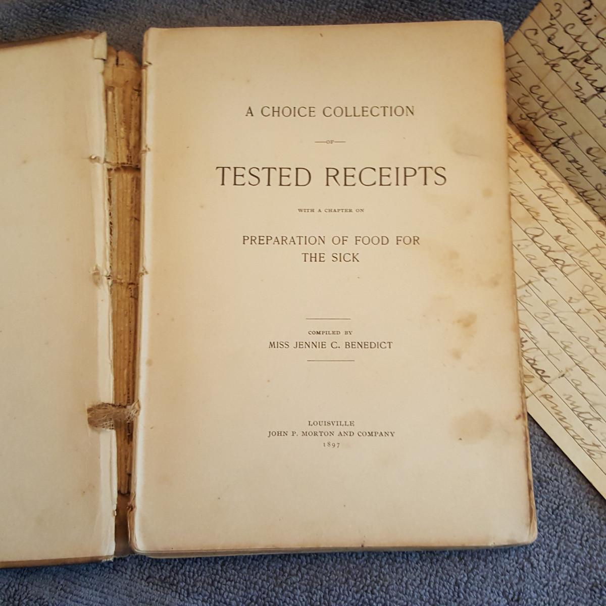 This auction lot is for a Antique Copy of Jennie Benedict's Cookbook. Eventually known as the Blue Ribbon Cook Book the first editions were titled "100 Tested Recipes Compiled by Jennie Benedict." This copy has seen much wear but is readable and repairable - see photos. This copy has the back pages filled with early handwritten receipts by previous owners. Copies of this book are very rare and hard to find. NOTE: if this antique book isn't for you a reprint of this book is available elsewhere in this sale.