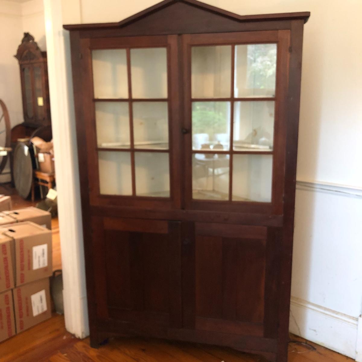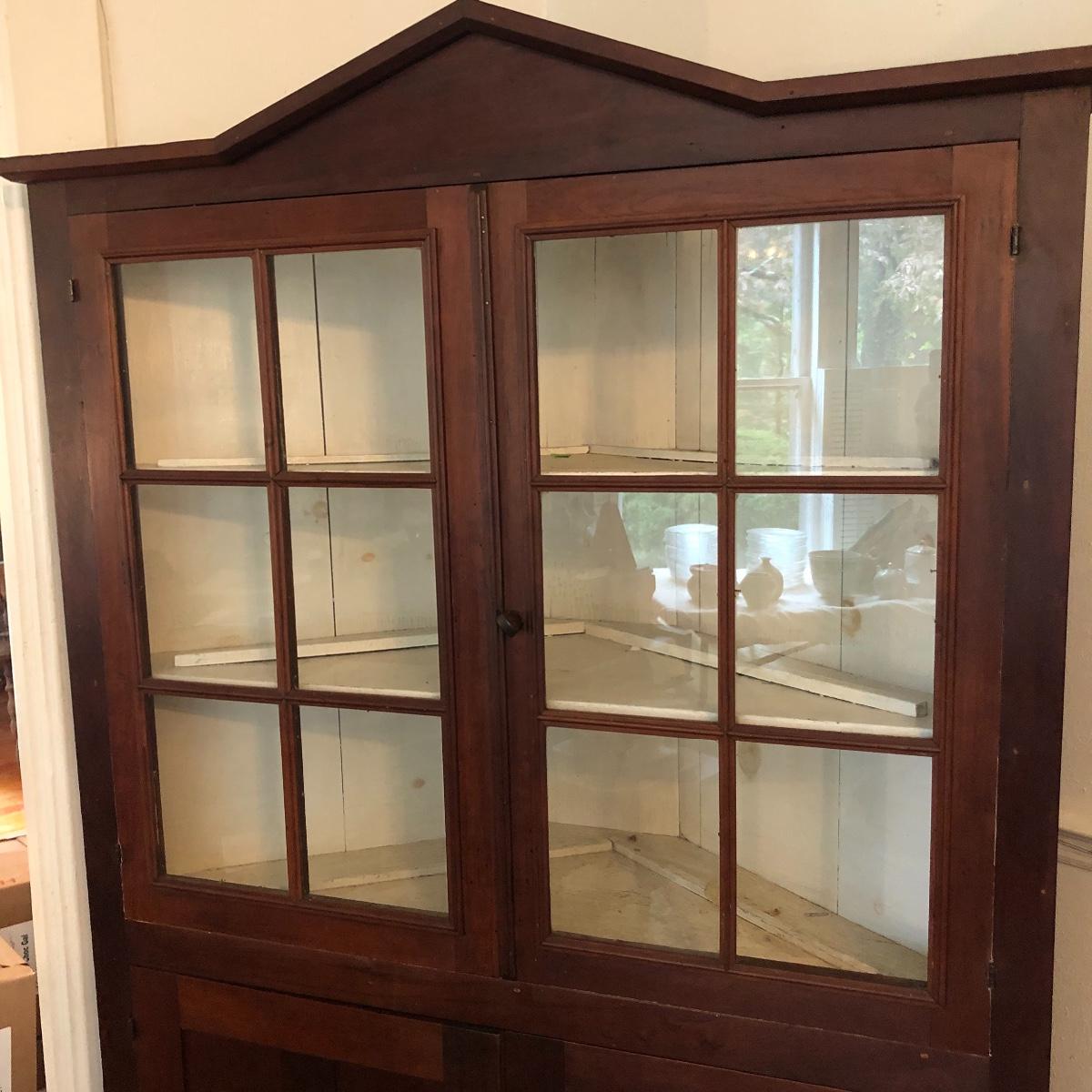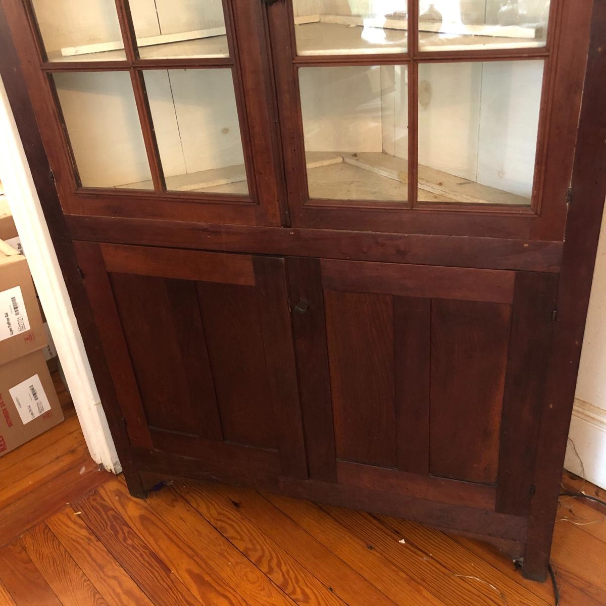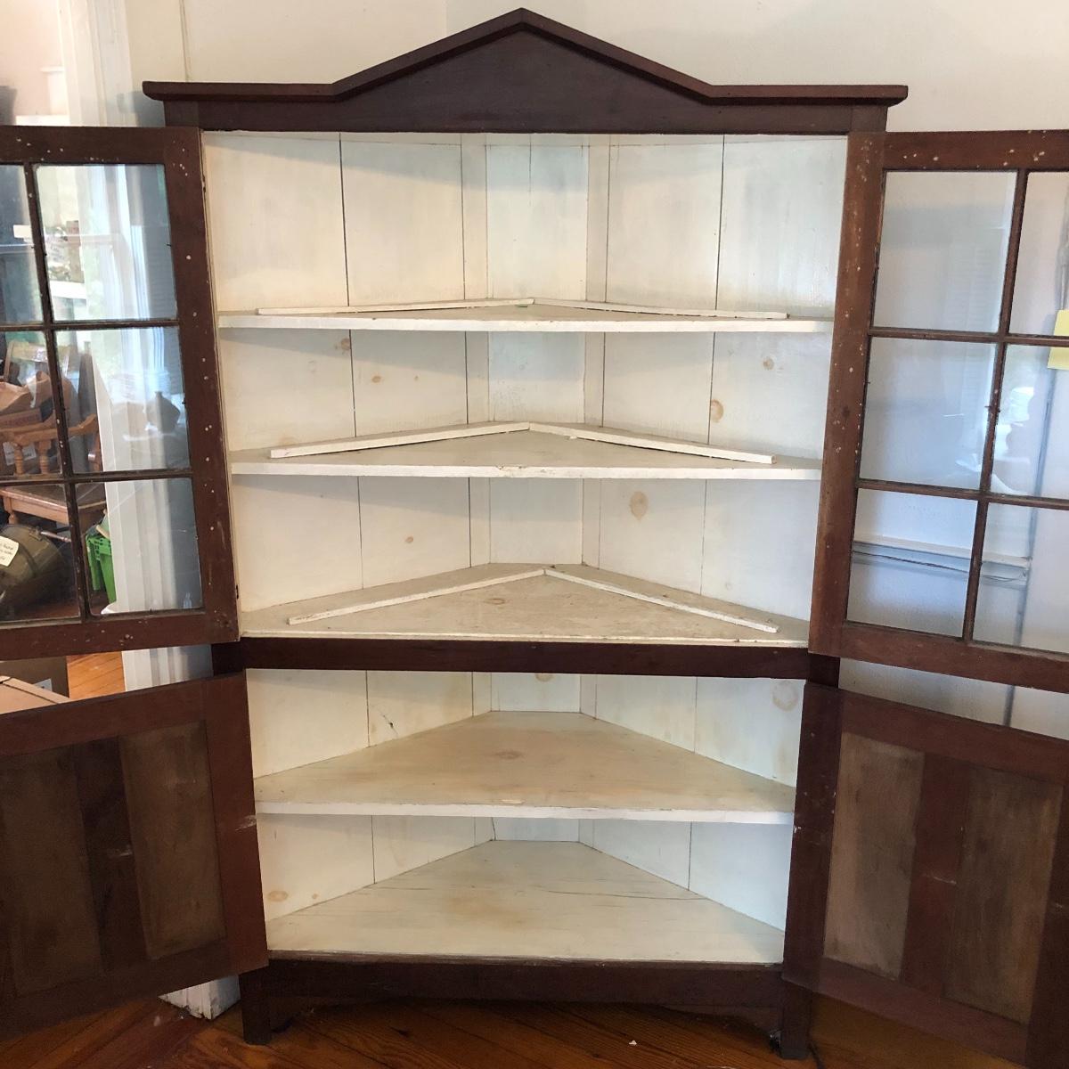 This corner cabinet is a large piece in excellent antique condition. The interior of the upper and lower cabinets has a white paint. Door latches are matching wood and two extra panes of glass that appear to be for this piece are included.
