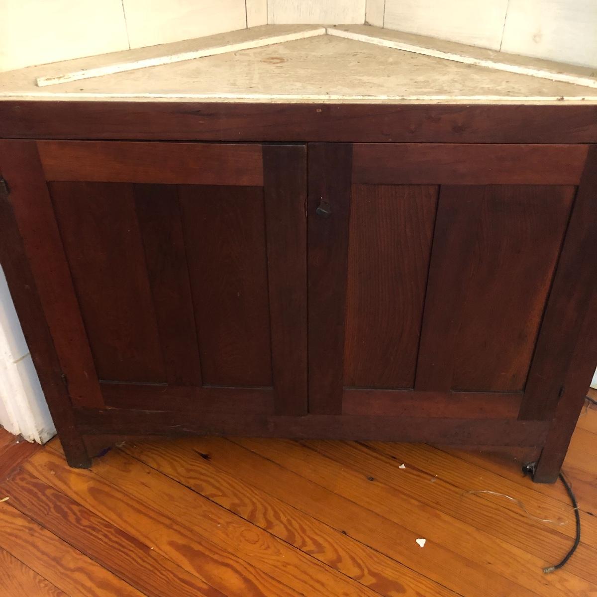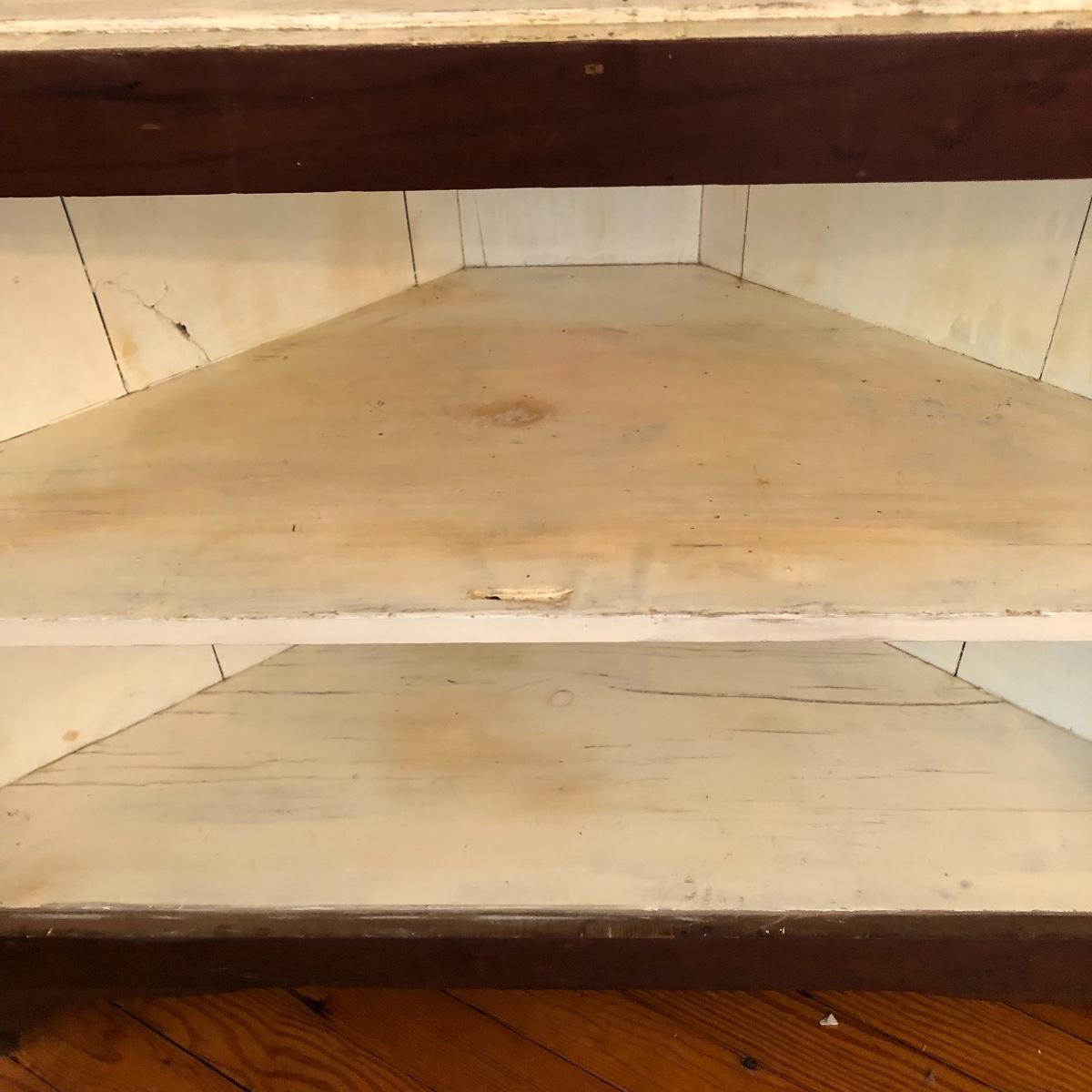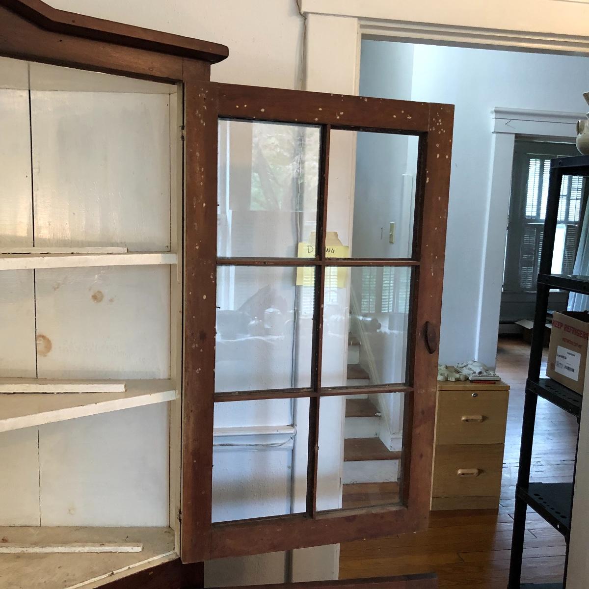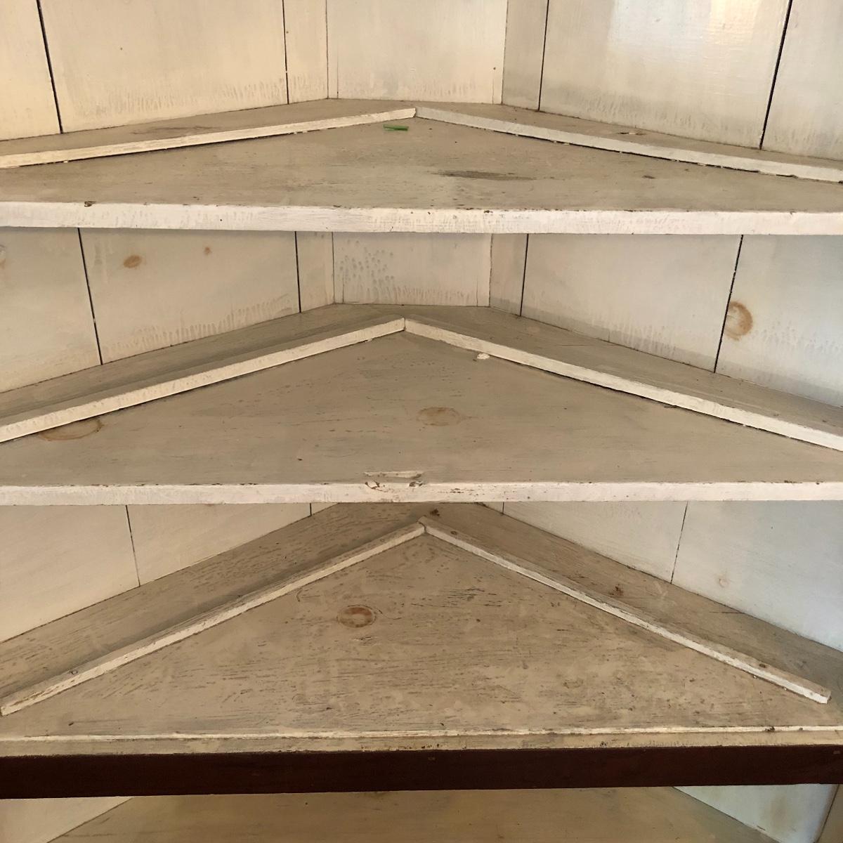 This corner cabinet is a large piece in excellent antique condition. The interior of the upper and lower cabinets has a white paint. Door latches are matching wood and two extra panes of glass that appear to be for this piece are included.