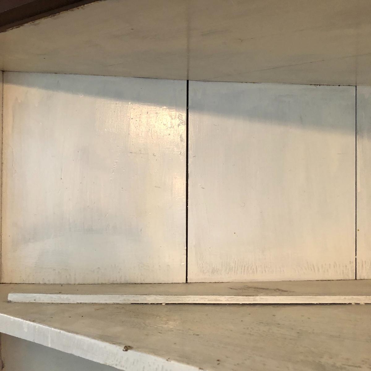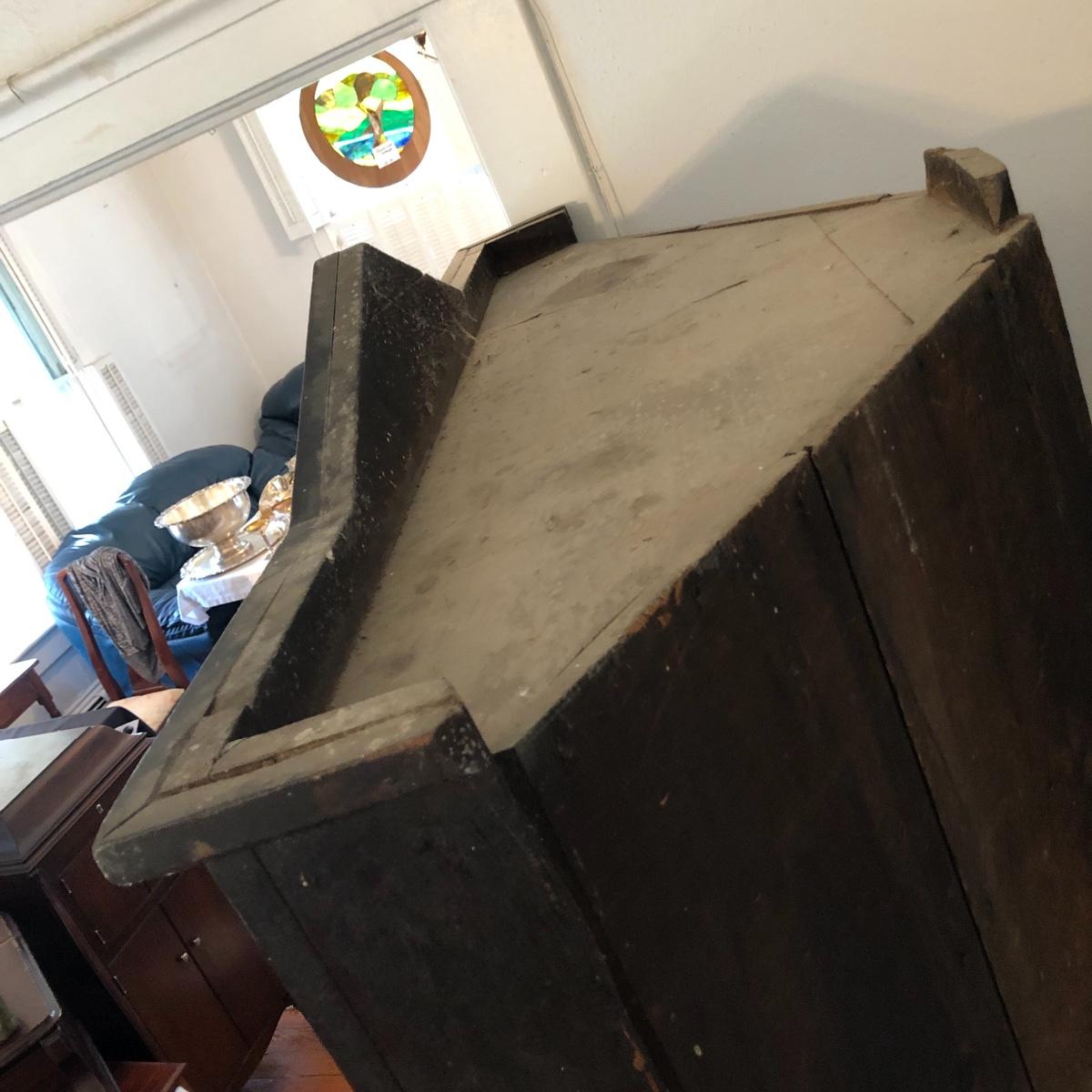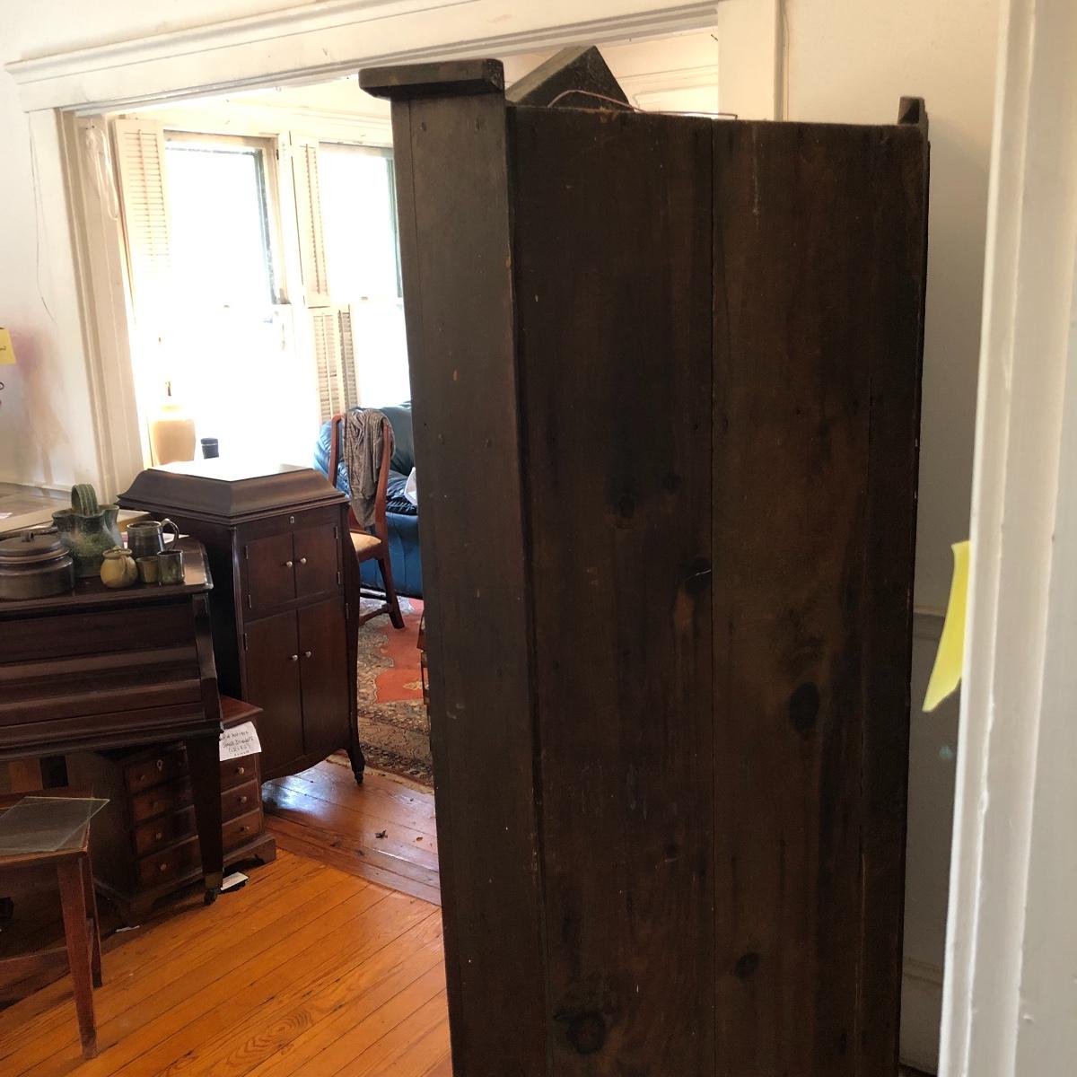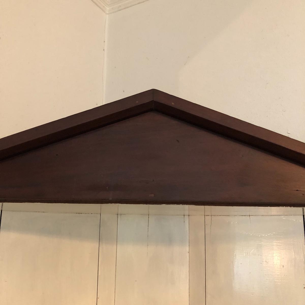 This corner cabinet is a large piece in excellent antique condition. The interior of the upper and lower cabinets has a white paint. Door latches are matching wood and two extra panes of glass that appear to be for this piece are included.