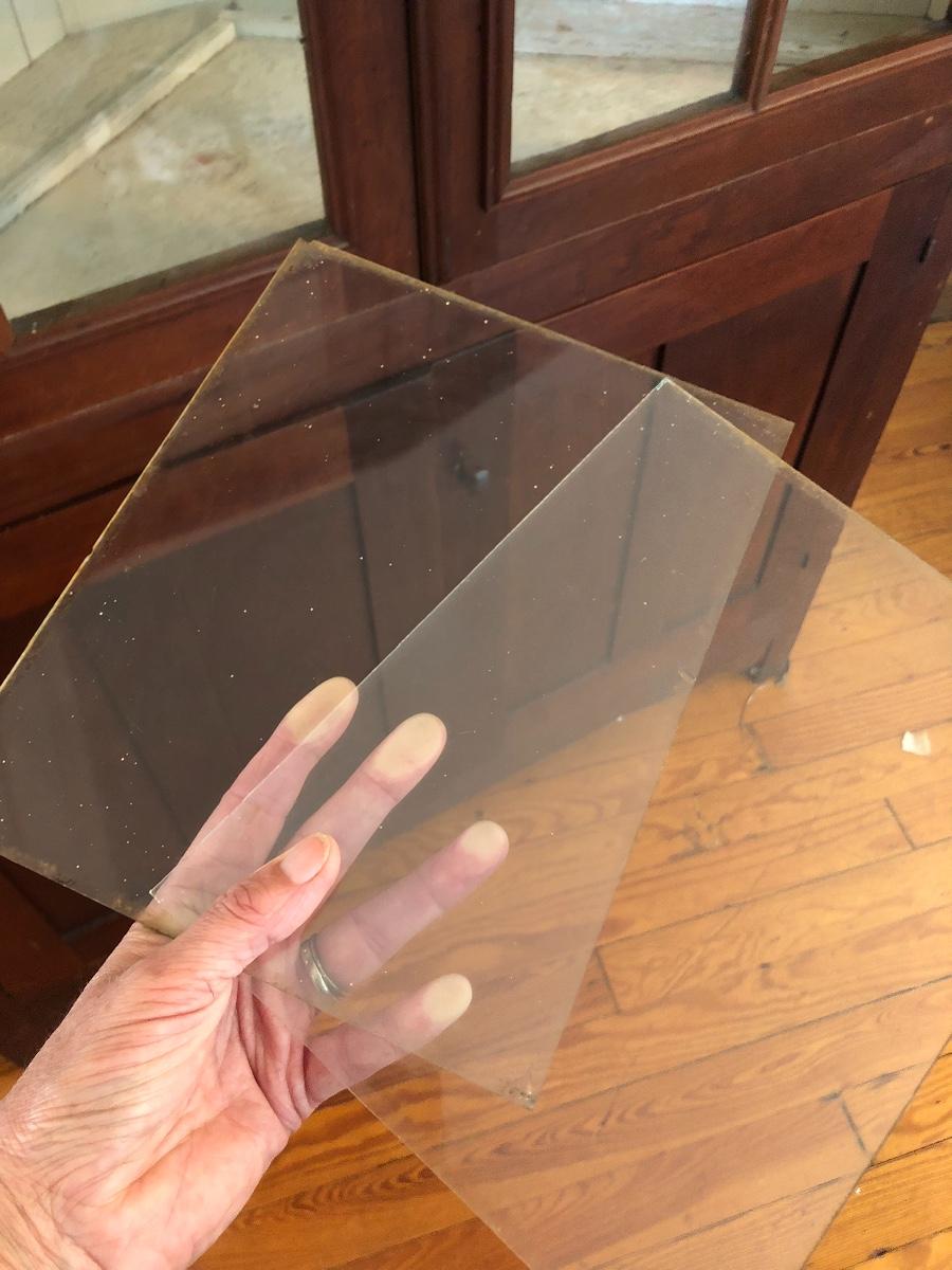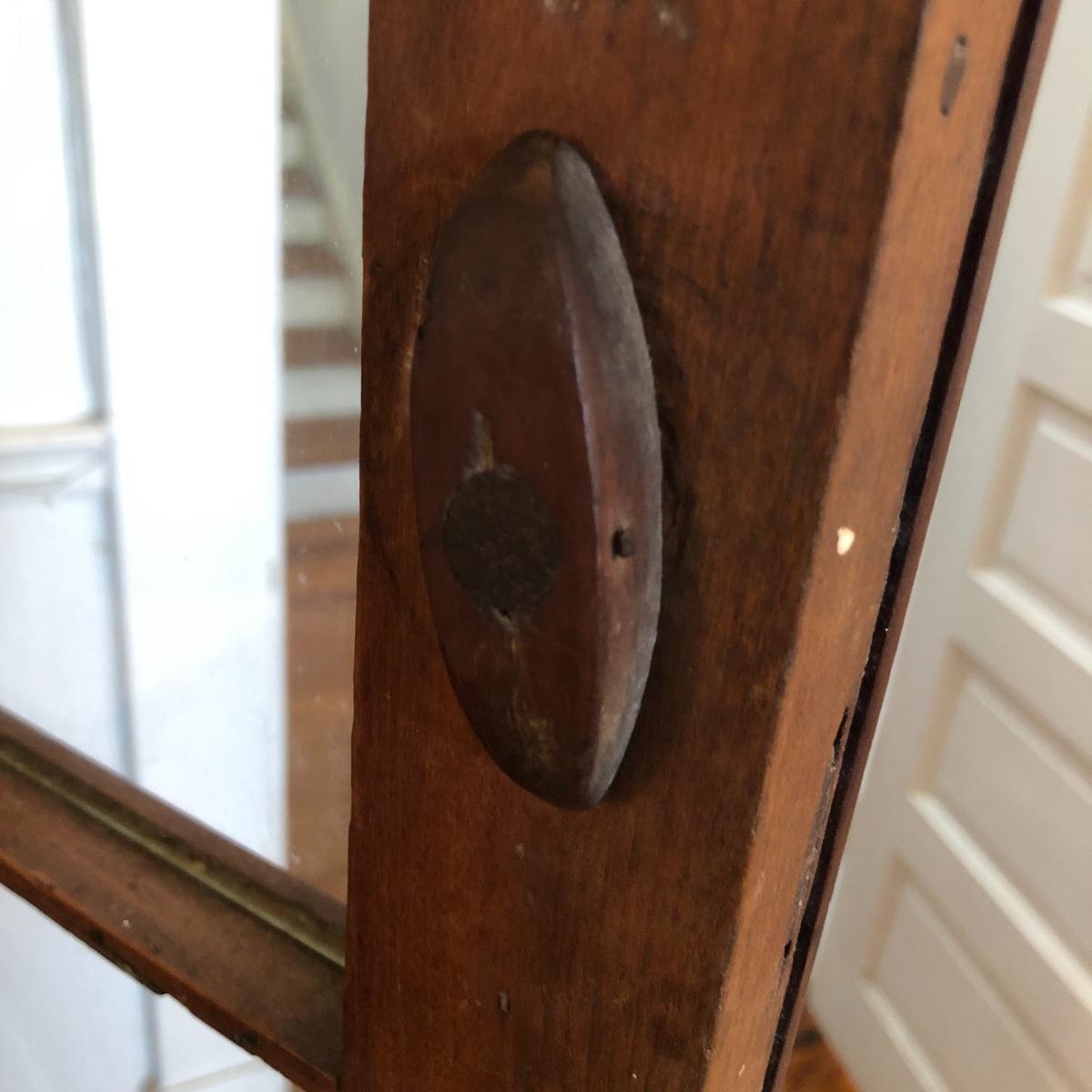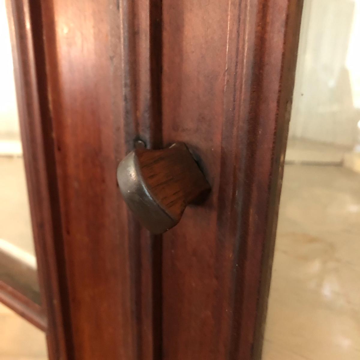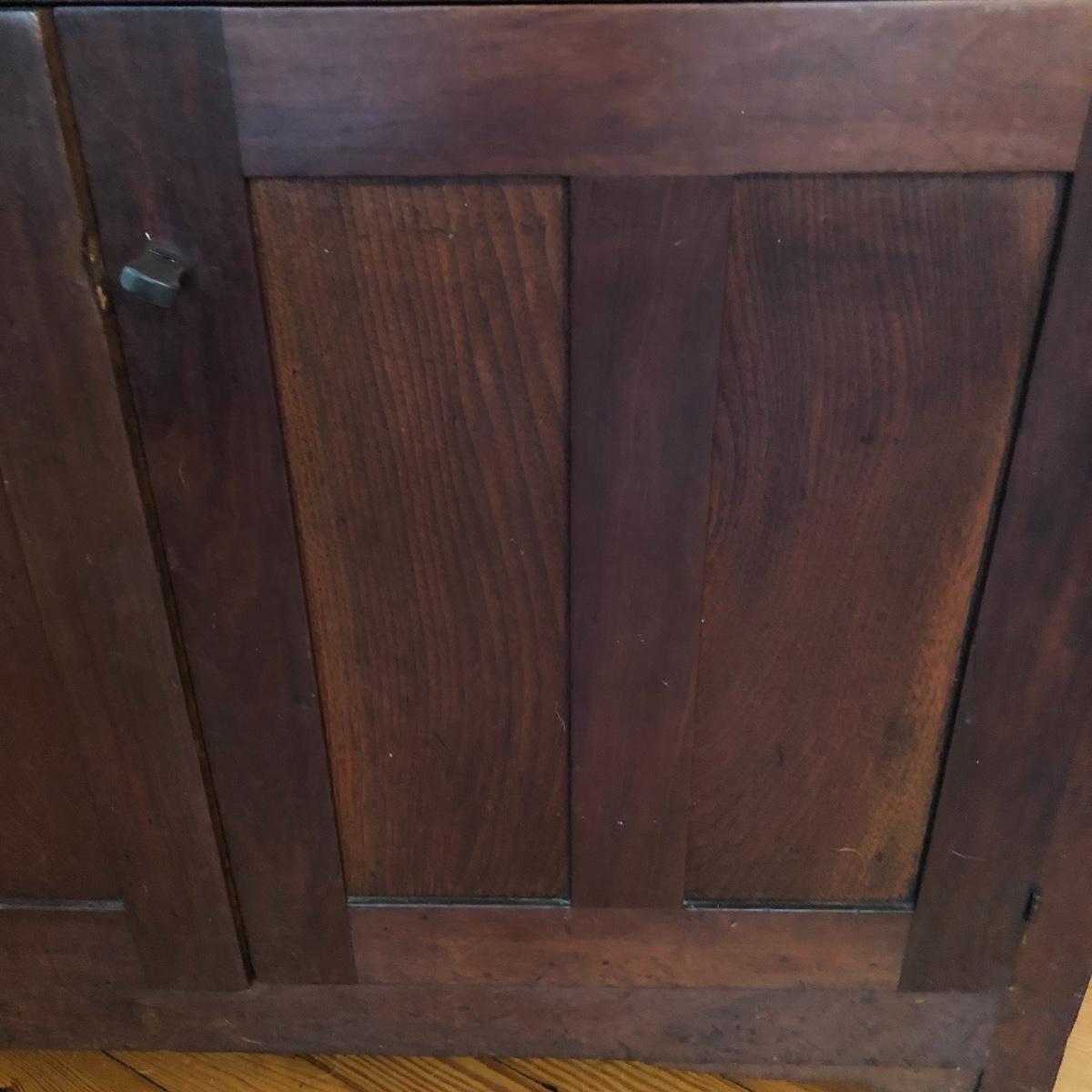 This corner cabinet is a large piece in excellent antique condition. The interior of the upper and lower cabinets has a white paint. Door latches are matching wood and two extra panes of glass that appear to be for this piece are included.