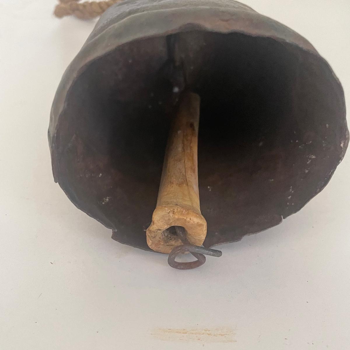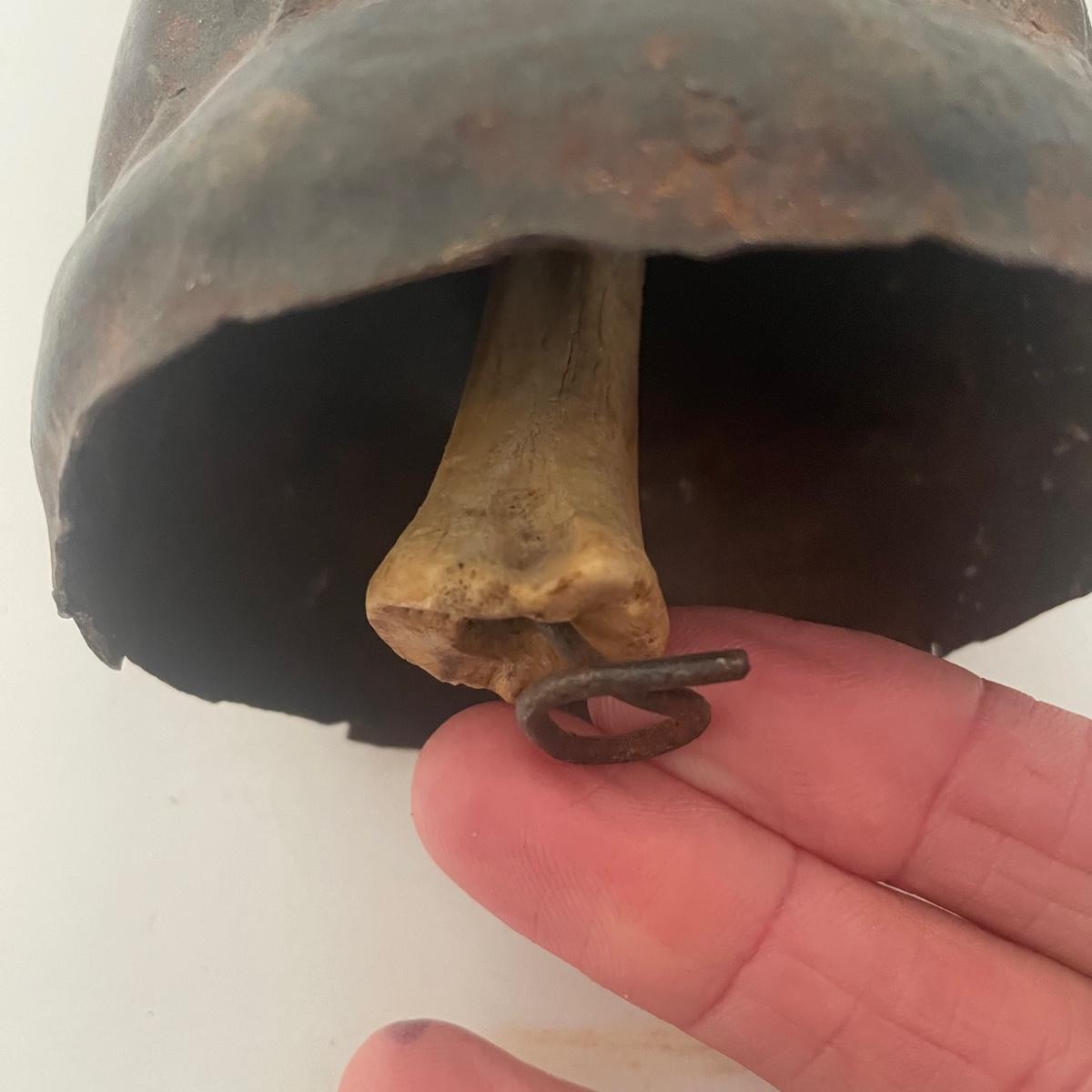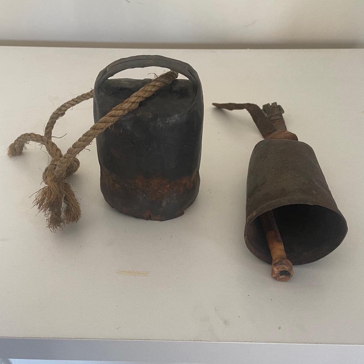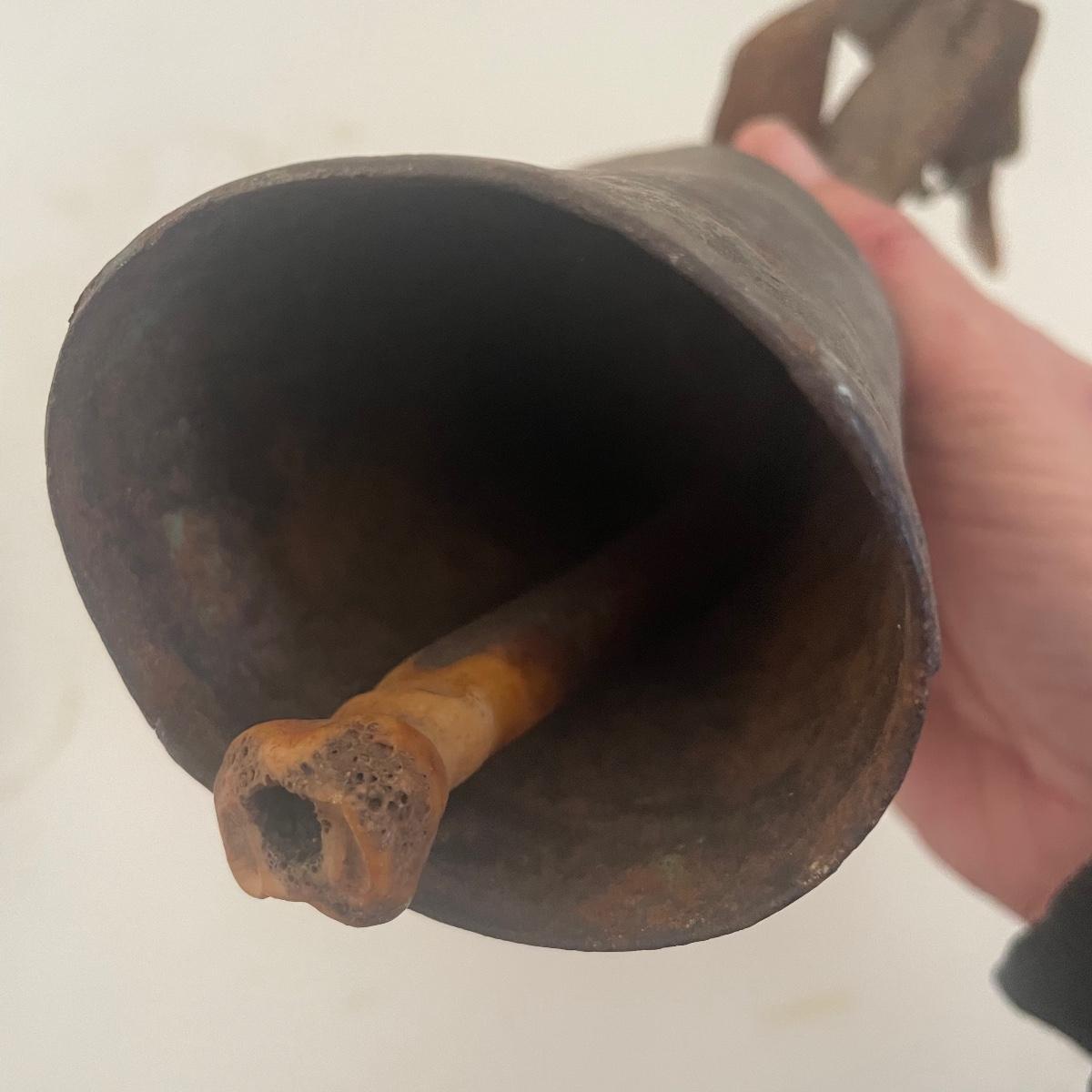 Two antique metal cowbells that both have what appears to be animal bones for their ringers. Larger bell has a rope handle, smaller bell has a leather strap and measures 2” d x 5” tall.