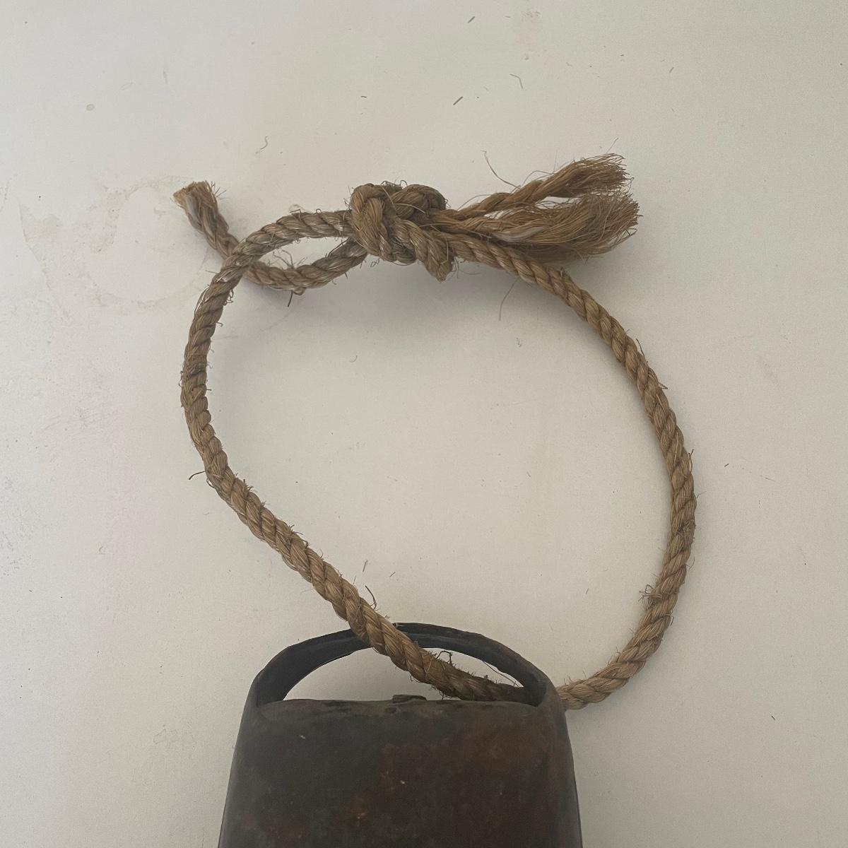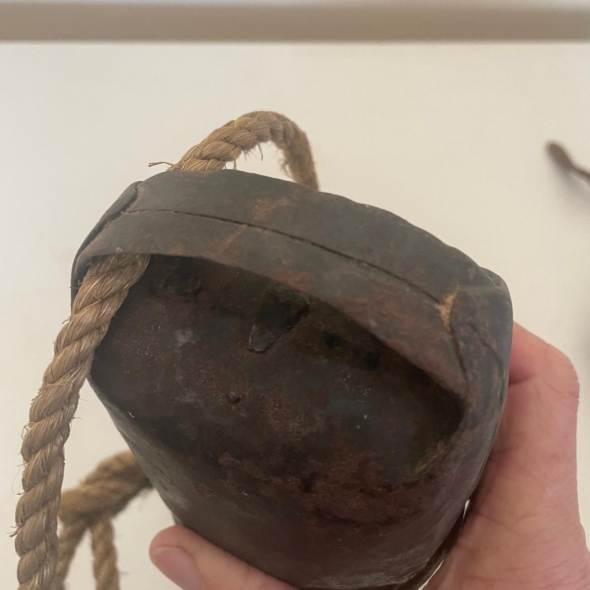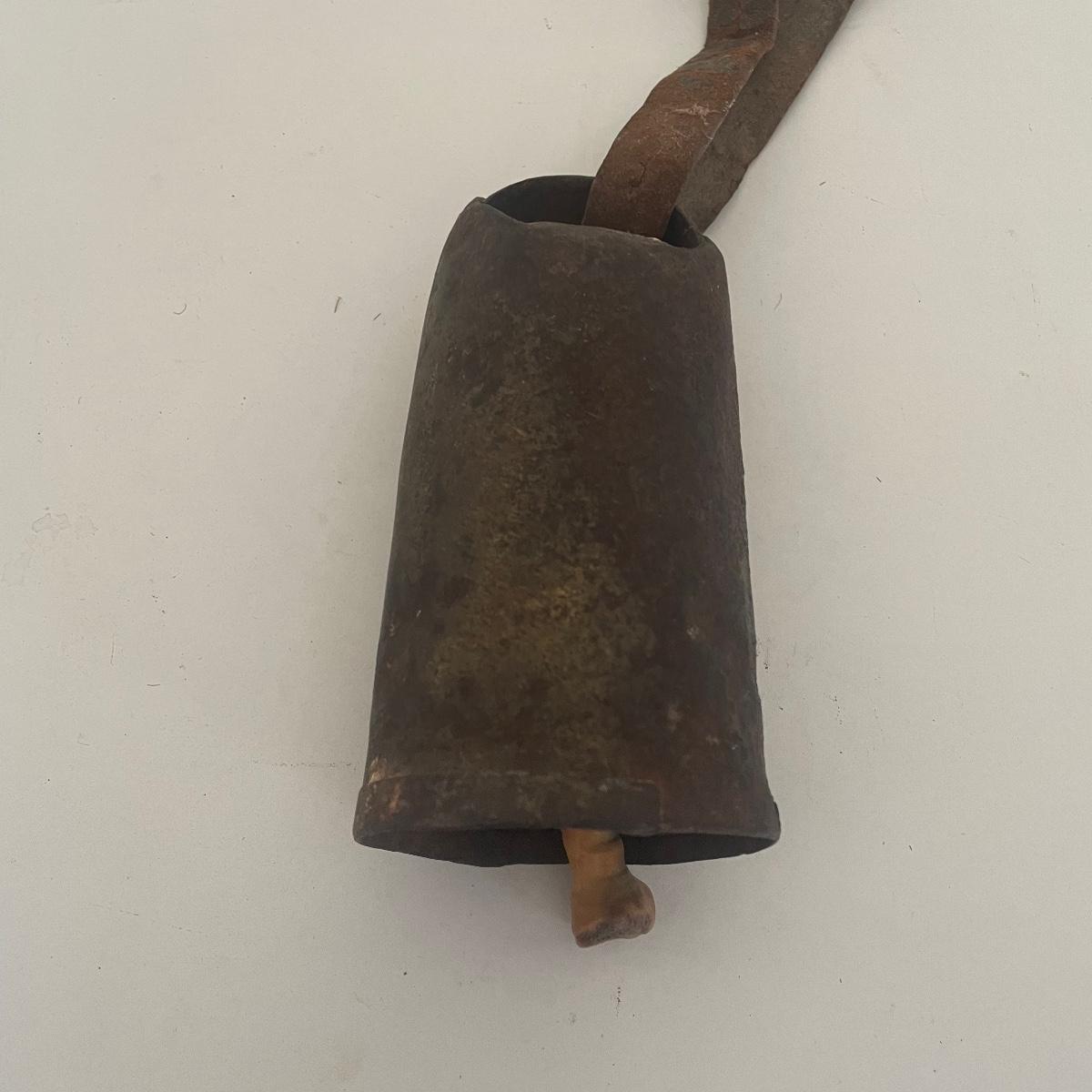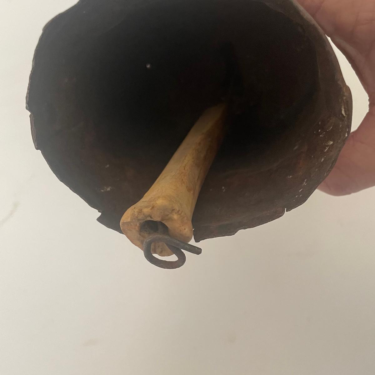 Two antique metal cowbells that both have what appears to be animal bones for their ringers. Larger bell has a rope handle, smaller bell has a leather strap and measures 2” d x 5” tall.