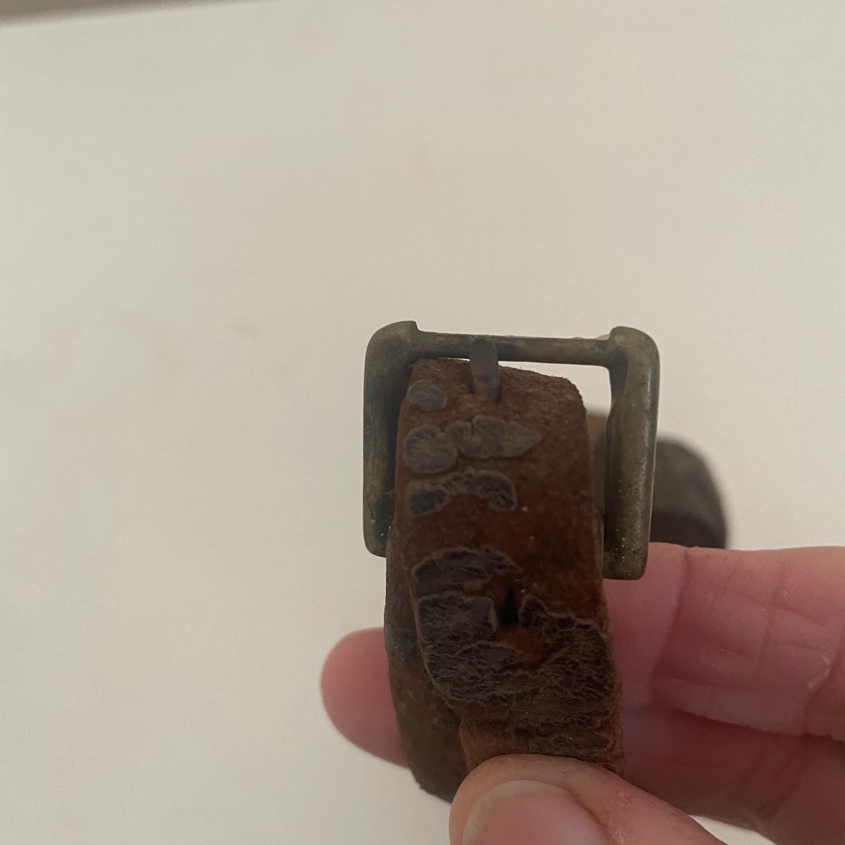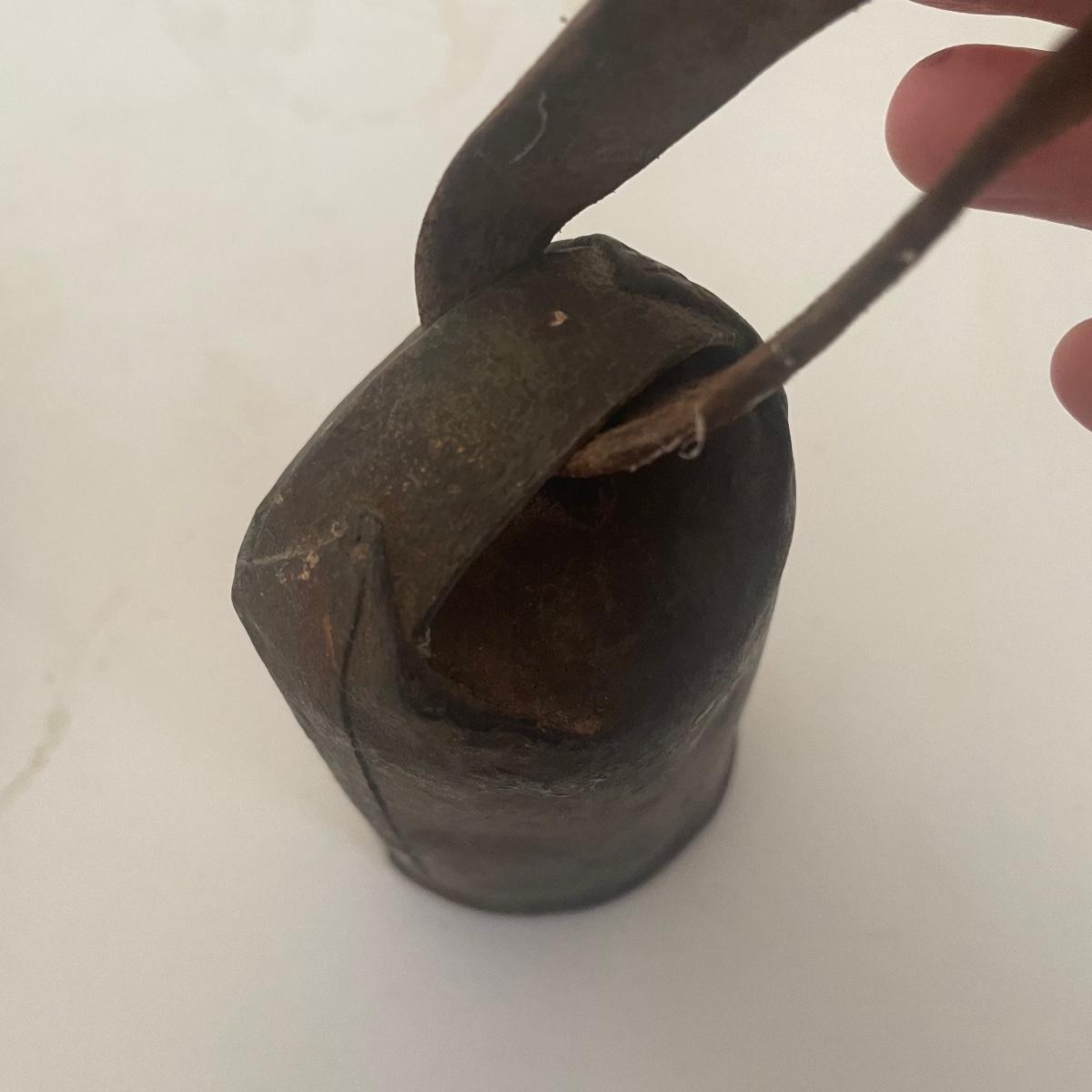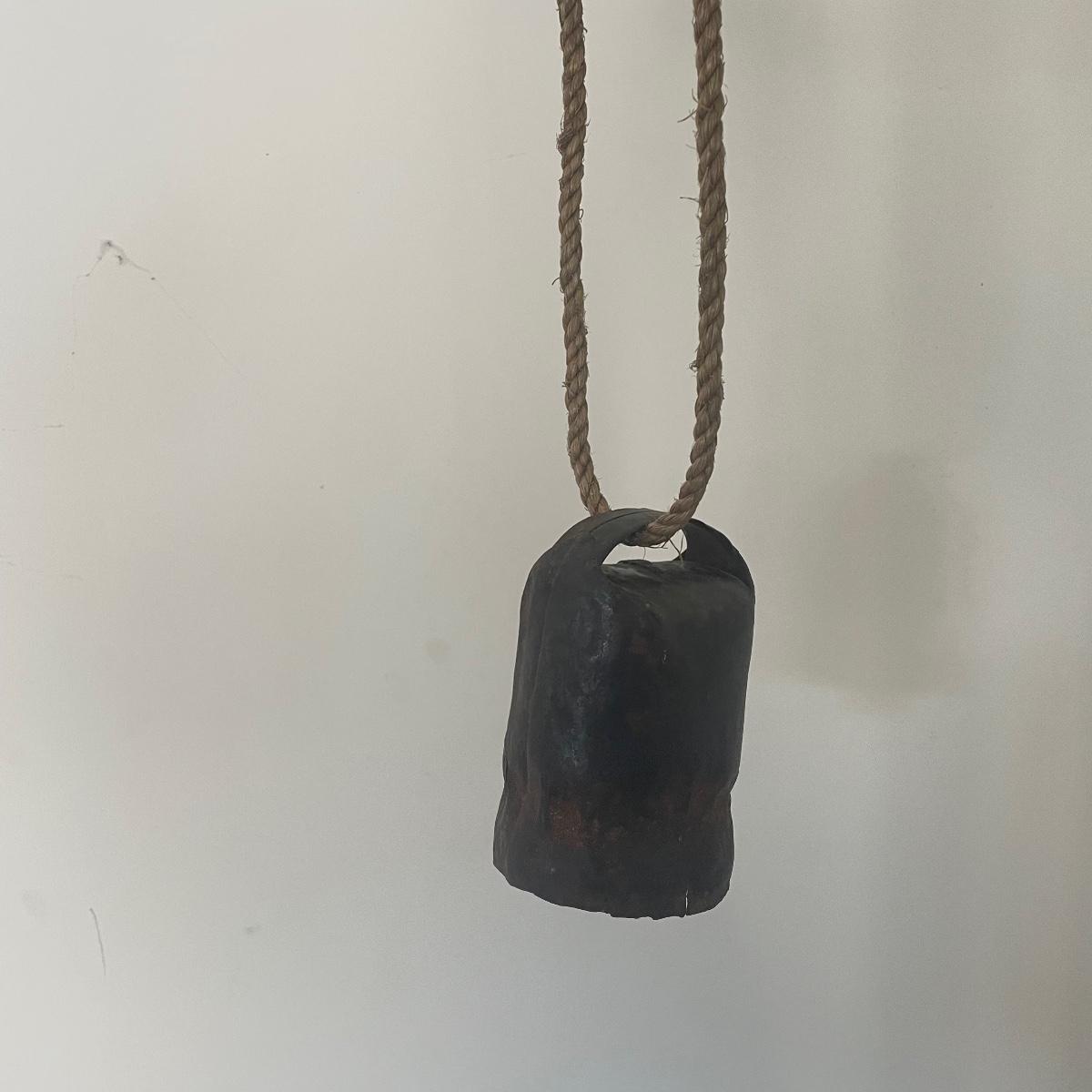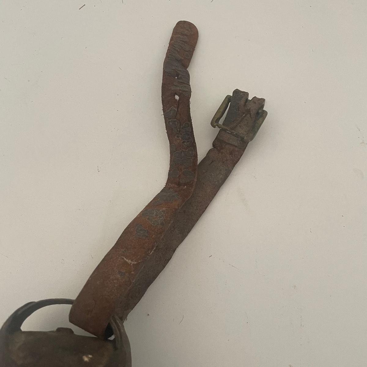 Two antique metal cowbells that both have what appears to be animal bones for their ringers. Larger bell has a rope handle, smaller bell has a leather strap and measures 2” d x 5” tall.