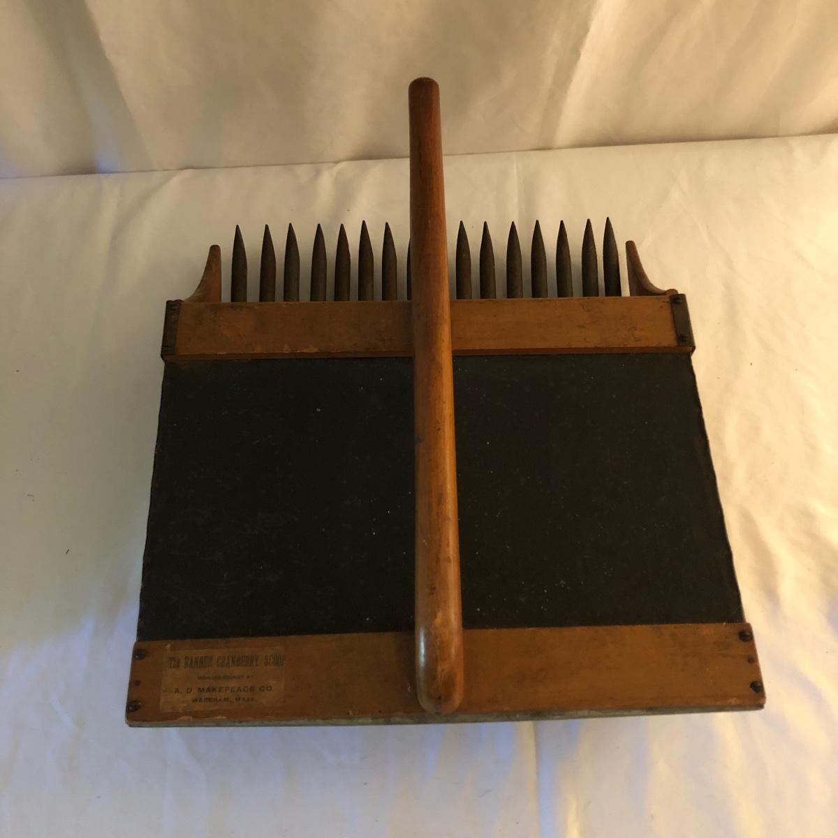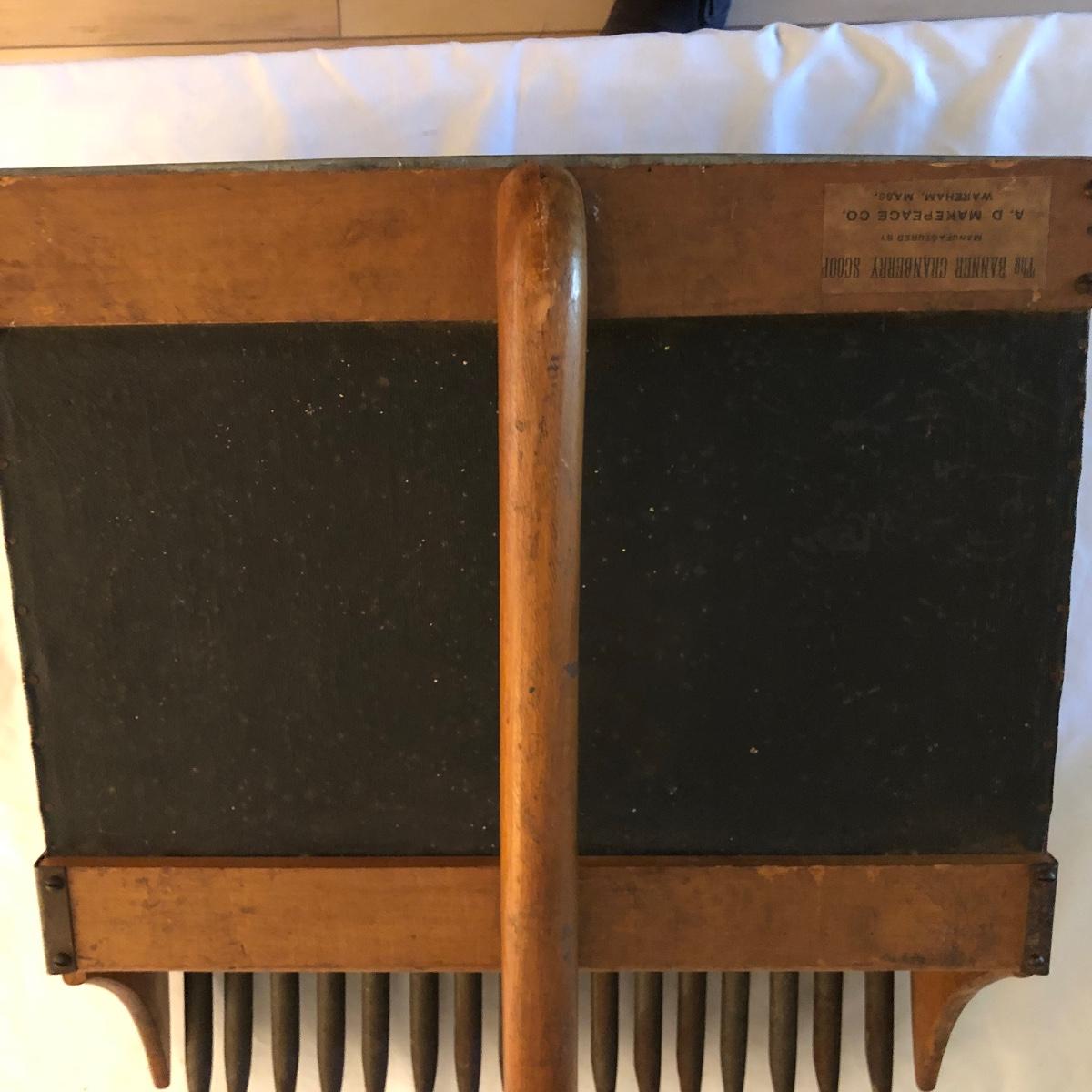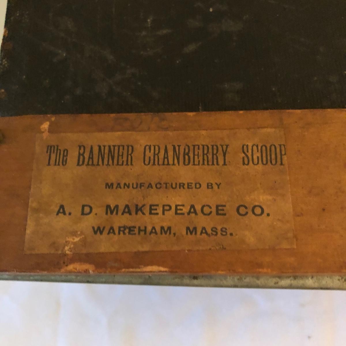 Lot includes The Banner Cranberry scoop made by A.D. Makepeace Co. scoop has wooden handle and sides with metal teeth and bottom and black canvas on the top underneath handle. Scoop measures 15” x 17” x 7.5”. Great condition!