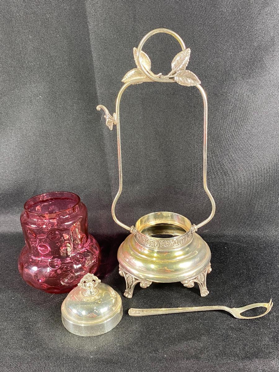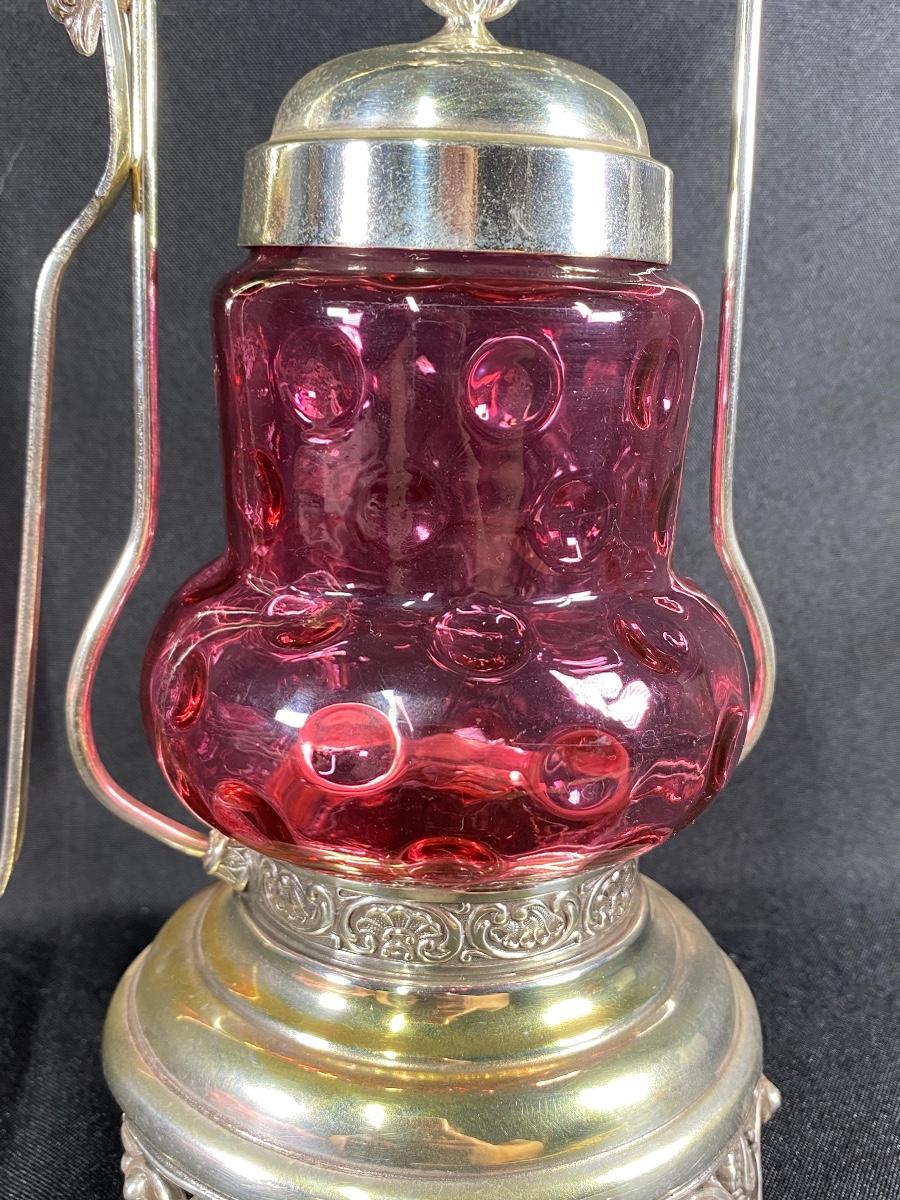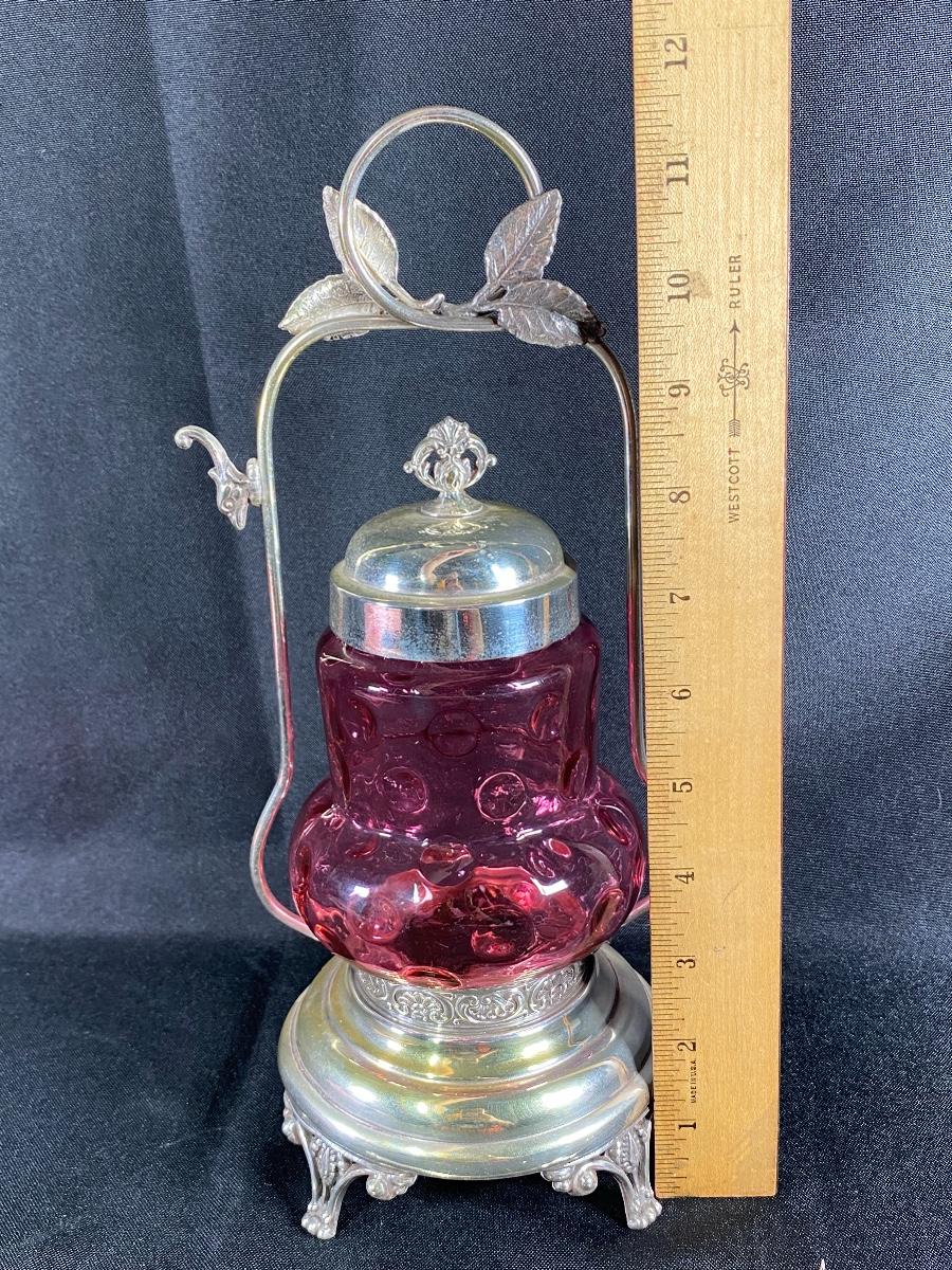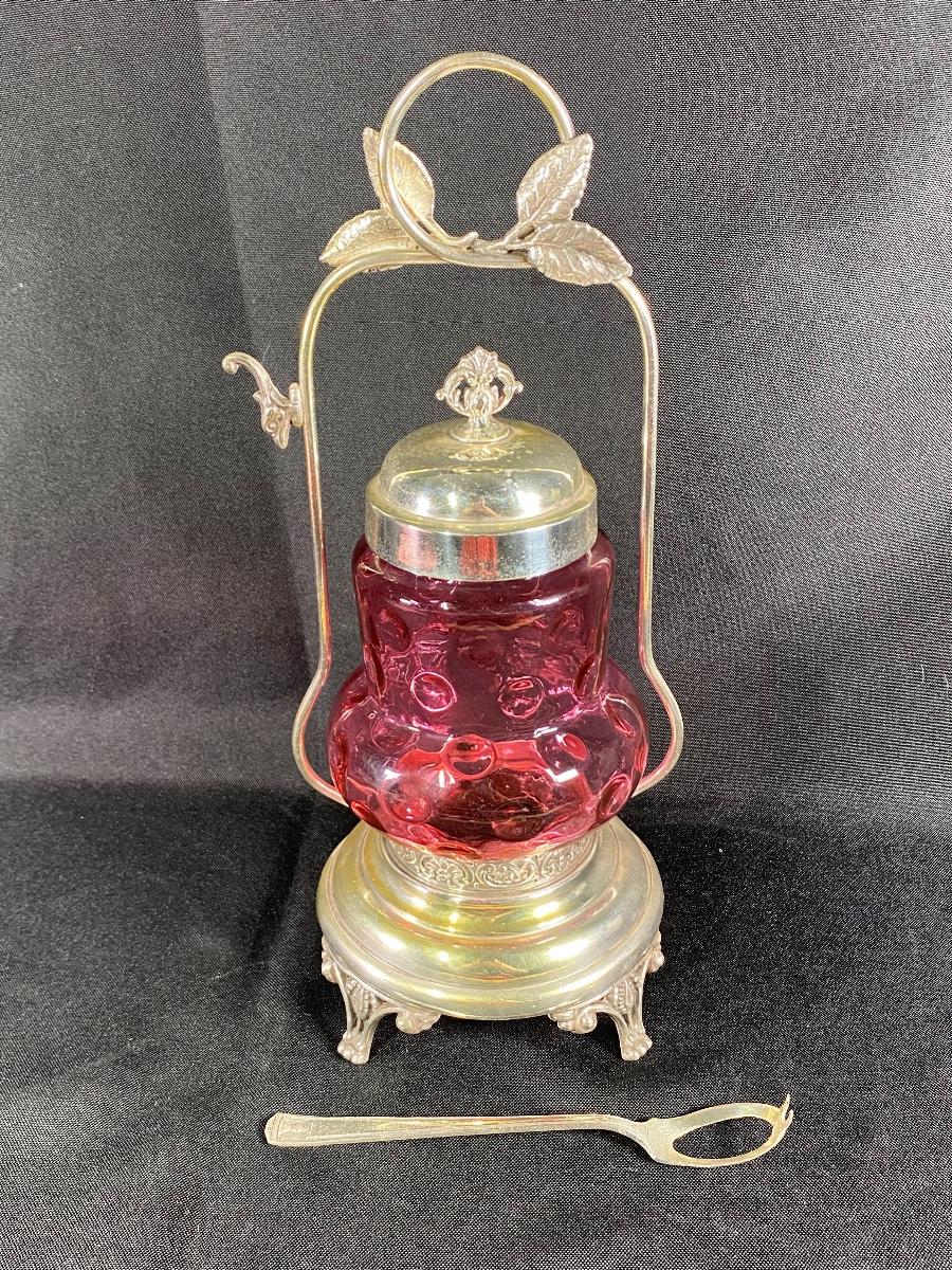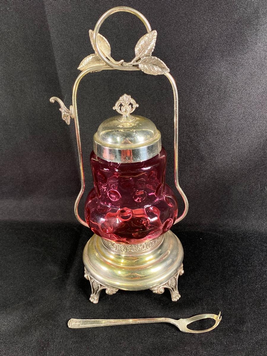 Antique olive/pickle caster jar with caddy and spoon. Beautiful thumbprint cranberry glass jar. Silver tone metal caddy, no silver markings. In great condition. Jar looks great with and without the caddy. About 12" total height.