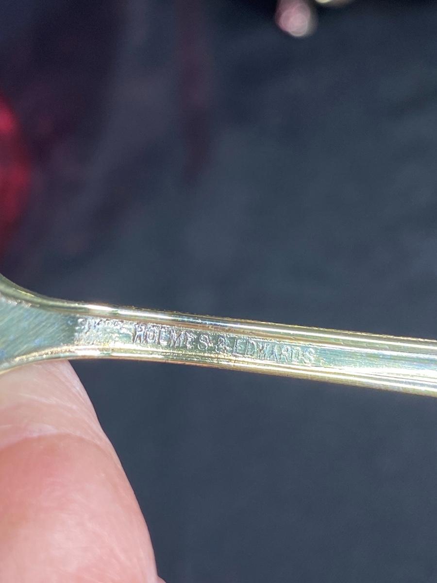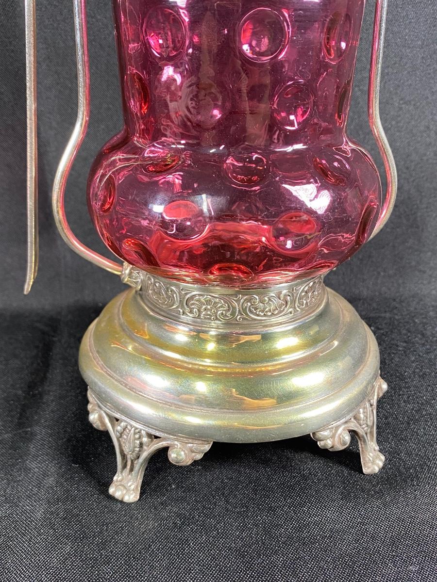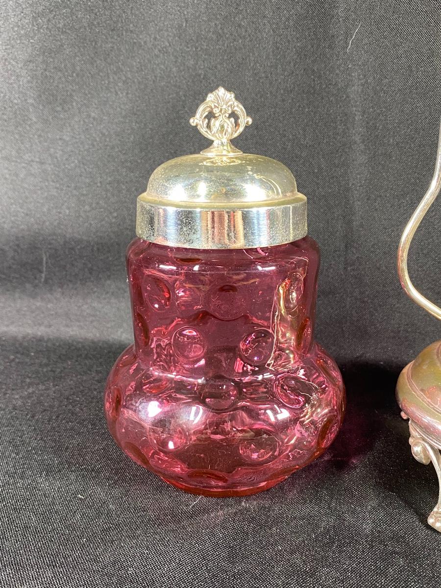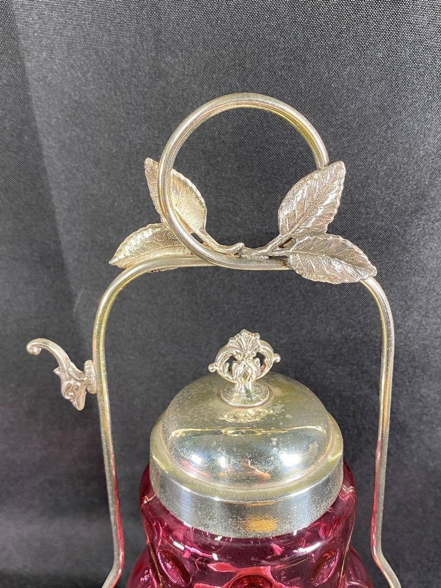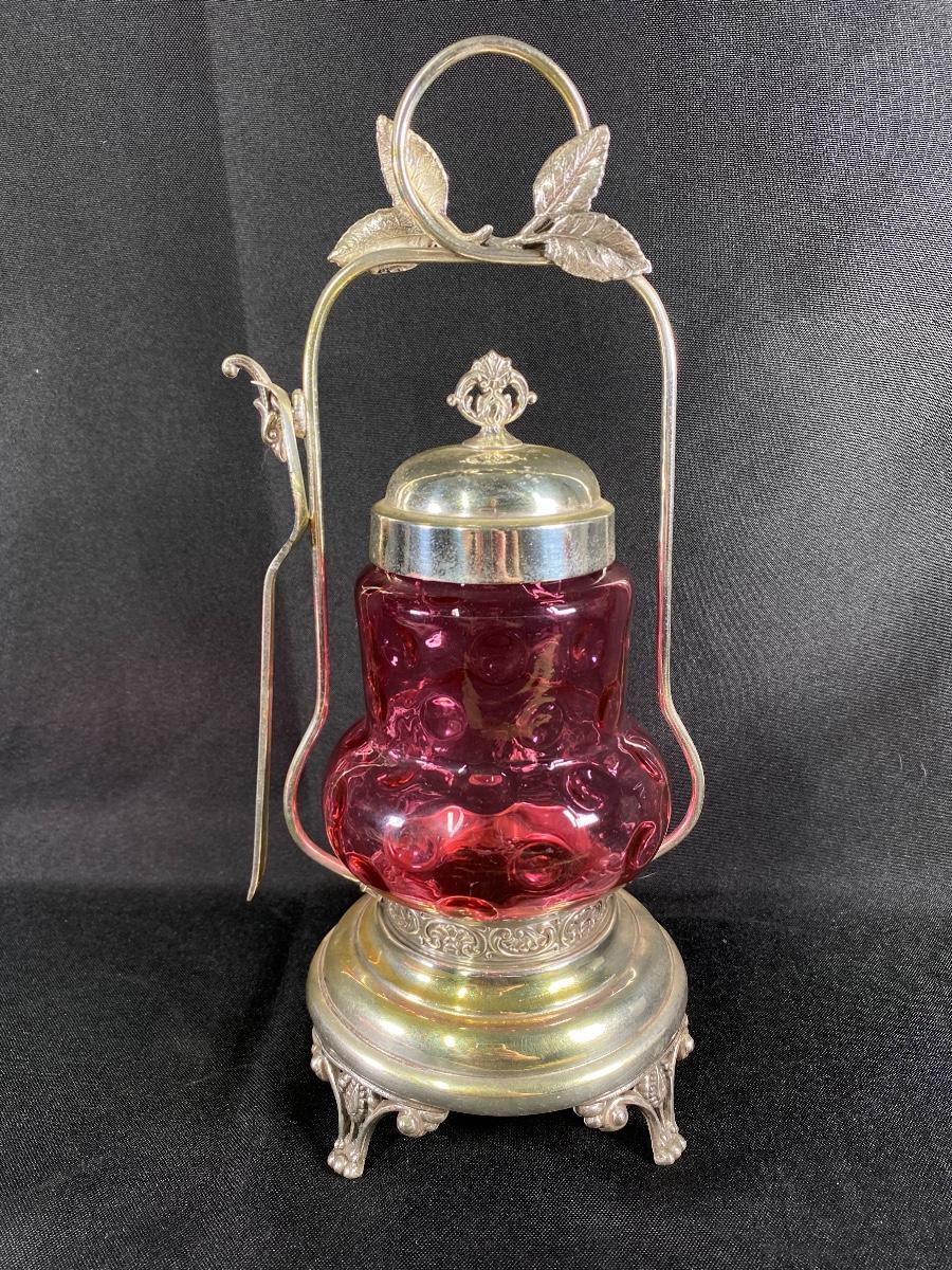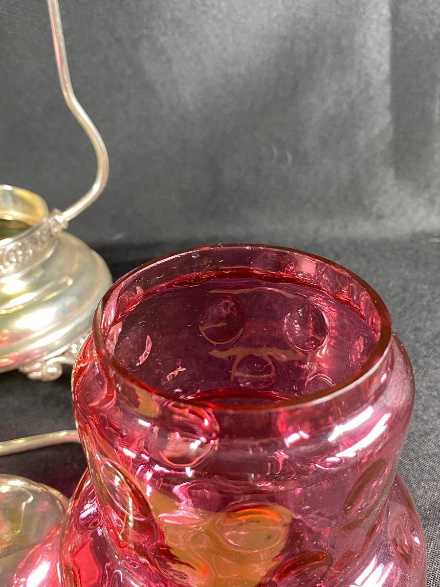 Antique olive/pickle caster jar with caddy and spoon. Beautiful thumbprint cranberry glass jar. Silver tone metal caddy, no silver markings. In great condition. Jar looks great with and without the caddy. About 12" total height.