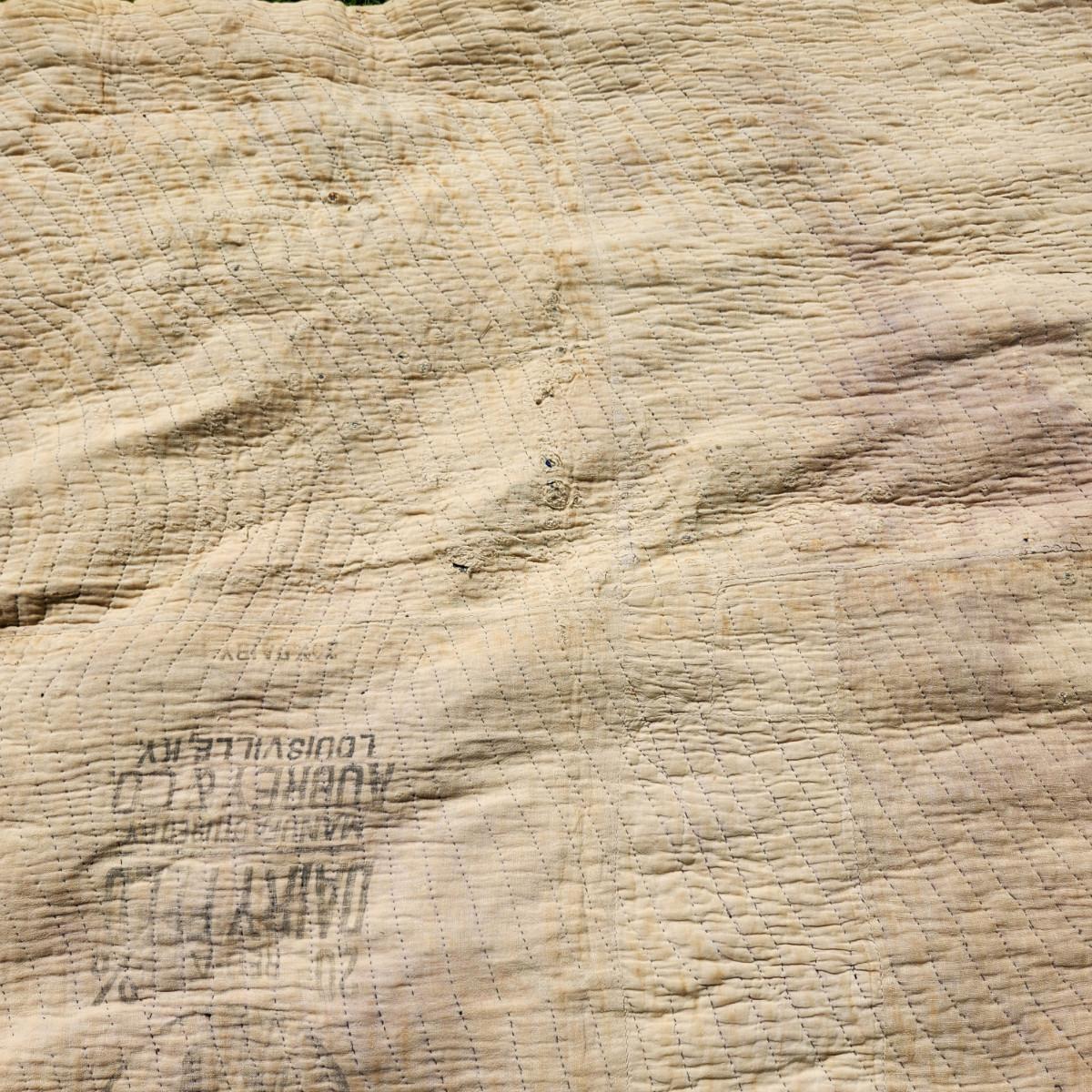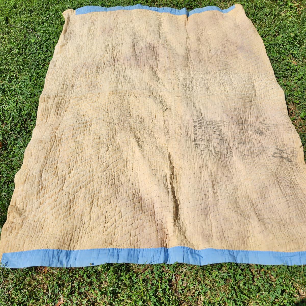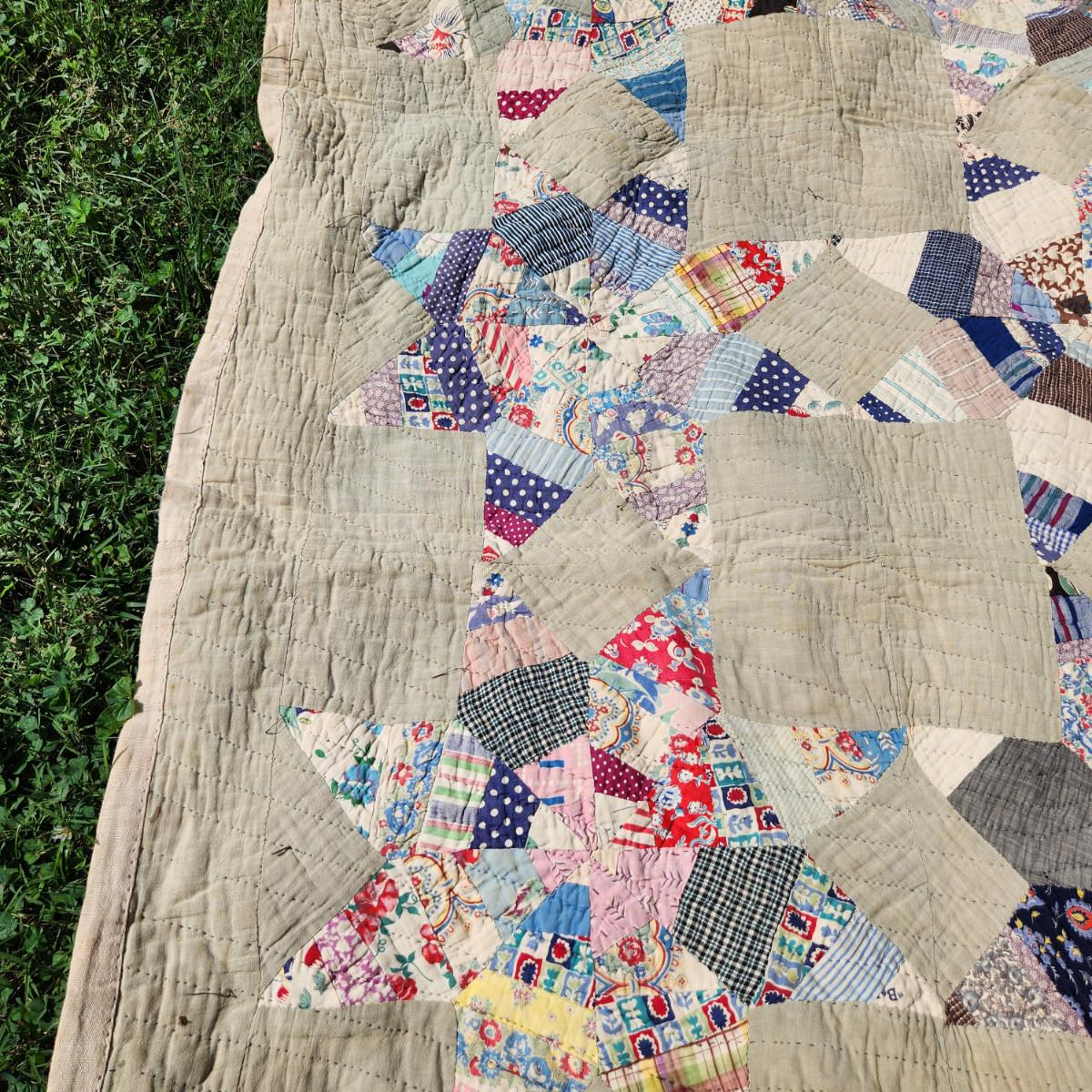 This auction lot is for an Antique Crazy Star Quilt. This quilt has been spread on a few beds but has a nice antique look and feel. The verso shows that it was backed with old feed sacks from Louisville, KY. Overall the quilt is good, the backing has a few holes. The Crazy Star pattern is worthy of a wall hanging. The quilt measures about 72X64-inches.