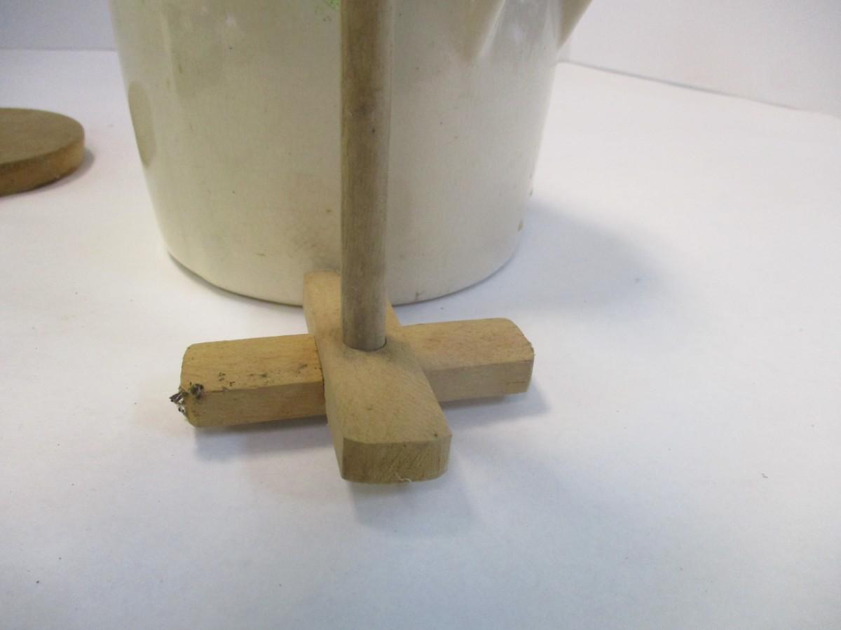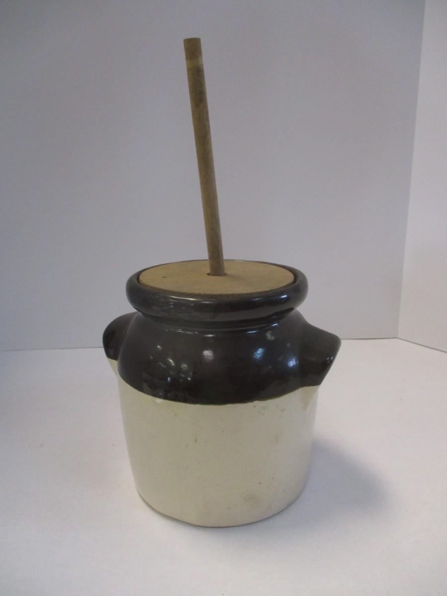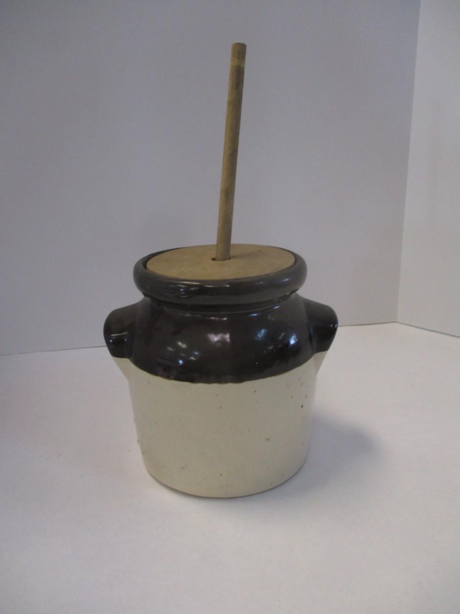 The Antique Crock Stoneware Butter Churn With Handles is a vintage kitchen equipment piece used for making butter. This stoneware crock features handles for easy lifting and transport, adding to its functionality and charm. Perfect for those who appreciate primitives and antiques, this butter churn is a unique and decorative addition to any kitchen collection.