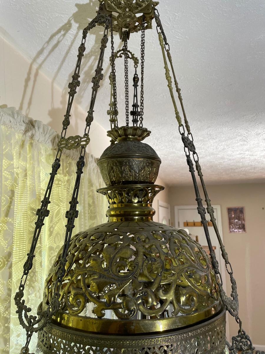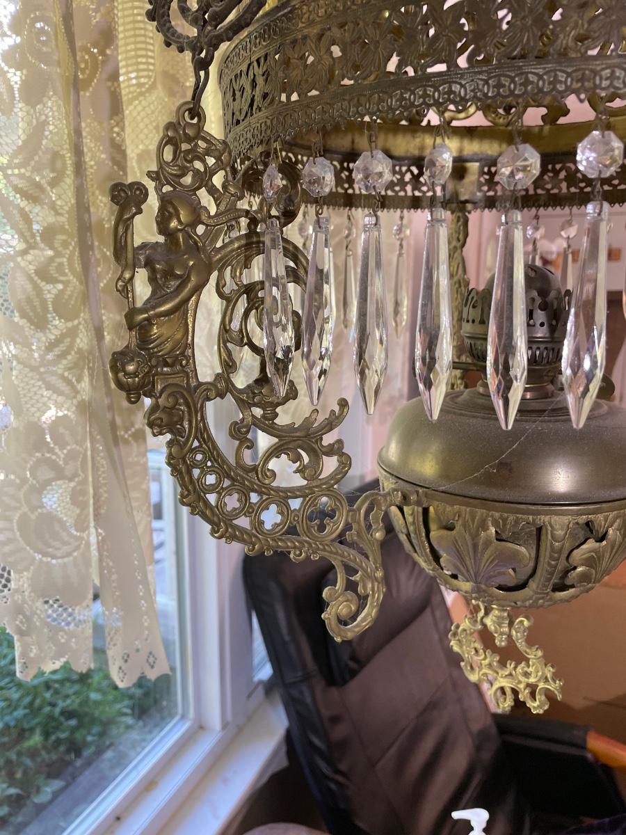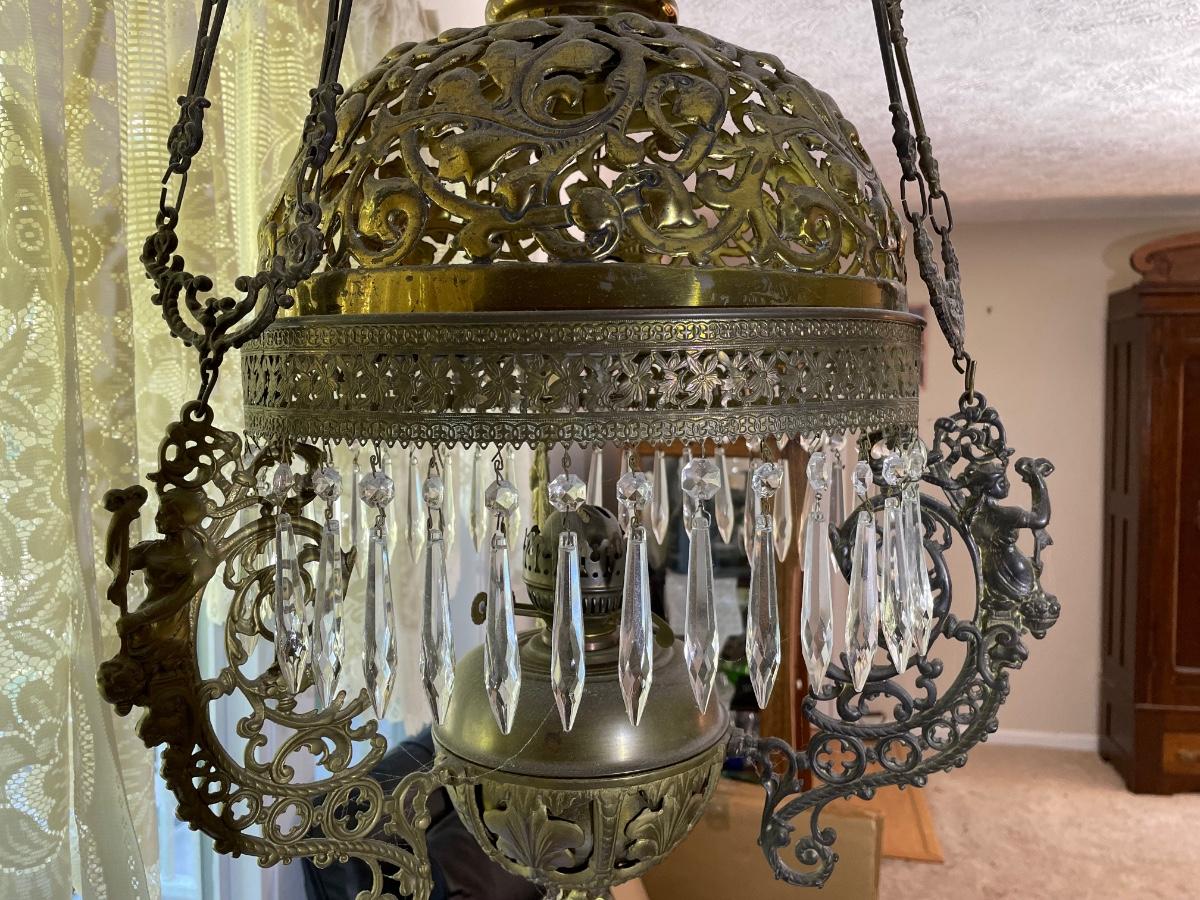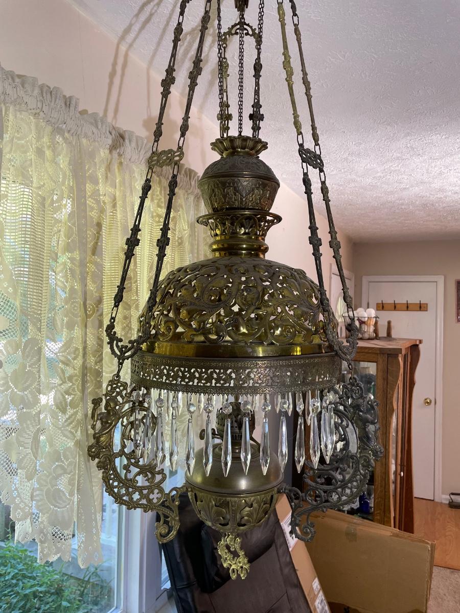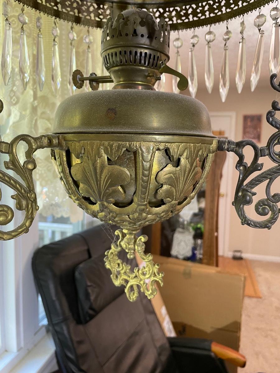 Antique Crystal and Brass Oil Lamp. Very Rare! Metal appears to be brass or bronze. Measures 42 inches high and is 17" inches in diameter. Item is in excellent condition with all crystals in tact!!!