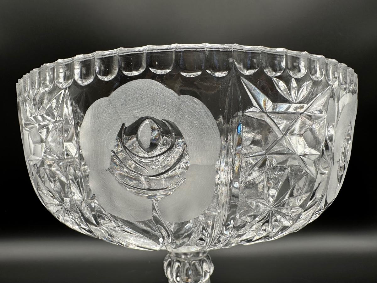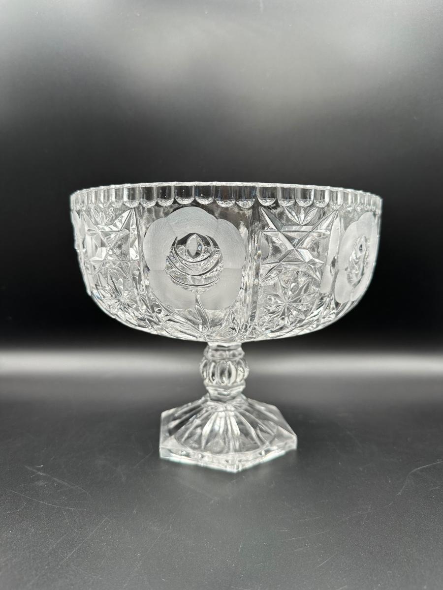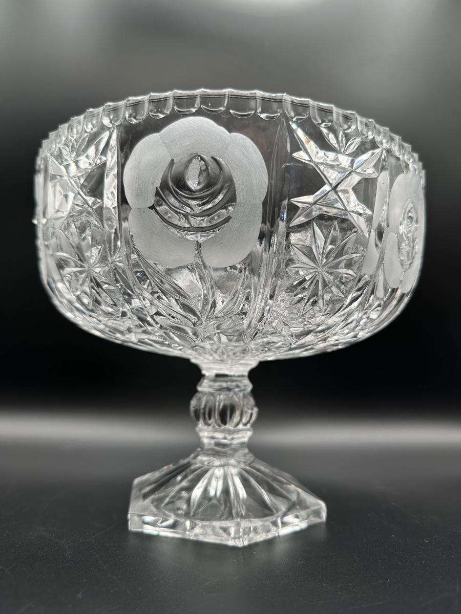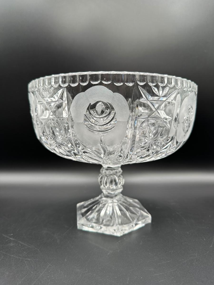 Antique Crystal Pedestal Compote Etched Roses and Ornate Design