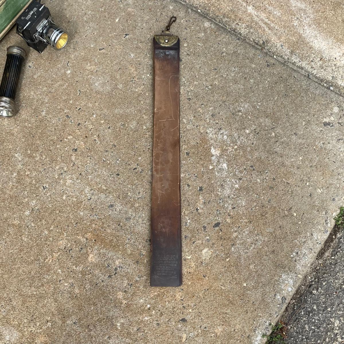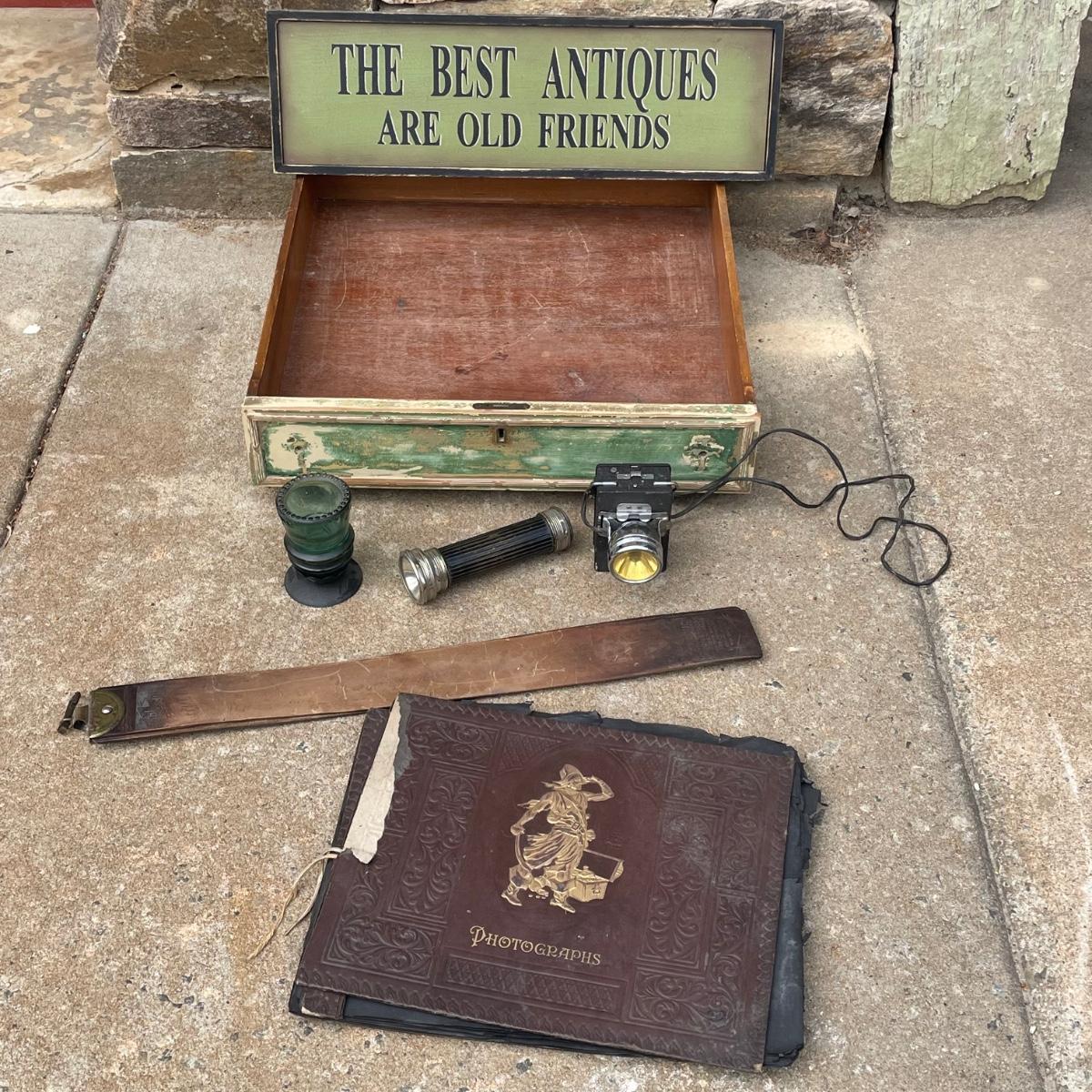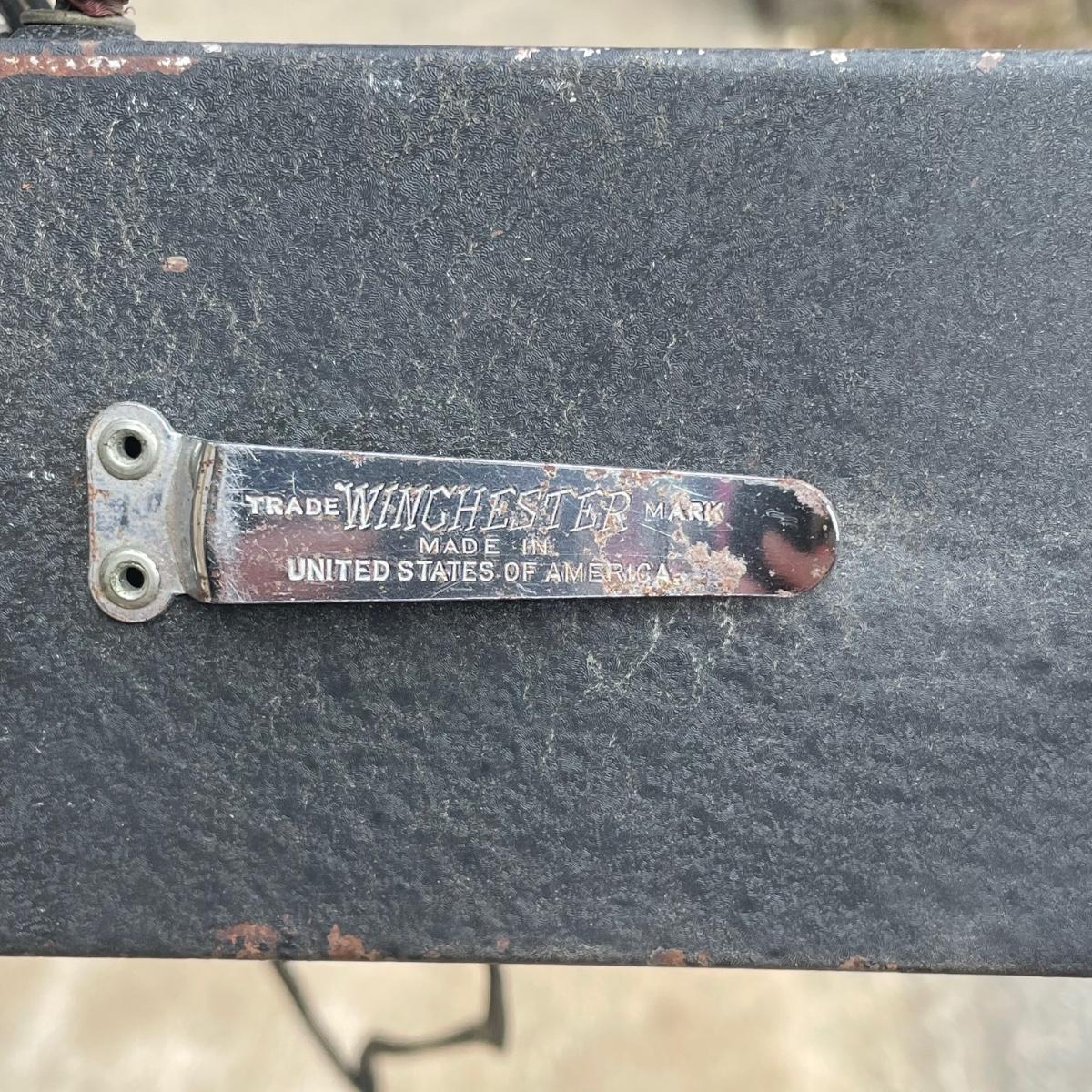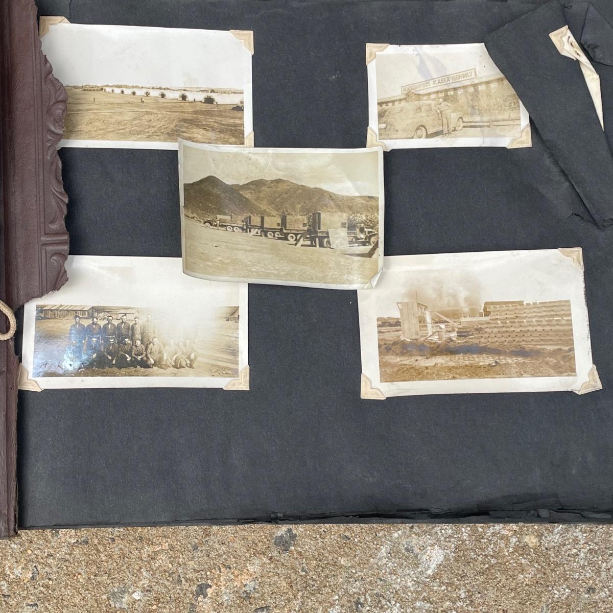 This unique lot has a very old photo album with photos that we are told are of workers who toiled on the Alaskan Highway (album isn’t full with 11 pages full). Also included is a Winchester and an Eclipse flashlight and the interesting looking leather with brass straps is a barbers strop that were for sharpening a barber razor. The glass insulator has been glued into a metal stand.