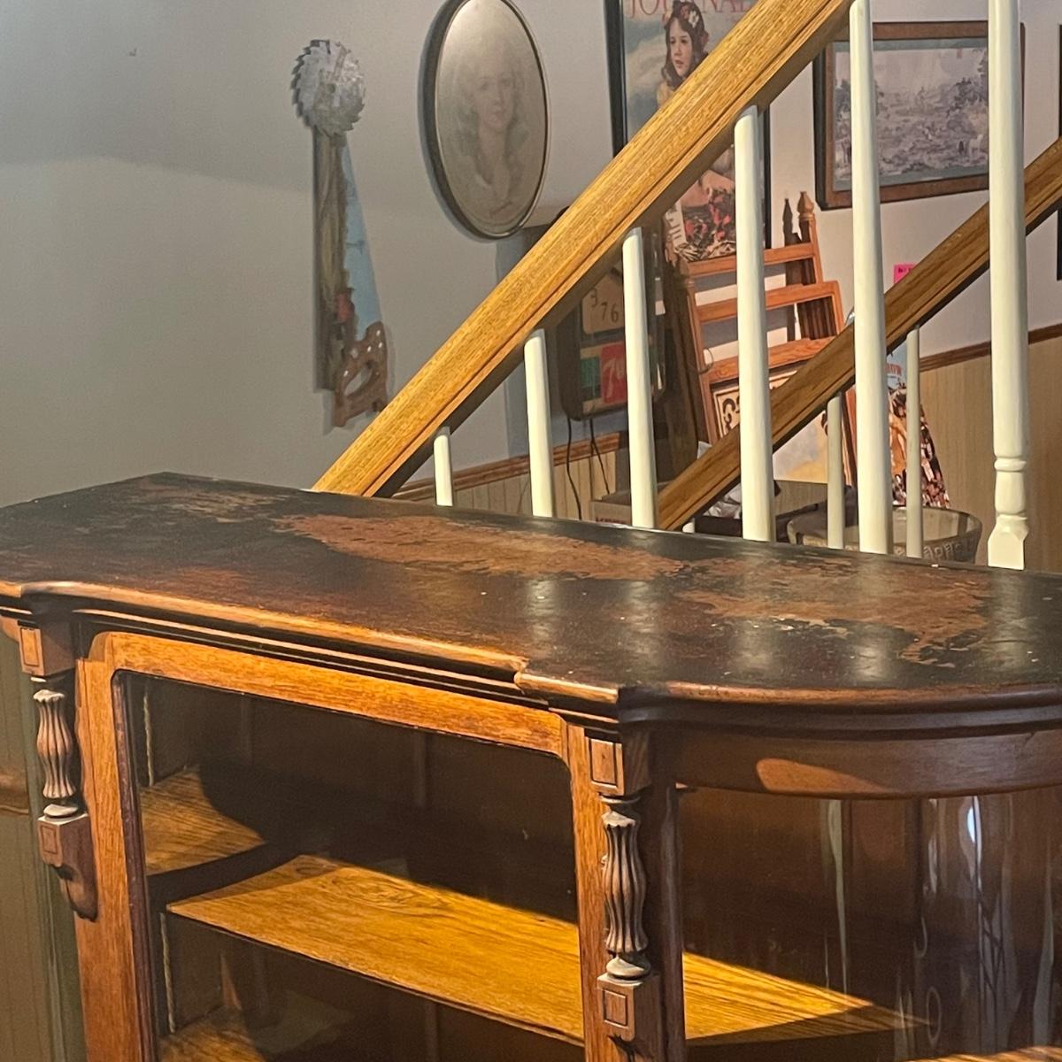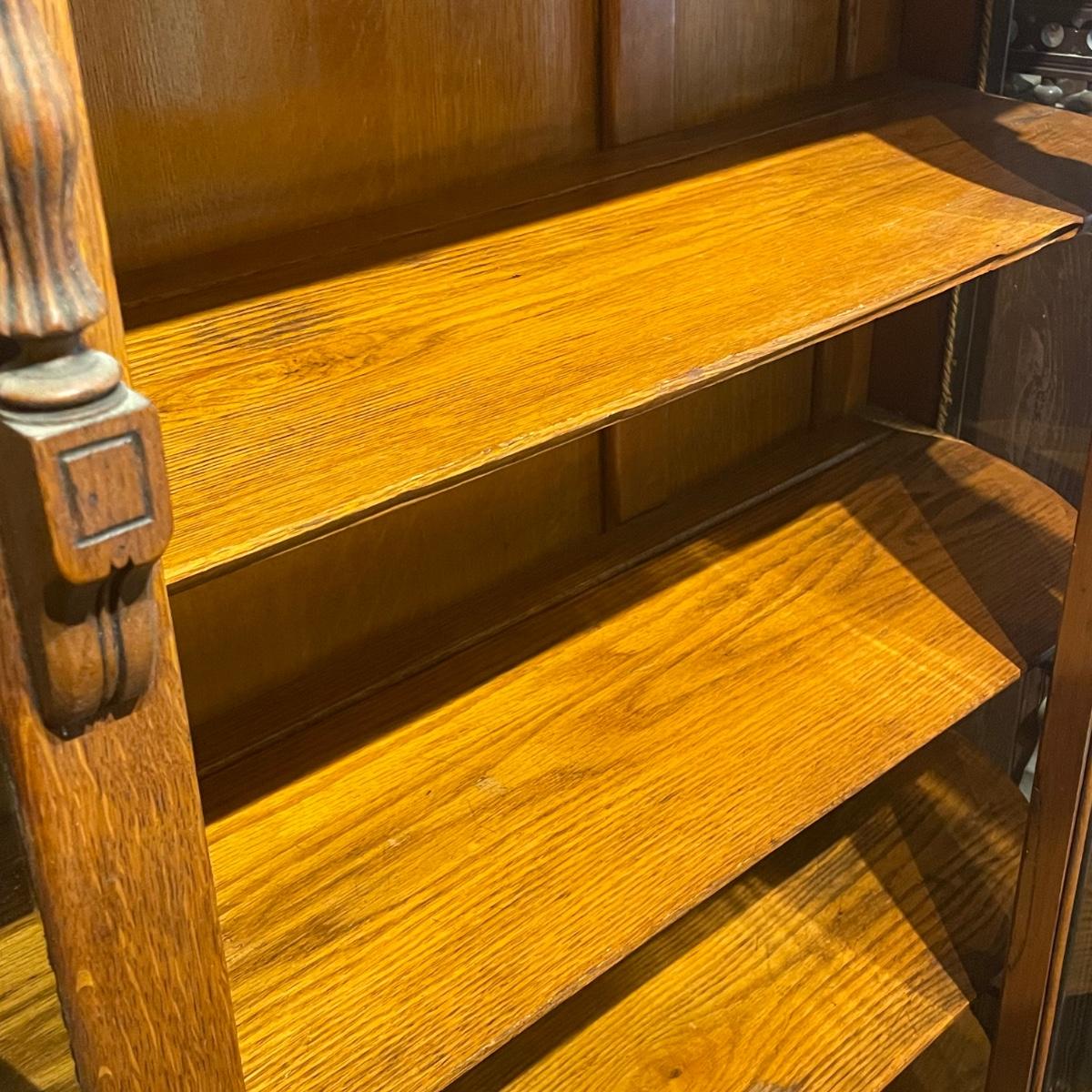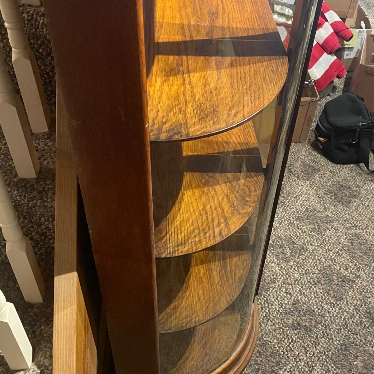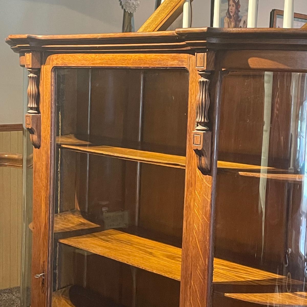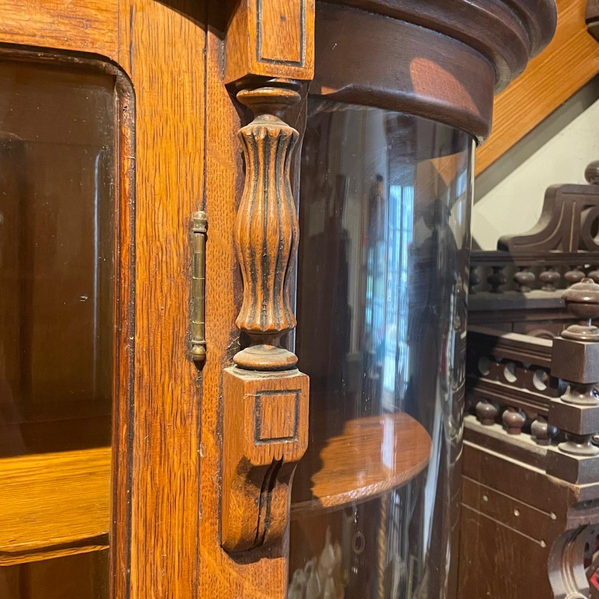 This stunning oak display cabinet has curved glass and four shelves five including the bottom (4 shelves with plate rails are removable and sit on sturdy metal hardware). The interior sides have decorative rope embellishments. It is in great antique condition; minor stain on the third shelf and a few other blemishes, see images.