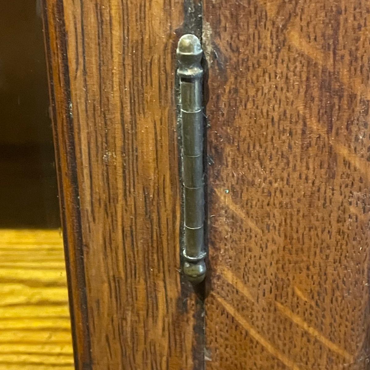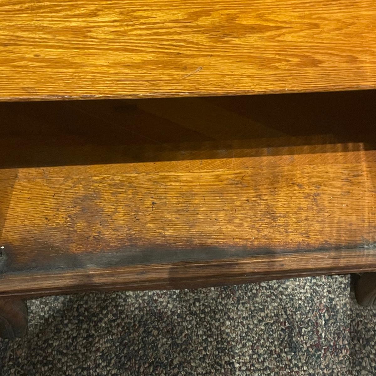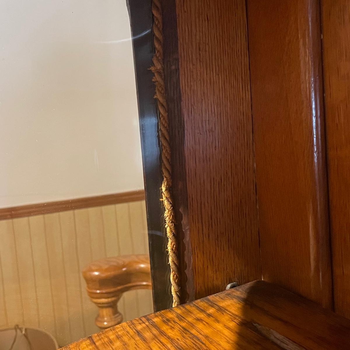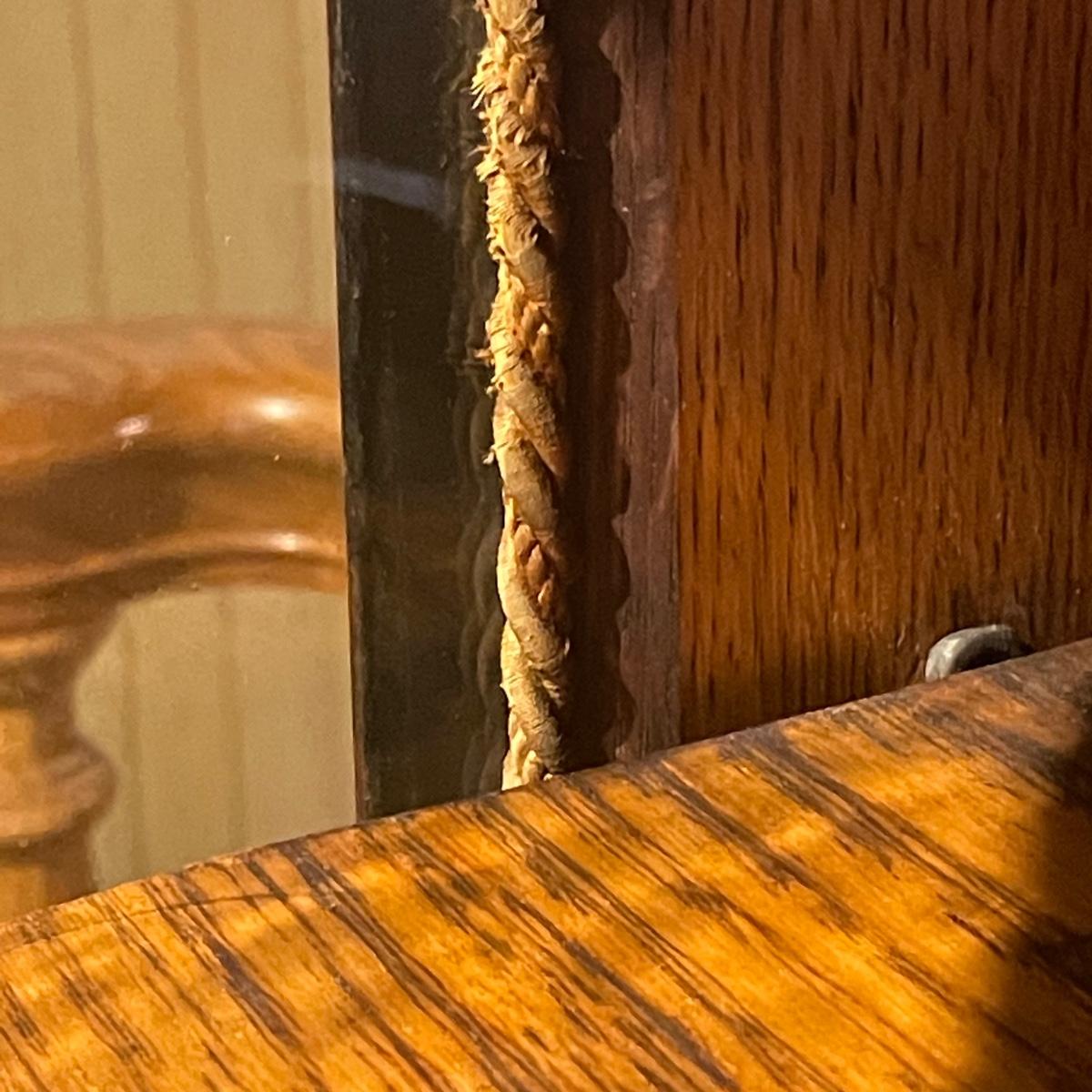 This stunning oak display cabinet has curved glass and four shelves five including the bottom (4 shelves with plate rails are removable and sit on sturdy metal hardware). The interior sides have decorative rope embellishments. It is in great antique condition; minor stain on the third shelf and a few other blemishes, see images.