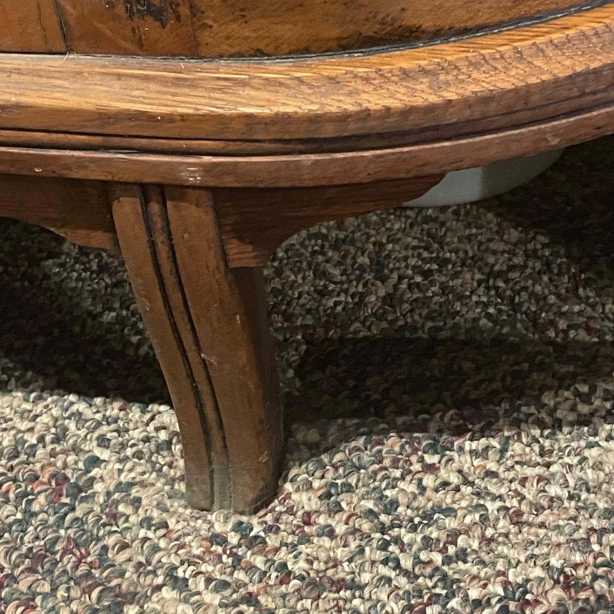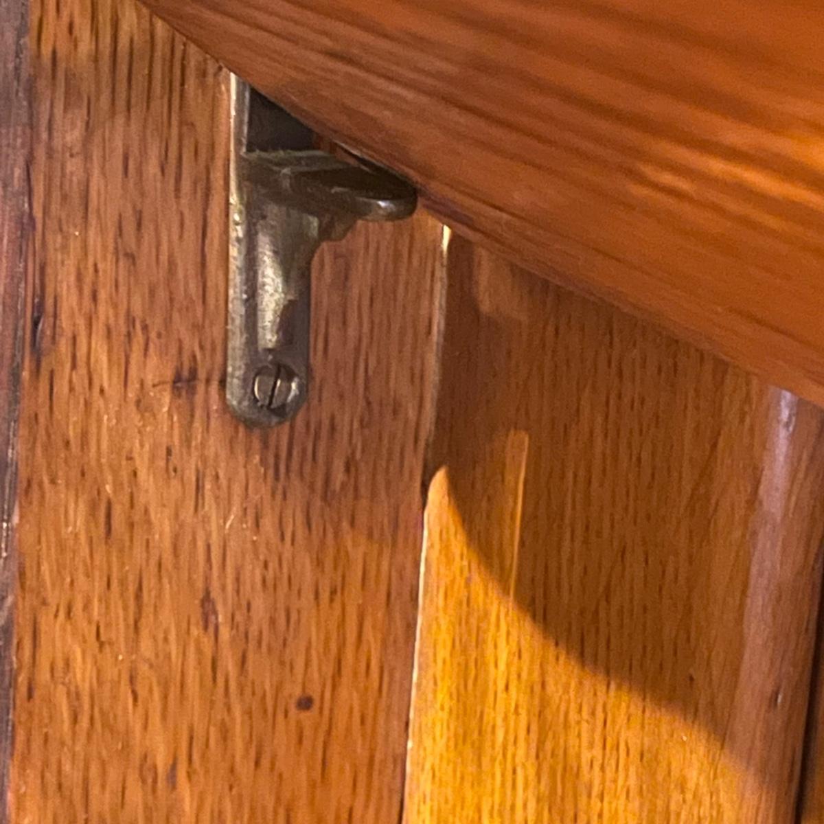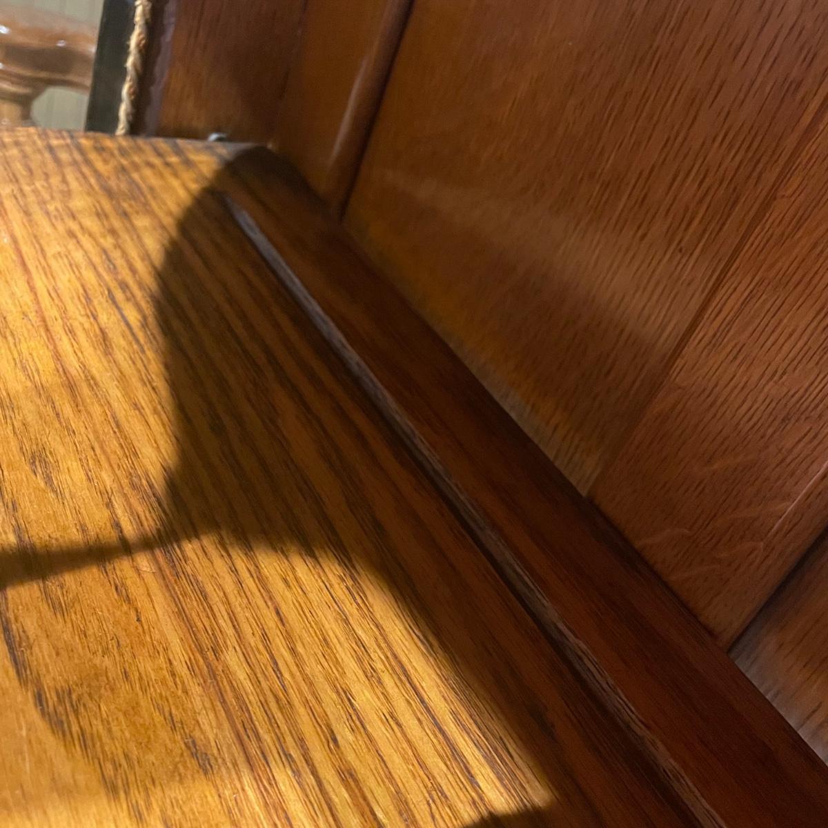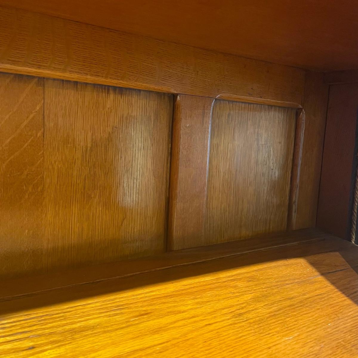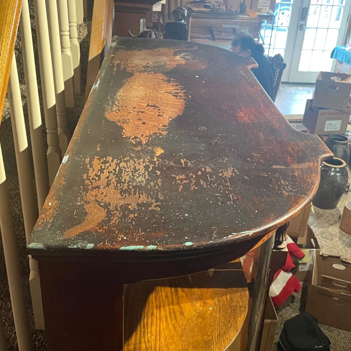 This stunning oak display cabinet has curved glass and four shelves five including the bottom (4 shelves with plate rails are removable and sit on sturdy metal hardware). The interior sides have decorative rope embellishments. It is in great antique condition; minor stain on the third shelf and a few other blemishes, see images.