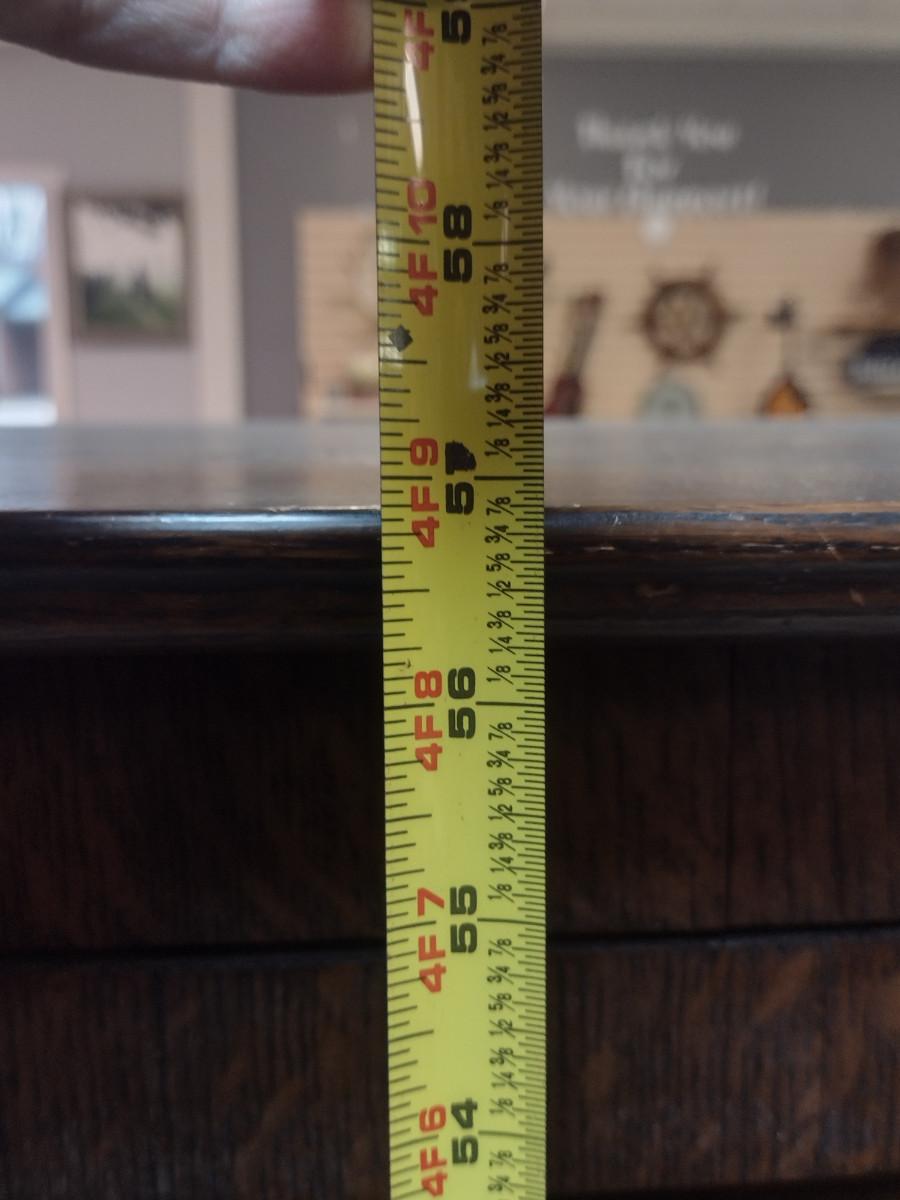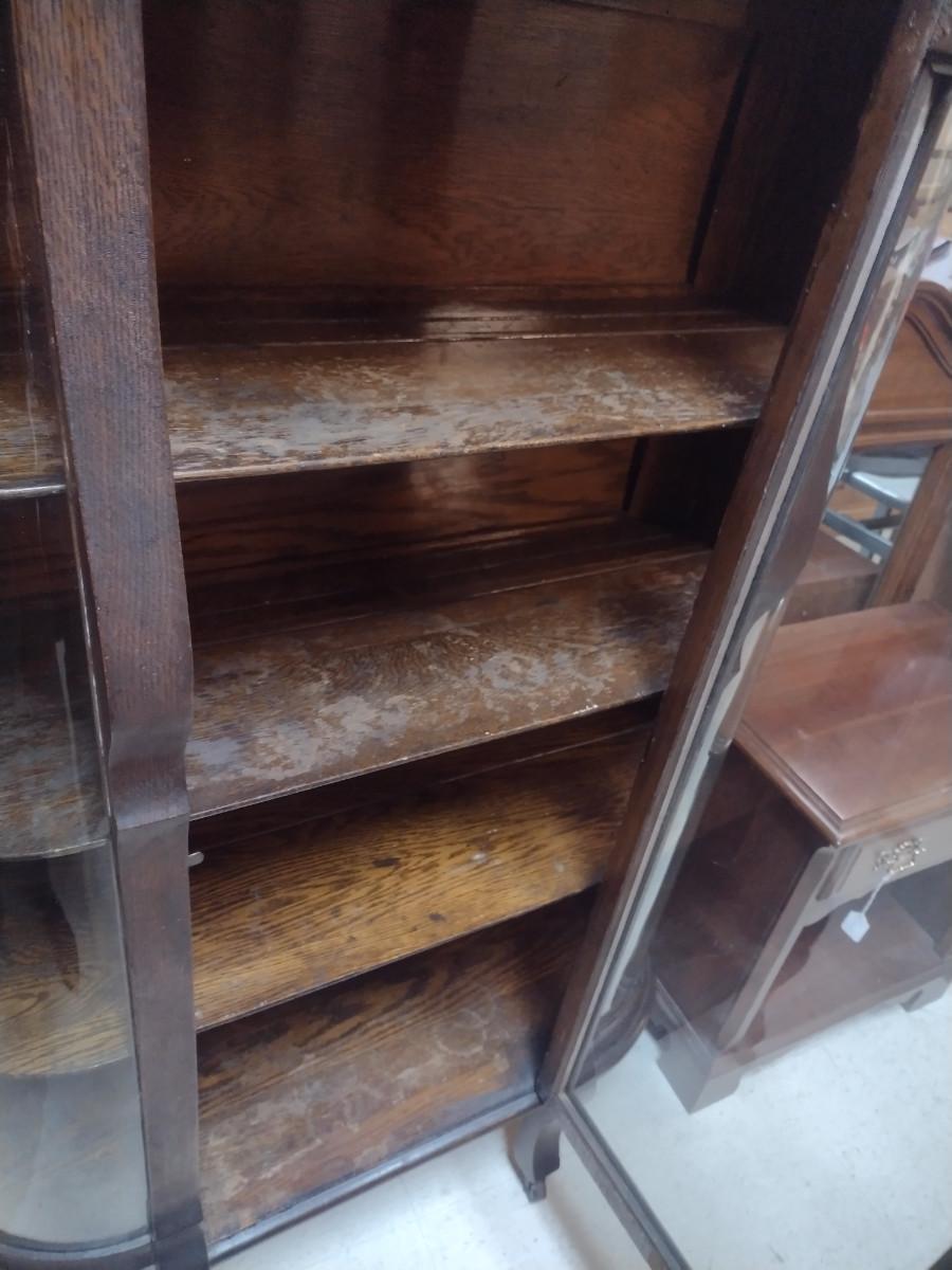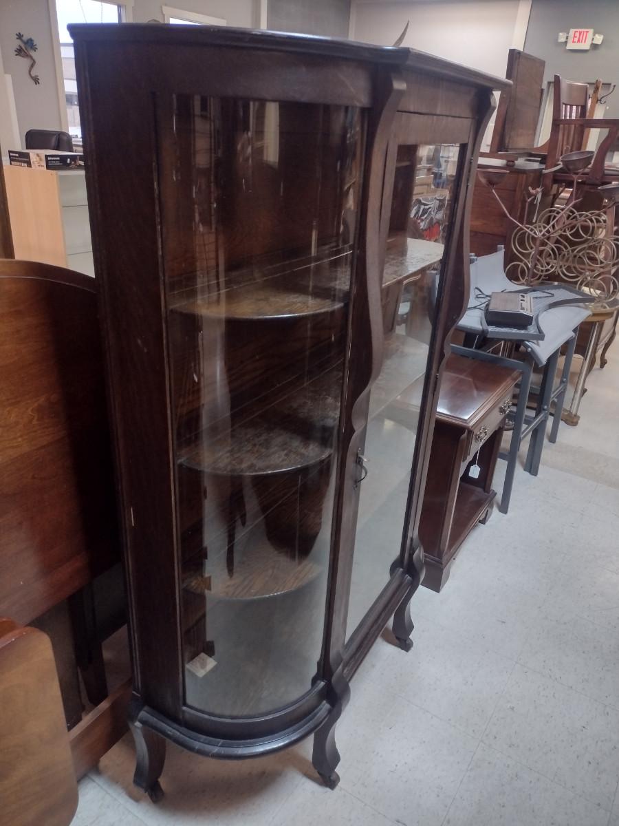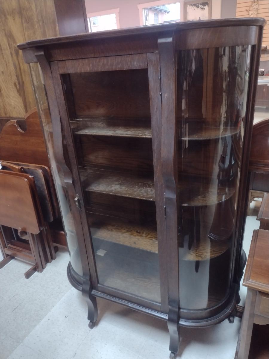 Antique Curved Glass Tiger Oak China Cabinet- Approx 37 3/4" x 14" x 57" Tall. Item has some wear to finish- please see all pictures. Shelves have plate grooves.