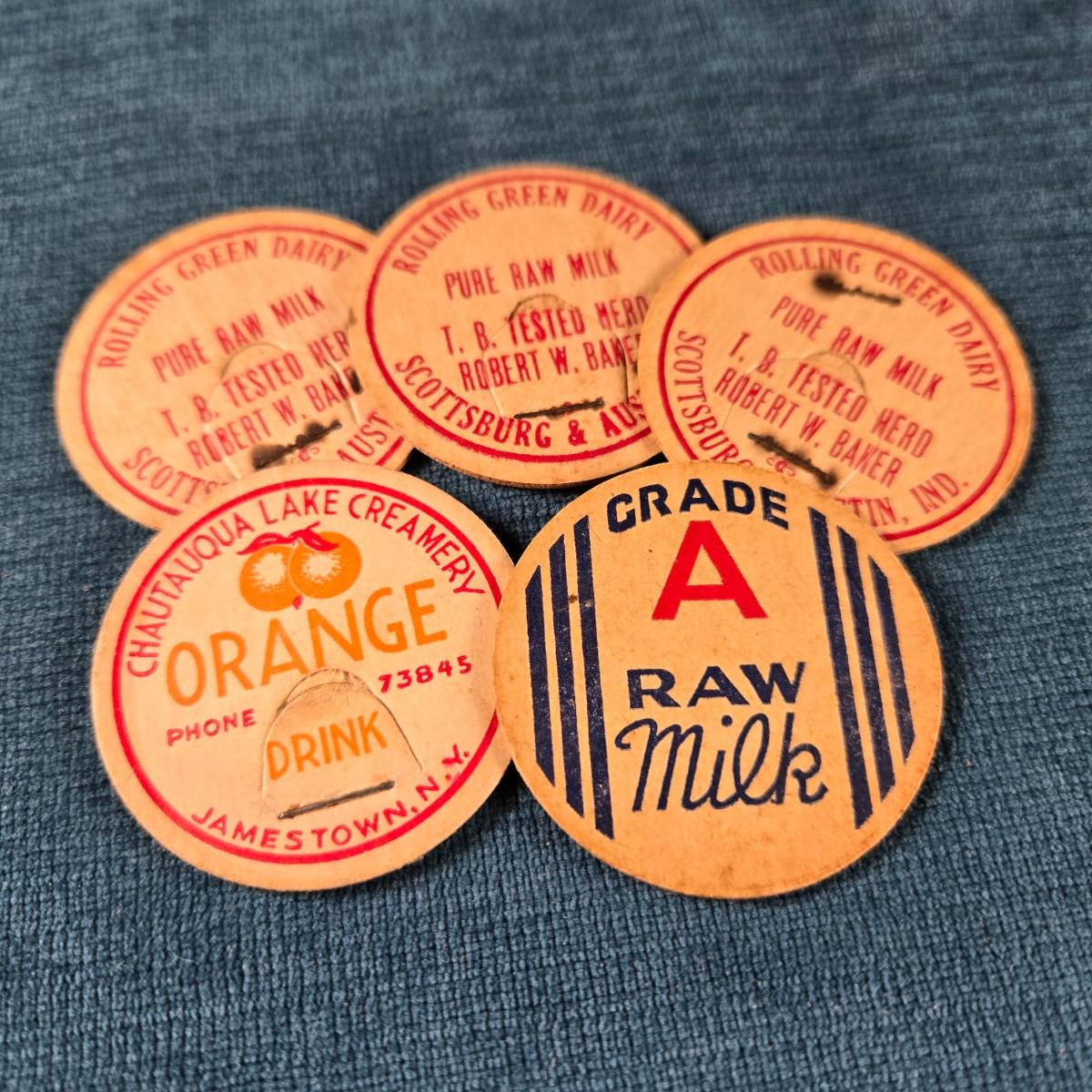 This auction lot is for a grouping of Antique Dairy Milk Bottle Caps. In thiw offer there are 5 Antique Dairy Milk Bottle Caps in very good condition There are 3 Bowling Green Dairy caps, 1 Chautauqua Lake Creamery cap and a Grade A Raw Milk Cap. If you collect old milk bottles or dairy items, this is a must for you.