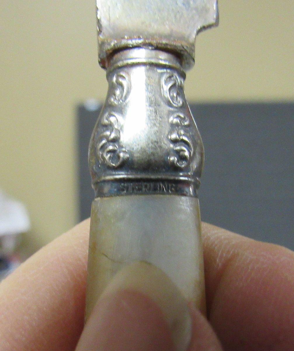 The mother of pearl has stains, the blades need sharpening. The sterling part is the fancy fitting, marked as shown. Shipping is available at shipping cost plus $5.00 handling fee on one box, $10.00 handling fee on two boxes, $15.00 handling fee on 3 boxes. Helps cover shipping materials and labor cost.
