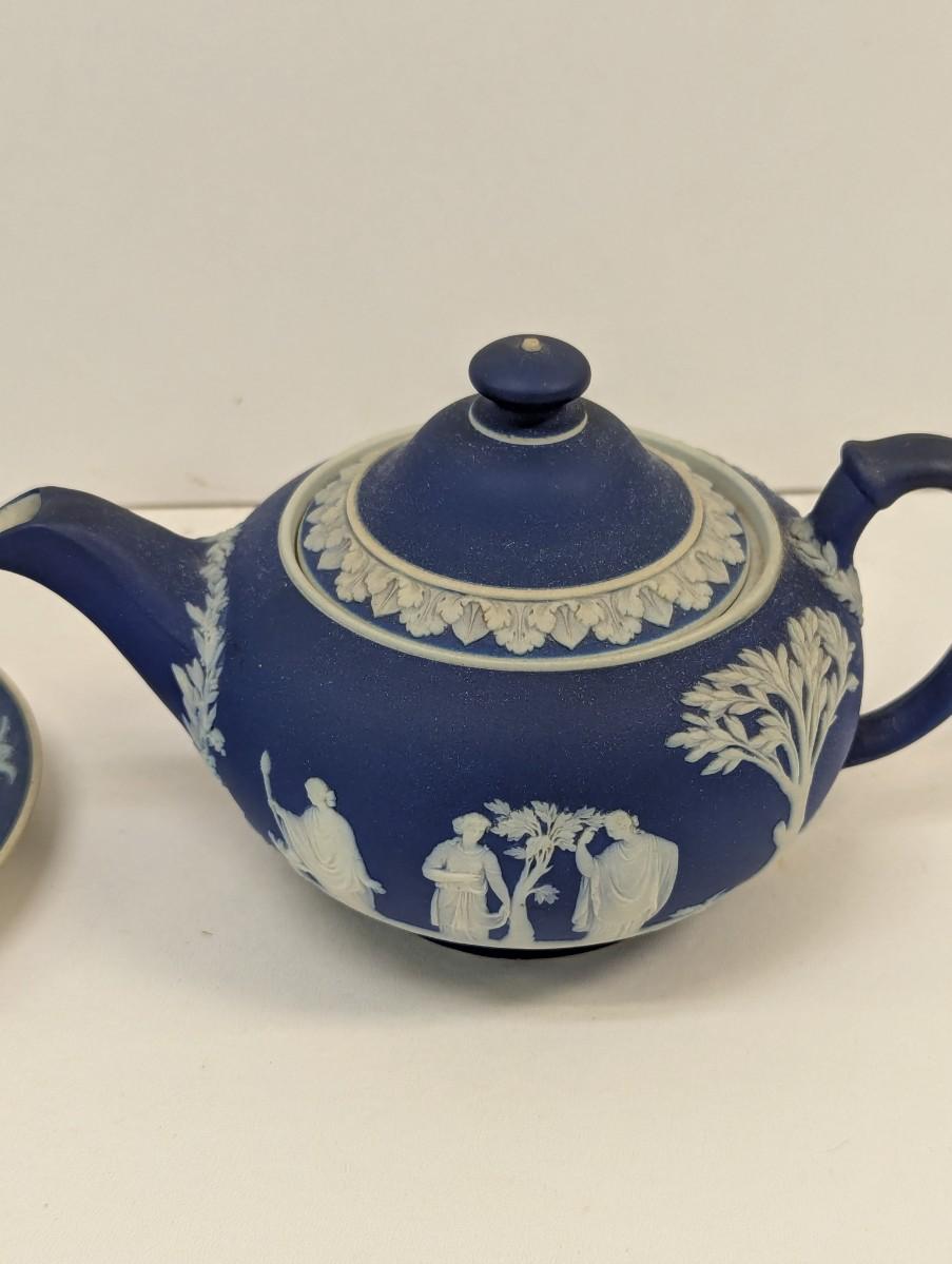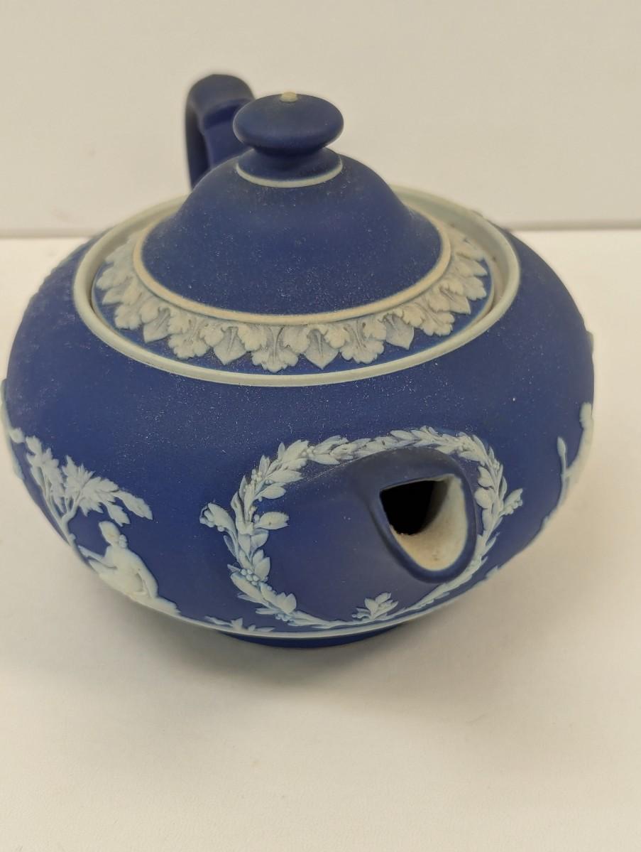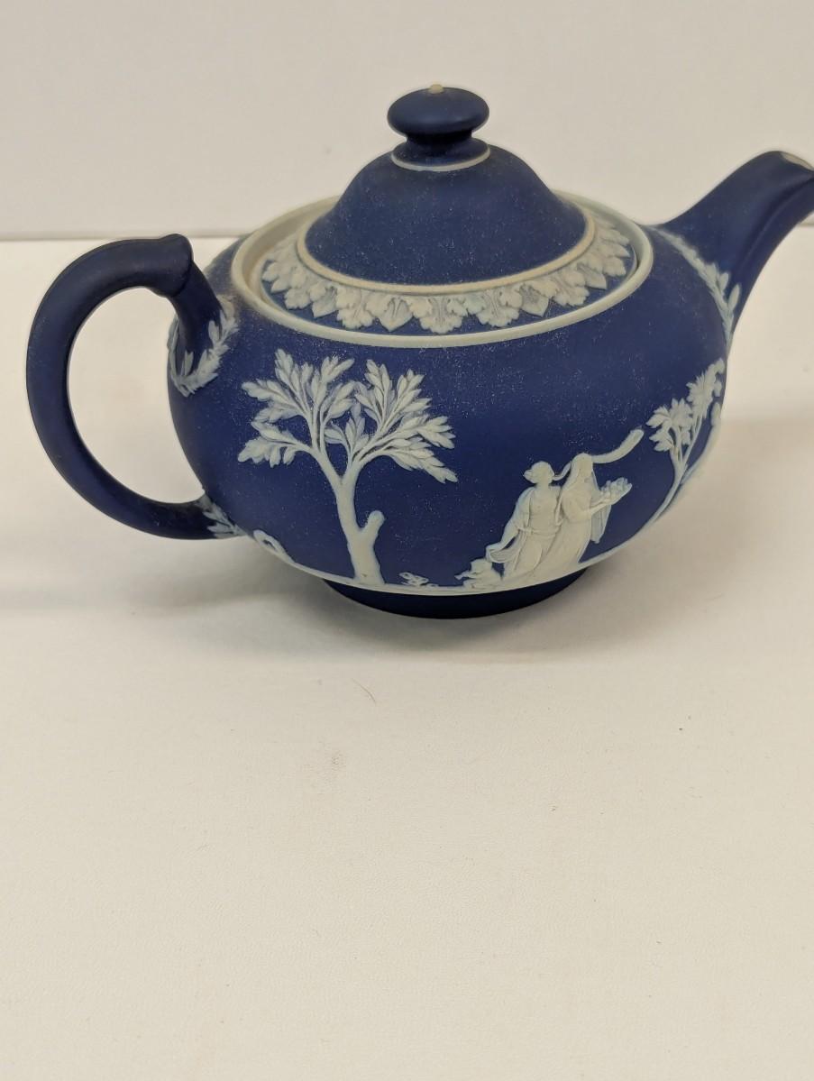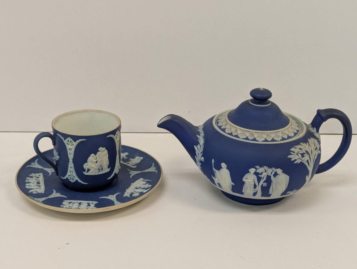 Antique Dark Blue Wedgwood Jasperware Tea Pot Cup & Saucer