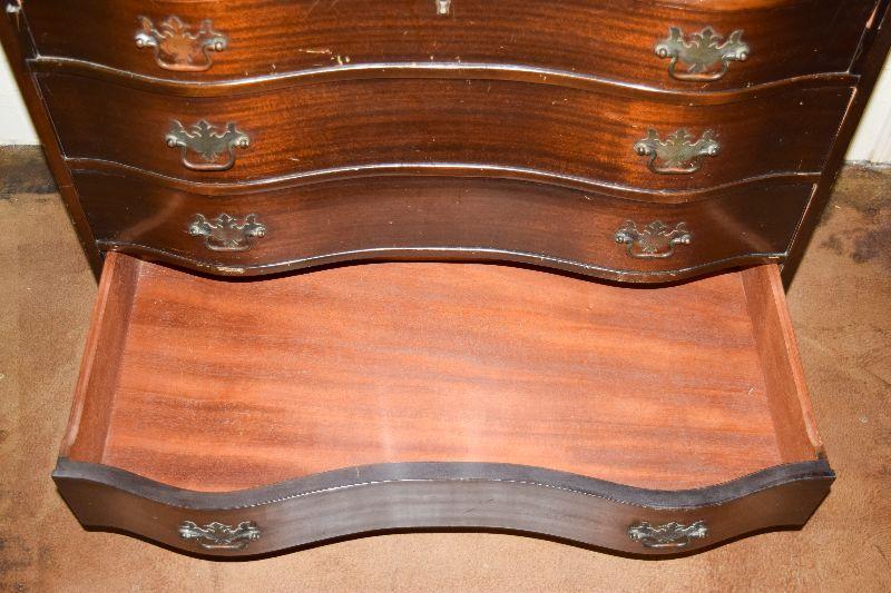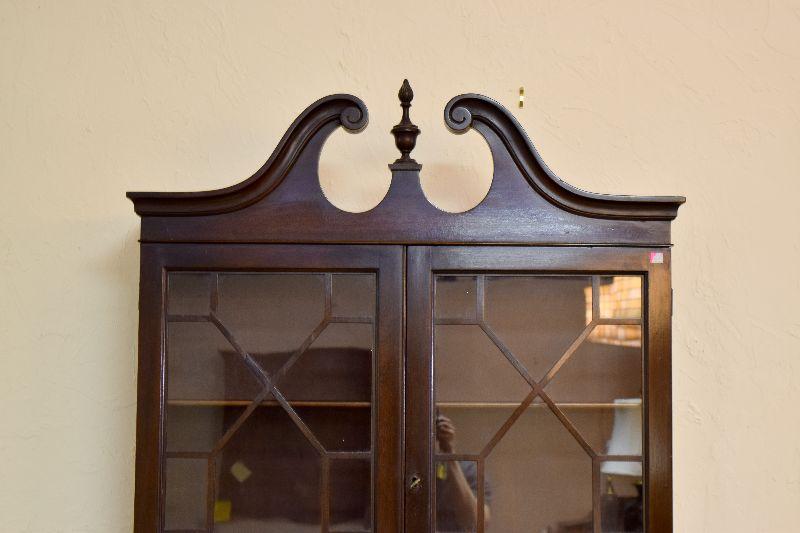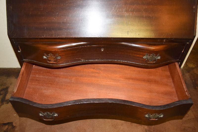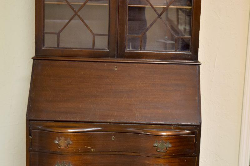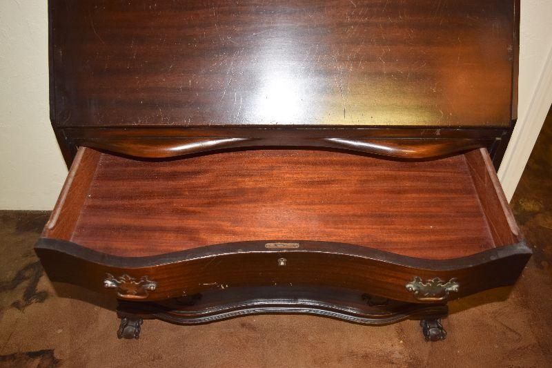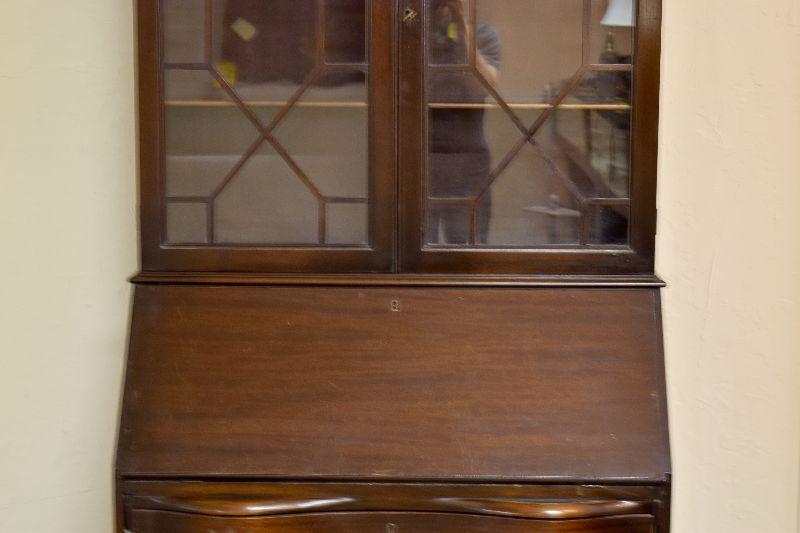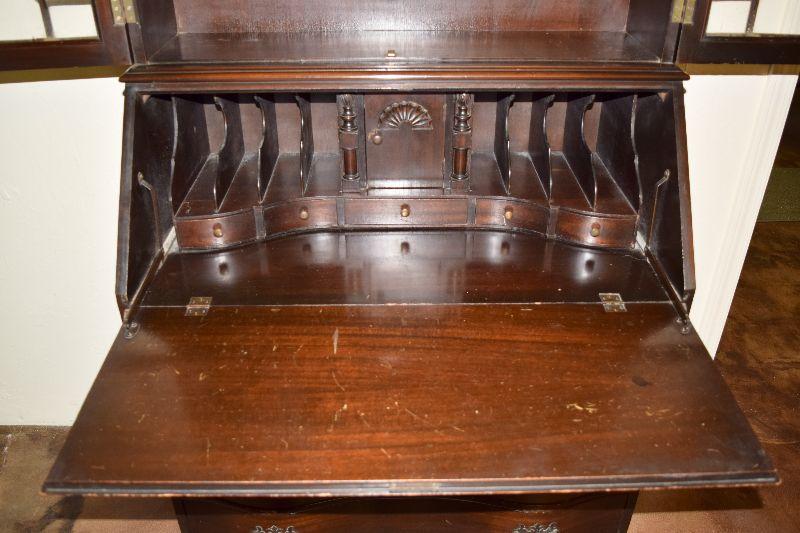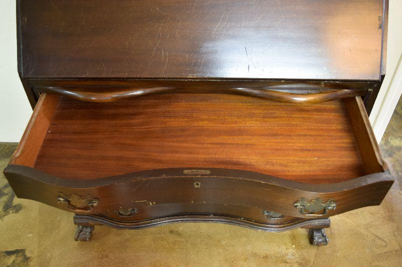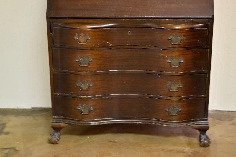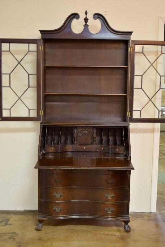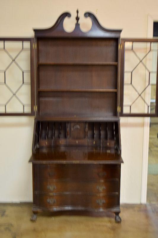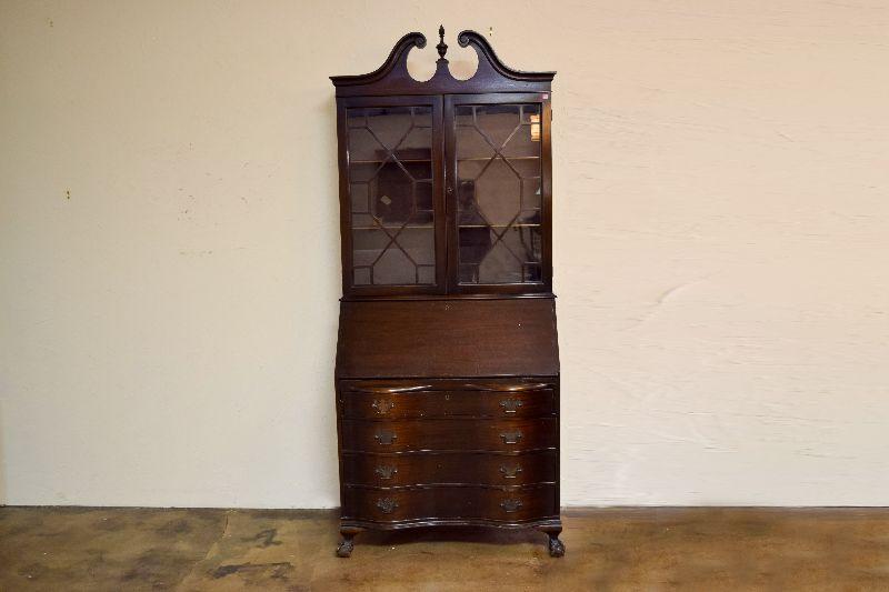 Antique Wooden Drop Front Secretary Crested with Rams Head Style Pediment