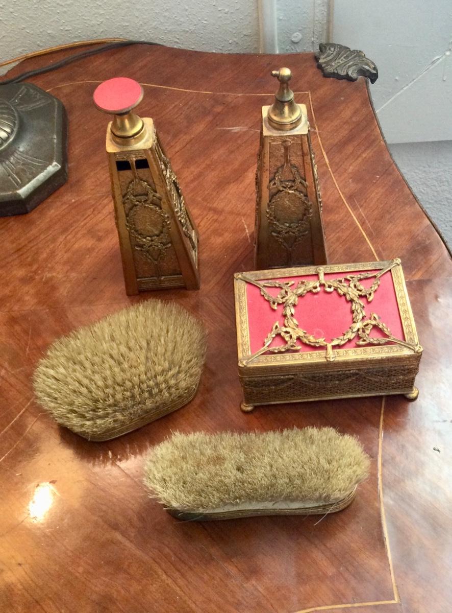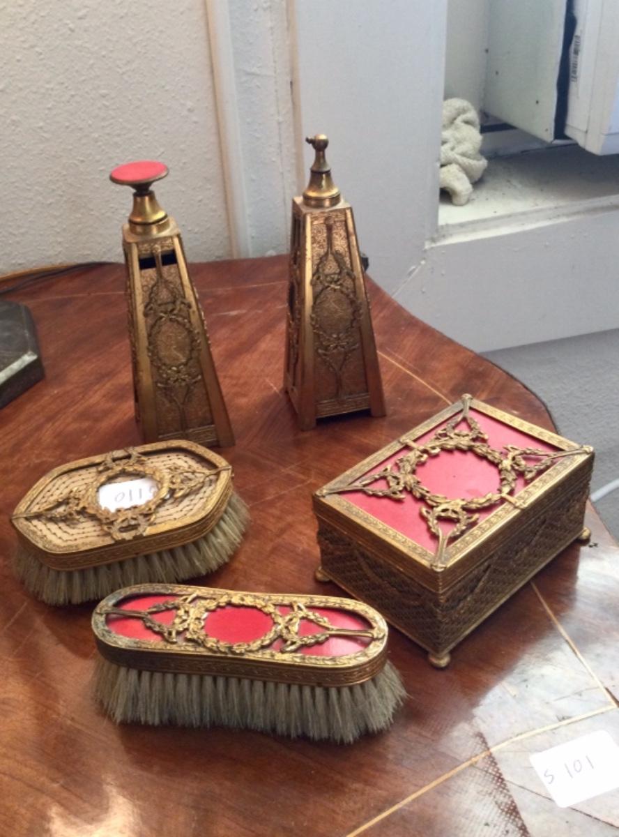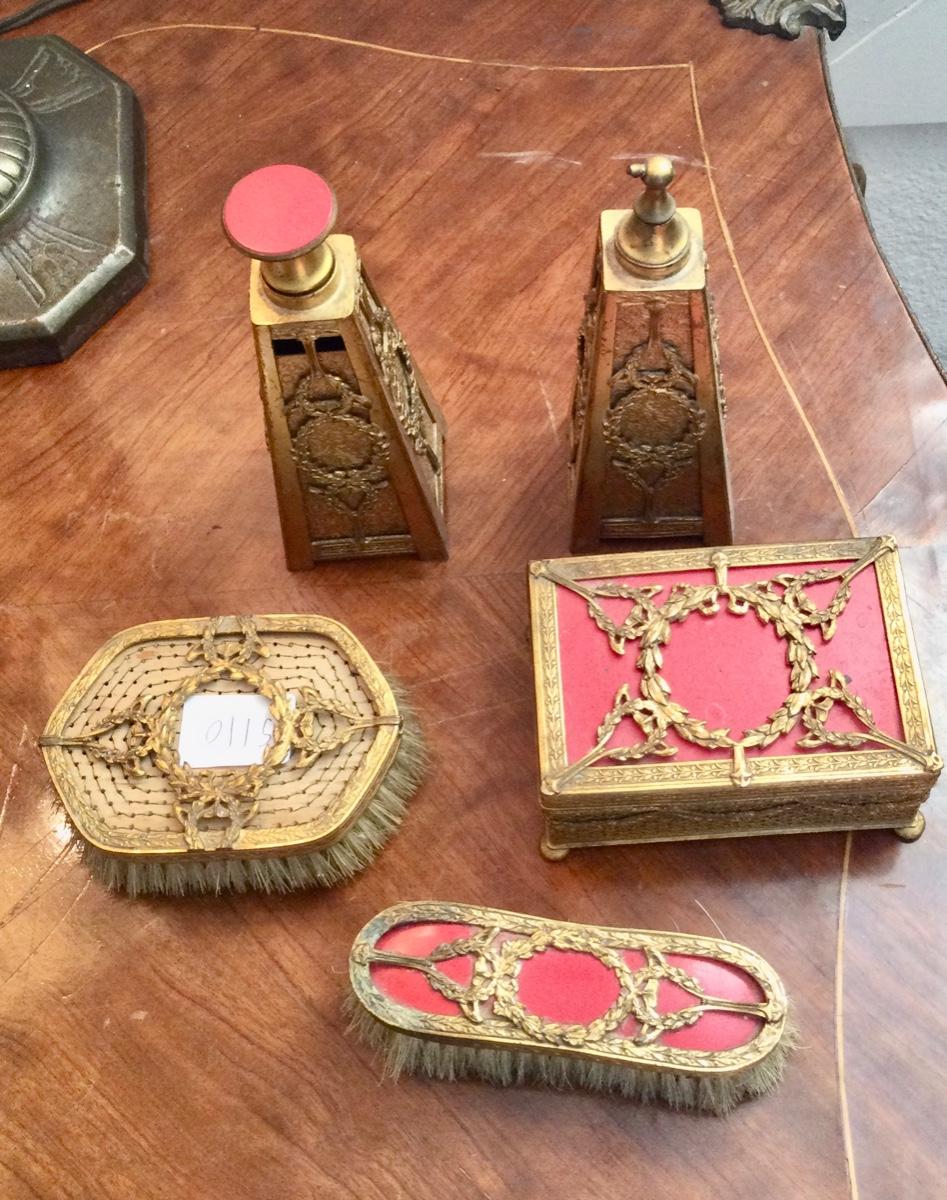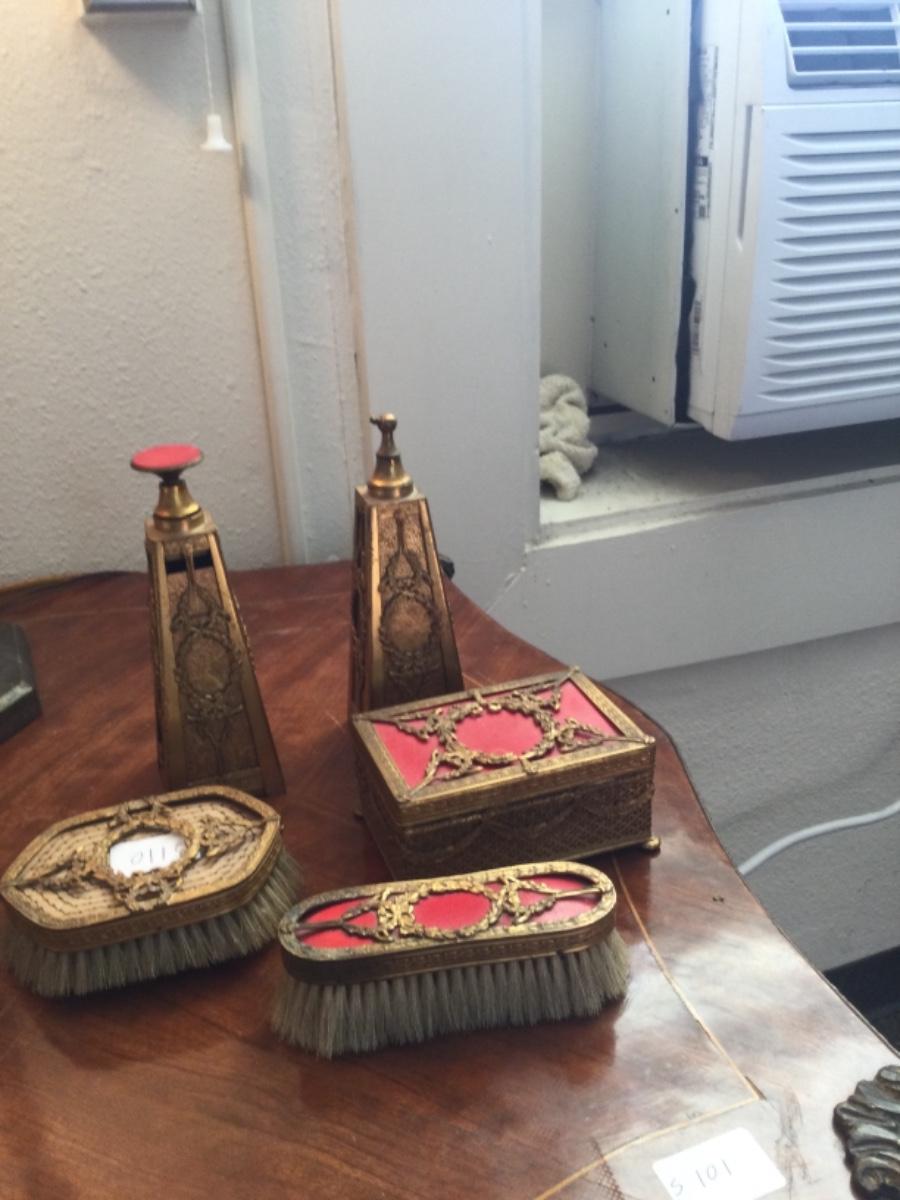 Has atomizer missing bulb, perfume bottle 2 brushes, and dresser bos