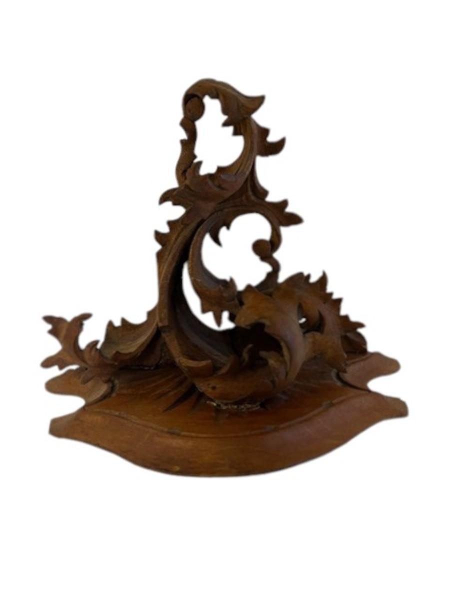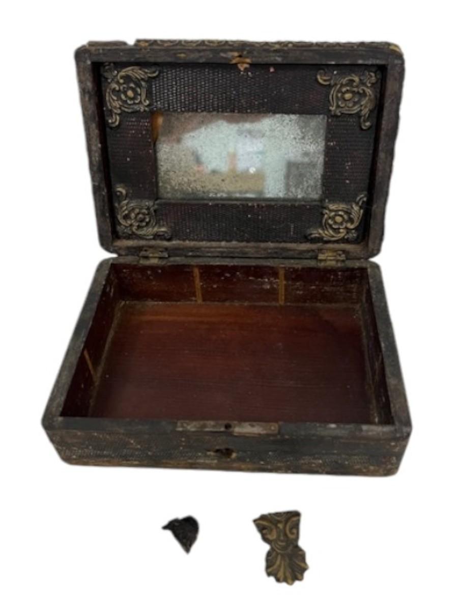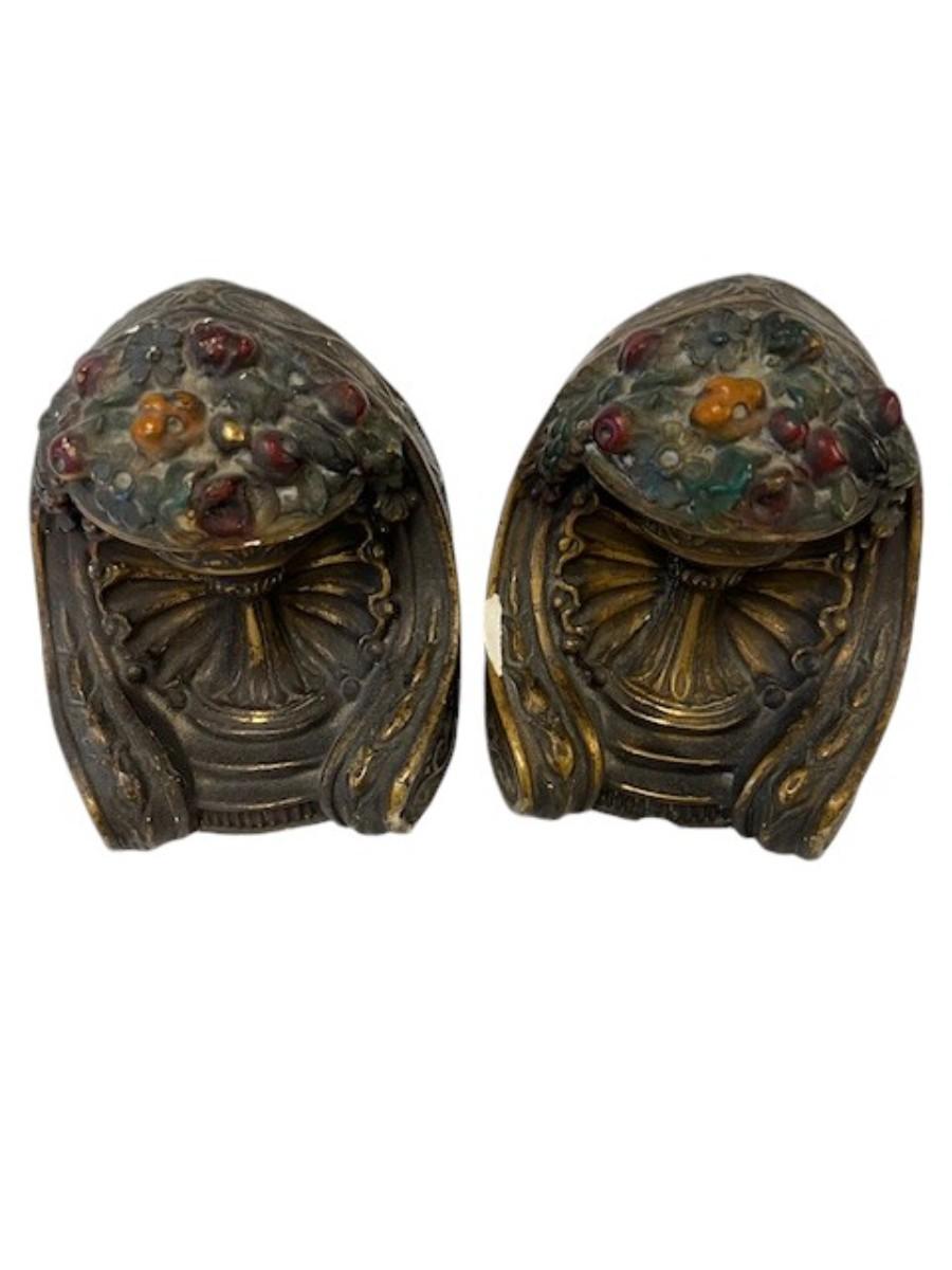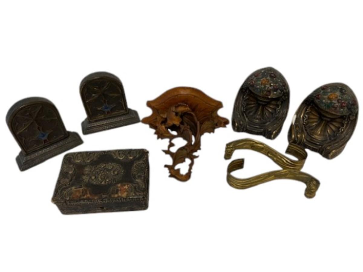 Includes two pairs of chalkware bookends, a Victorian shelf, brass Victorian drape tie backs, and an ornate wood box. Total of 8 pieces. Age related wear, including some chips, paint loss, and repair. Measurement of largest piece: 7.5" x 9". [LV]