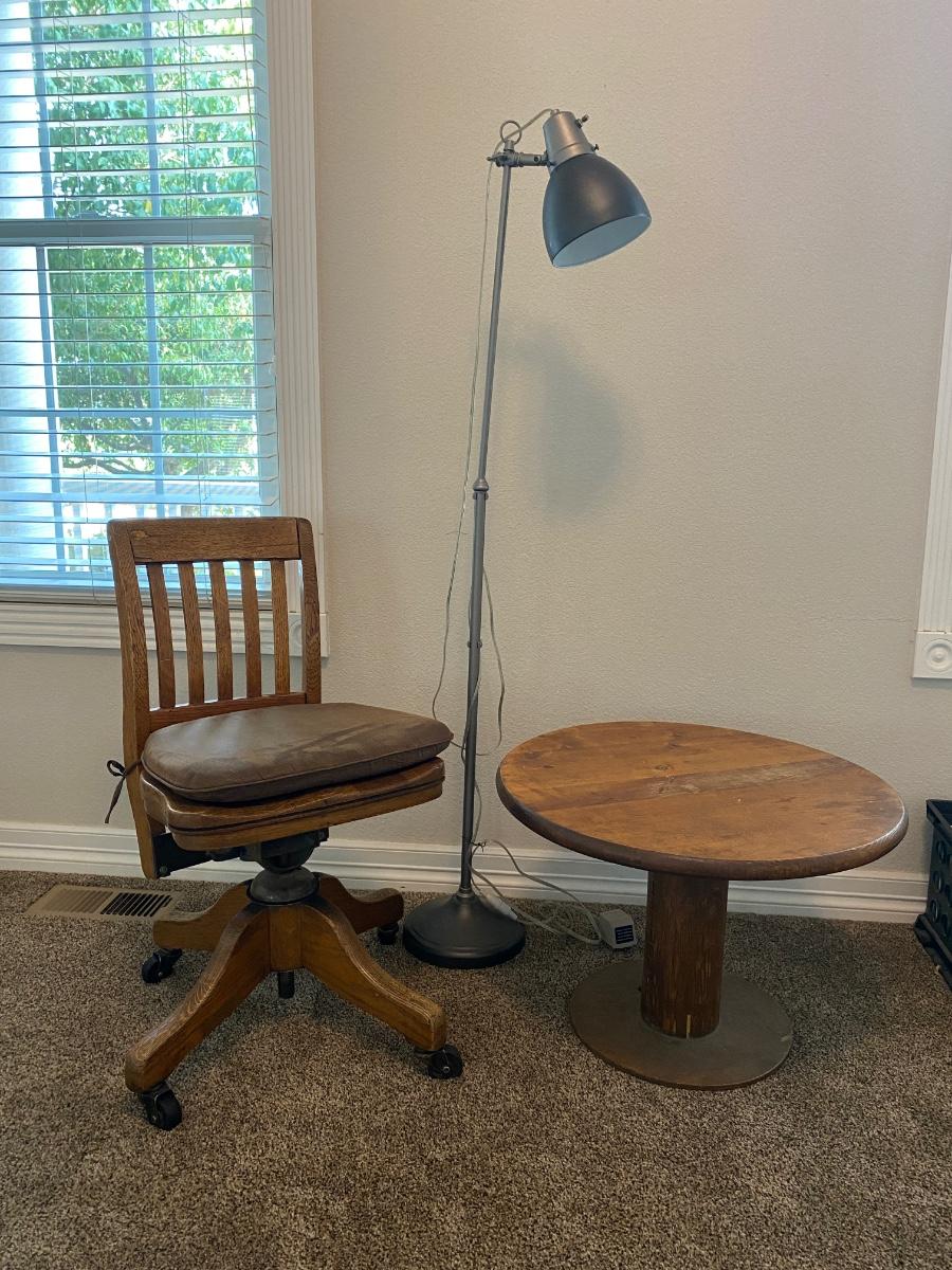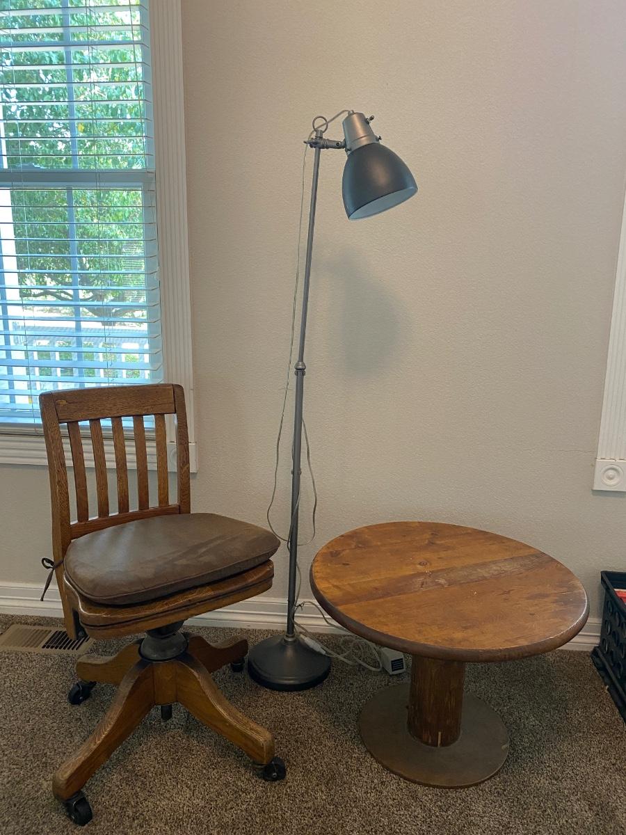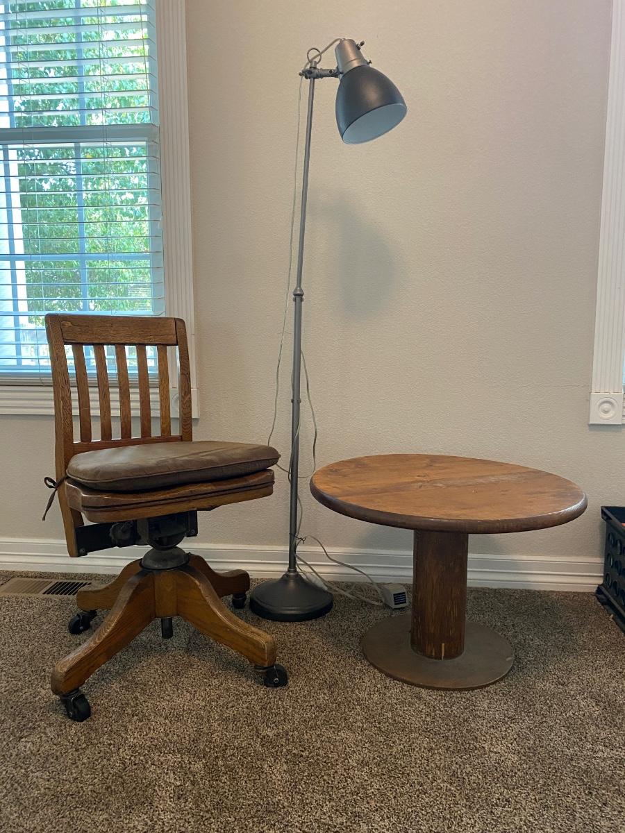 ANTIQUE DESK CHAIR, OTT-LITE AND NEAT LITTLE HOMEMADE SPOOL TABLE