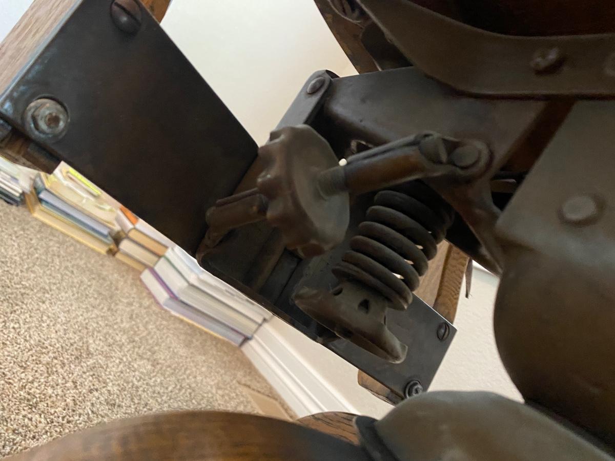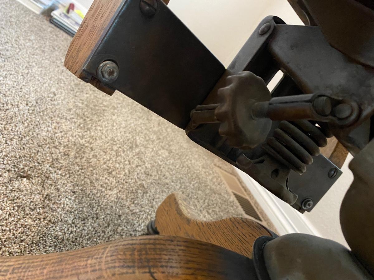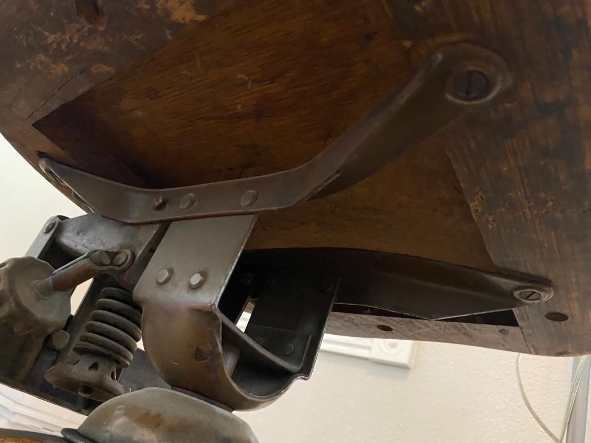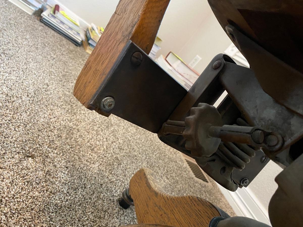 ANTIQUE DESK CHAIR, OTT-LITE AND NEAT LITTLE HOMEMADE SPOOL TABLE