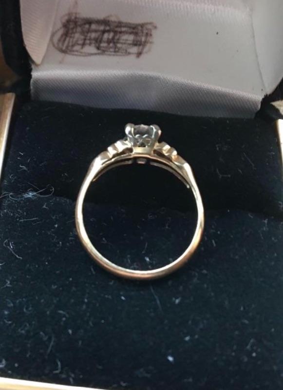 Excellent condition. Approx .65 carat round diamond with nice fire and smaller diamonds on the sides. Yellow gold ring with white gold setting. Please see pictures for details. Packaging and shipping services are available. Please contact us for a quote before bidding..