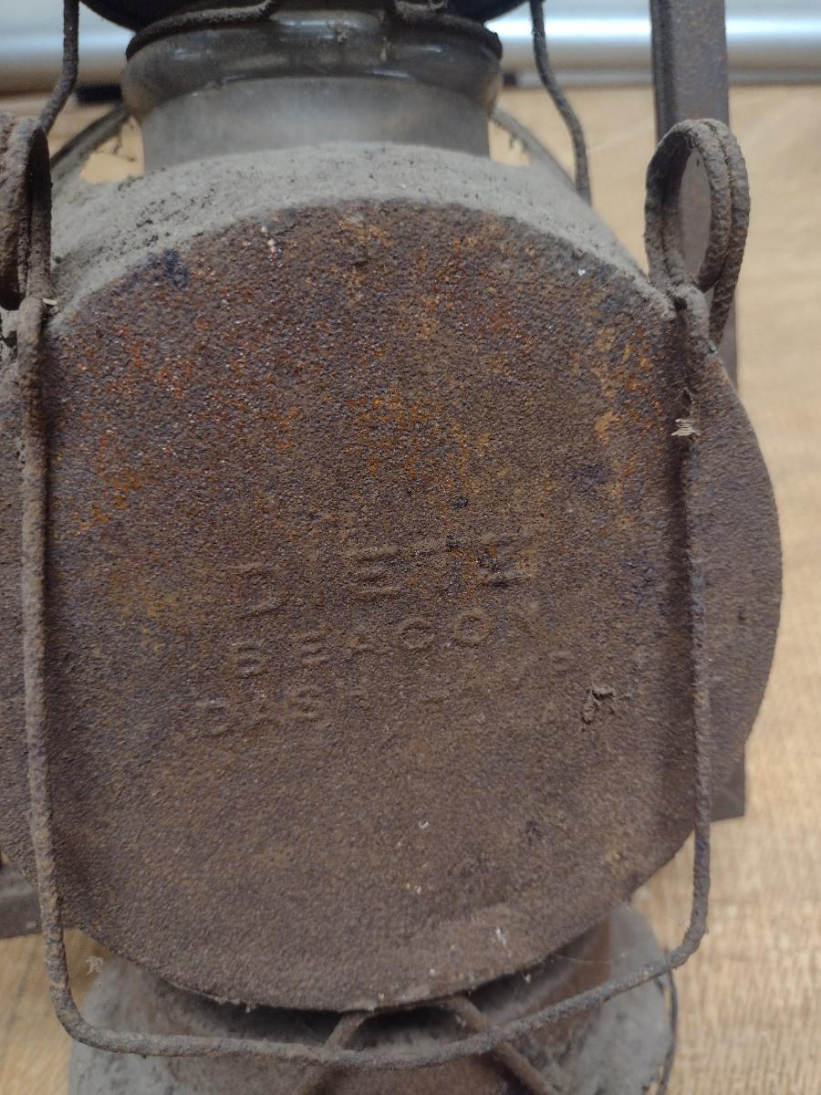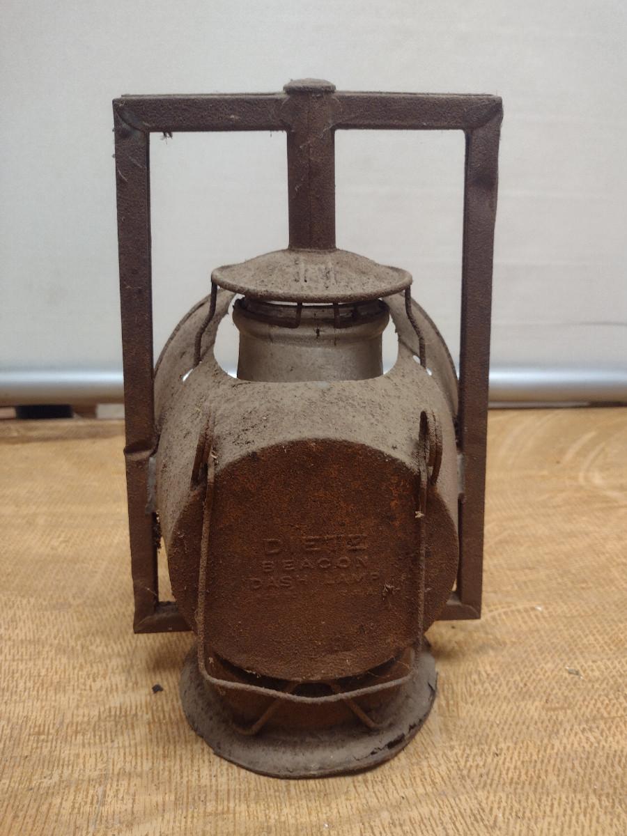 Antique Dietz Beacon Dash Lamp. Please see all pictures- item has some damage and is covered in rust. Stored in non-climatized basement so expect item may need to be cleaned from dust, insects, etc. Shipped in as is condition