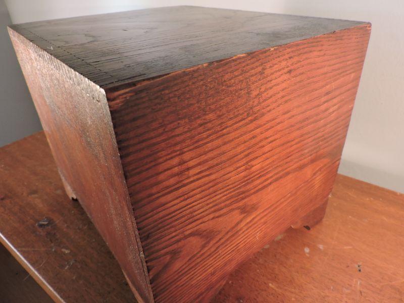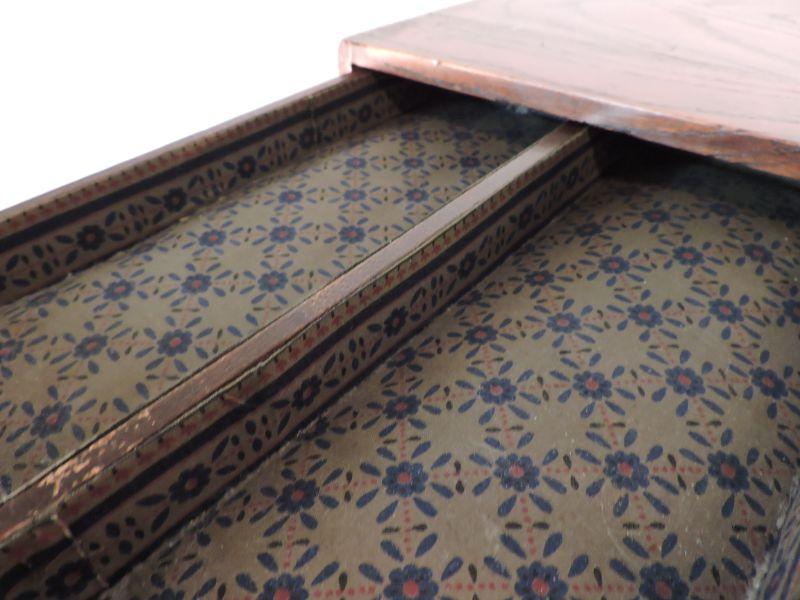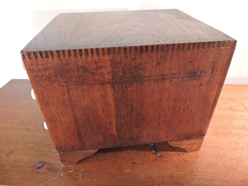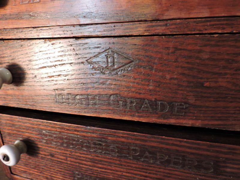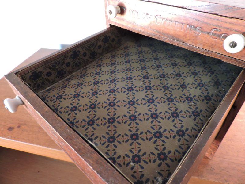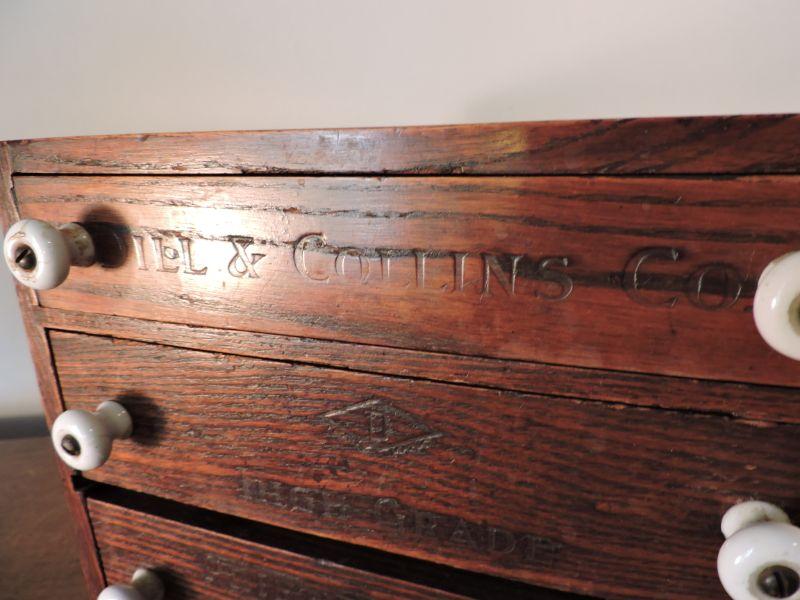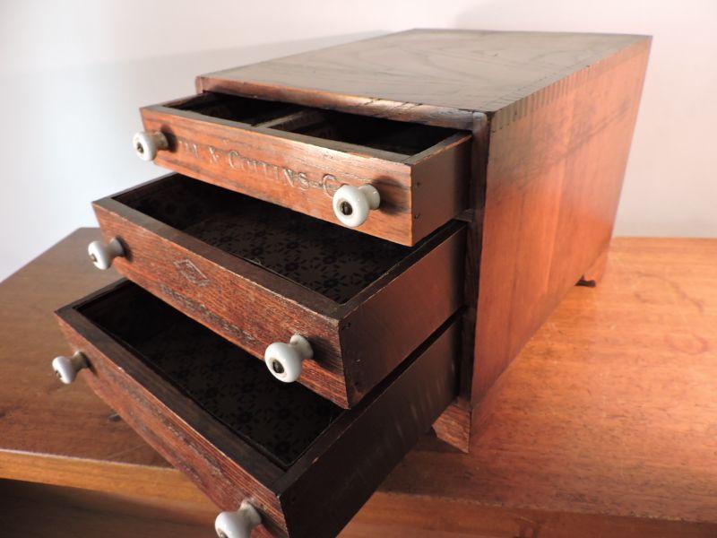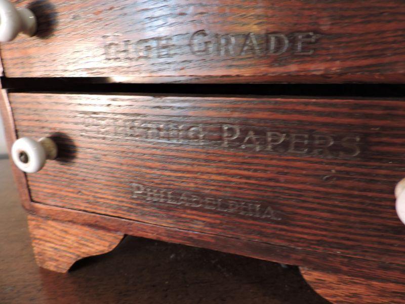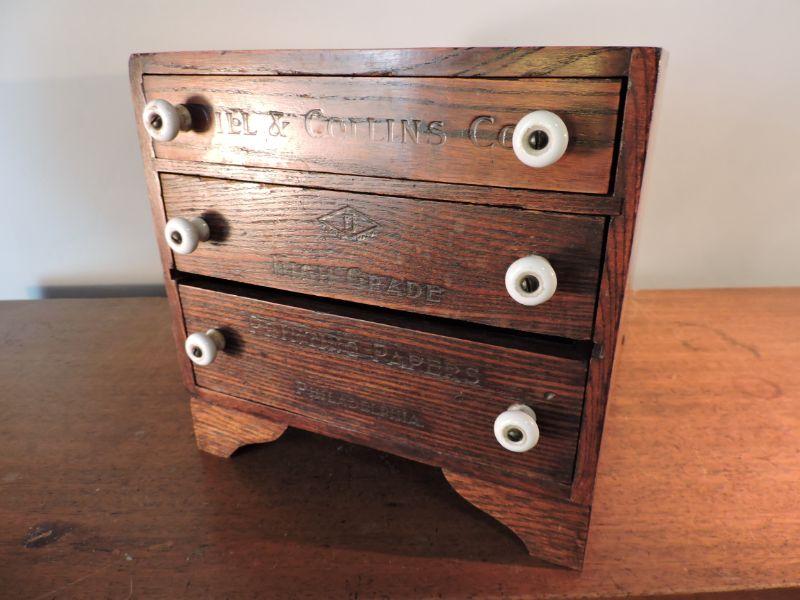 Rare oak wood countertop display box of drawers imprinted "Dill & Collins Co. High Grade Printing Papers Philadelphia". Wood box has three drawers with porcelain knobs. Dates back to early 1900-1920's. **Please read Terms and Conditions before placing a bid. Pick up is Sunday, November 24 from 9am to 3pm or Tuesday, November 26 from 4pm-7pm in Mantua, NJ. All sales are final. All sales are as is, where is. Please review all photos. Any props included in photos are not included in listing. All measurements are approximate.