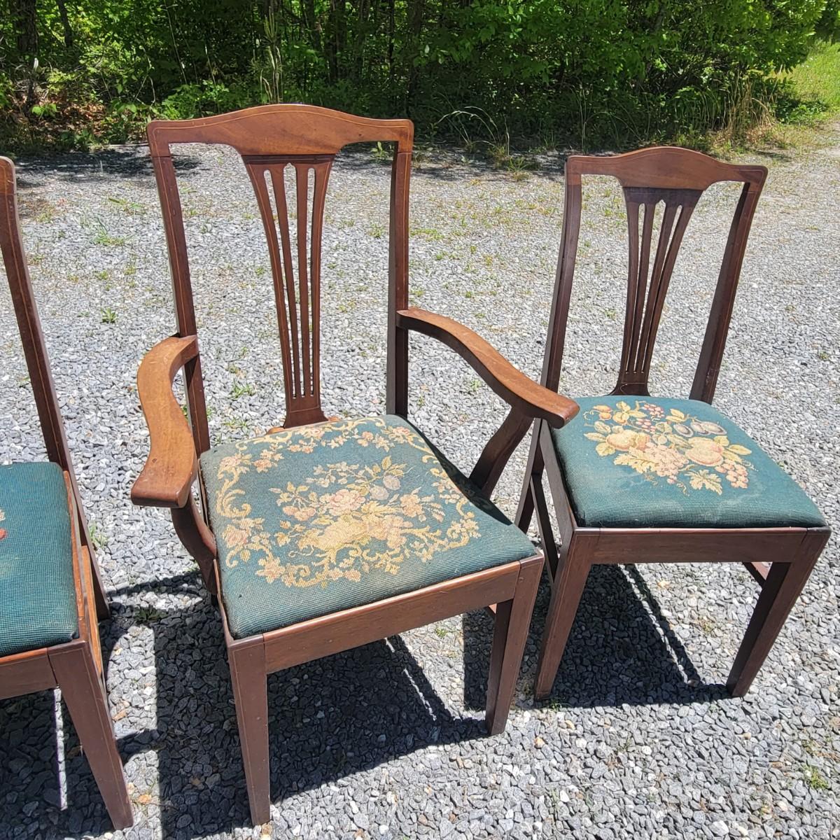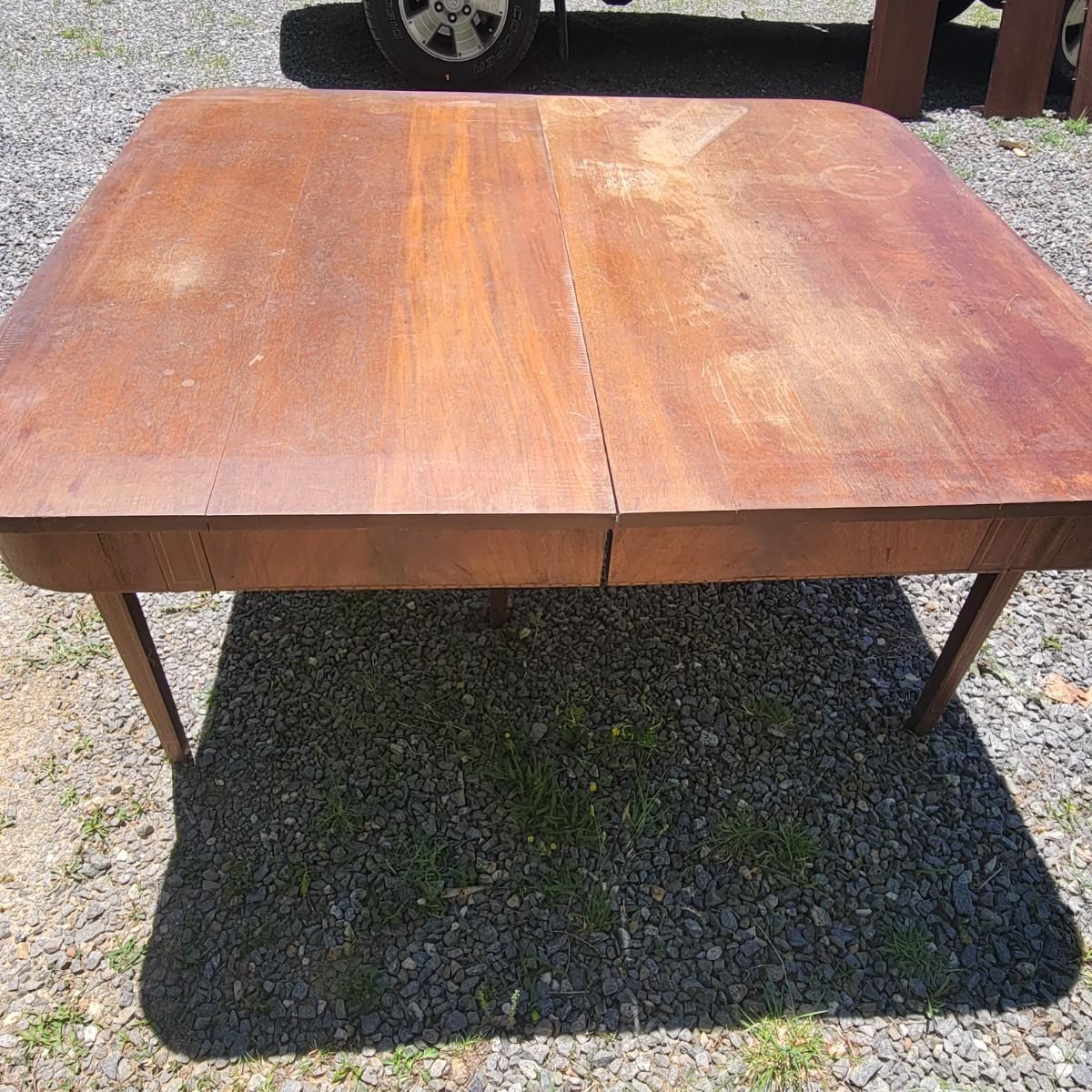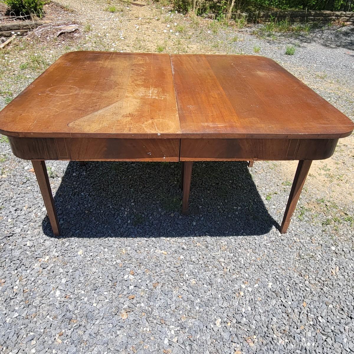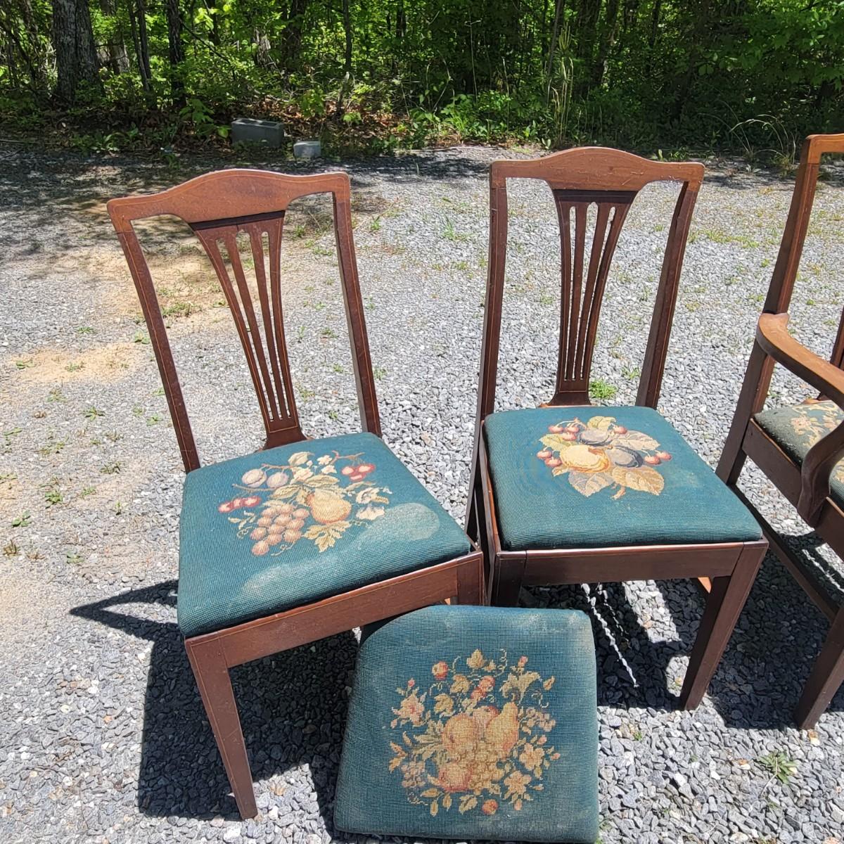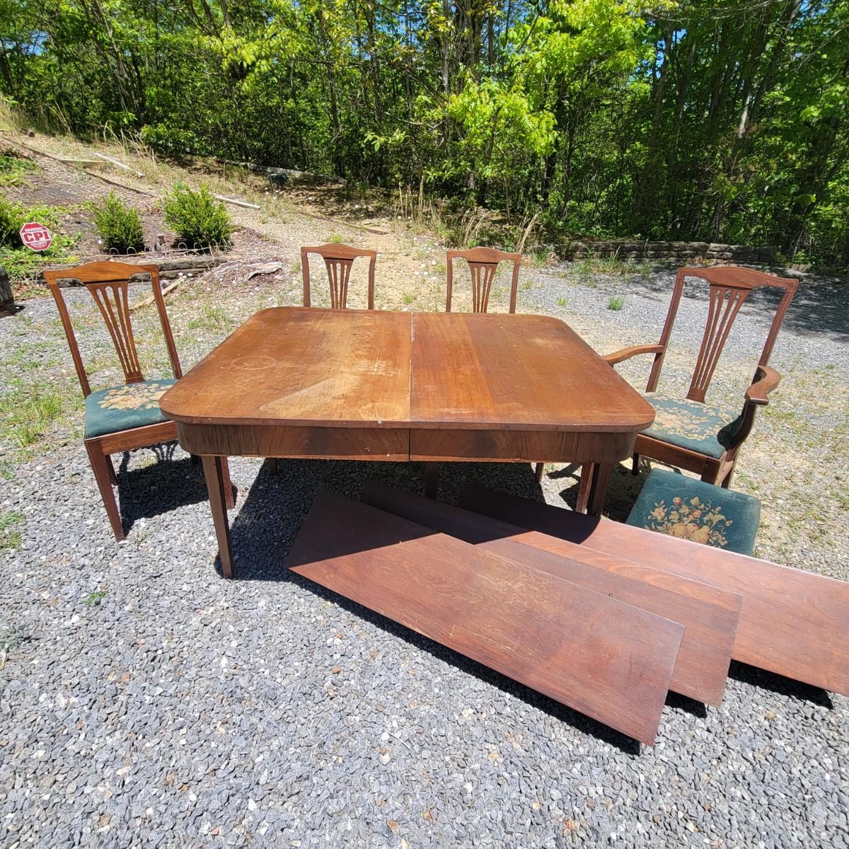 Wooden, dining room table with three 12" inserts. Table is solid wood with a maple veneer and some inlay. Table top has numerous small scratches, but no deep gouges. The veneer is peeling in multiple areas. Hardware to mount the base and slides for the inserts is included. The 6 chairs are in good condition but seats will likely need to be upholstered. One chair has arms, the other 3 do not. Includes extra seat cushion.