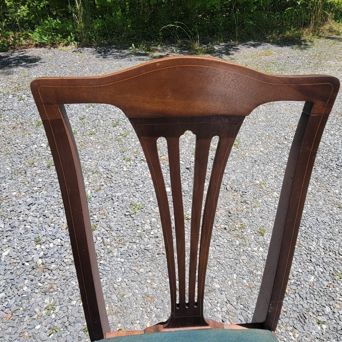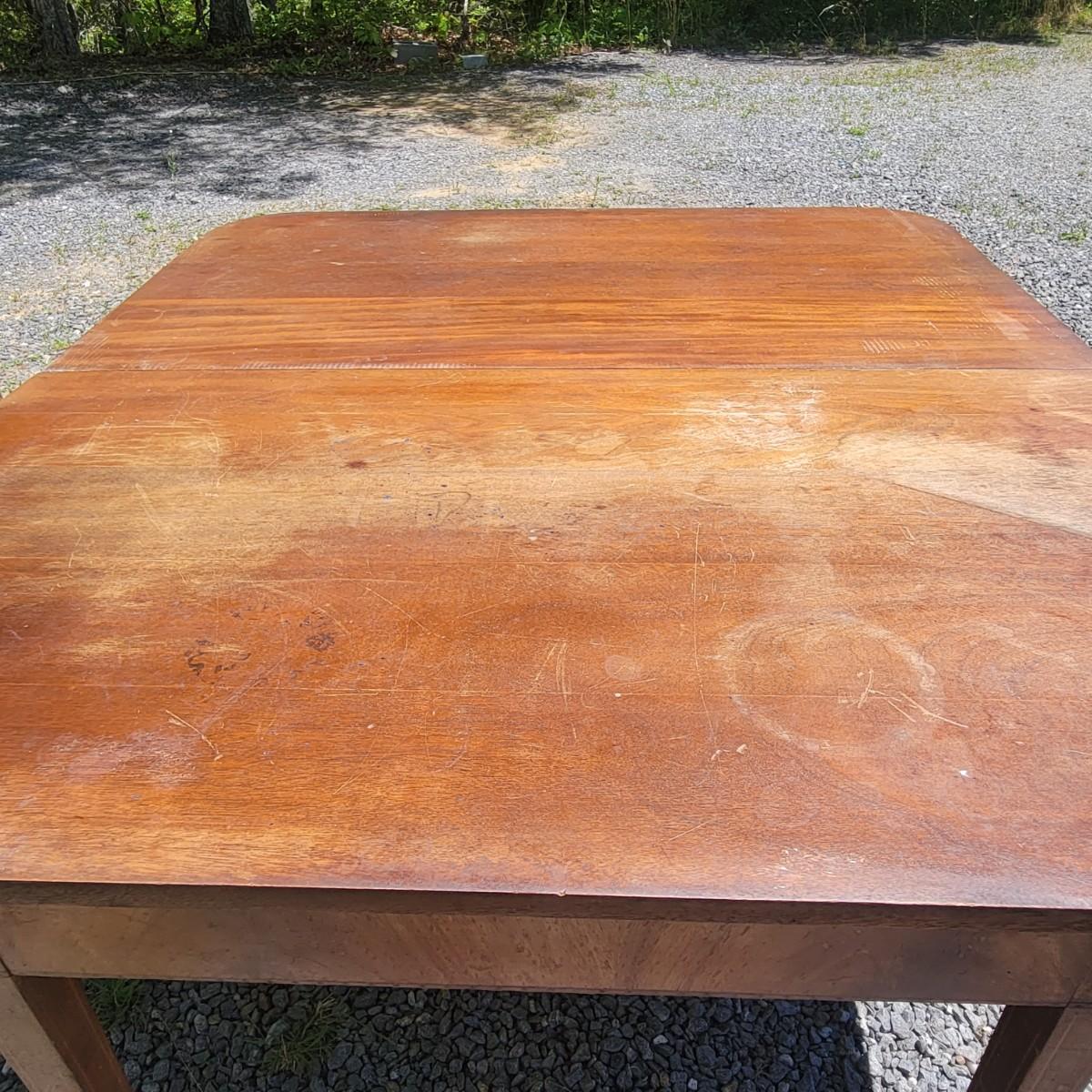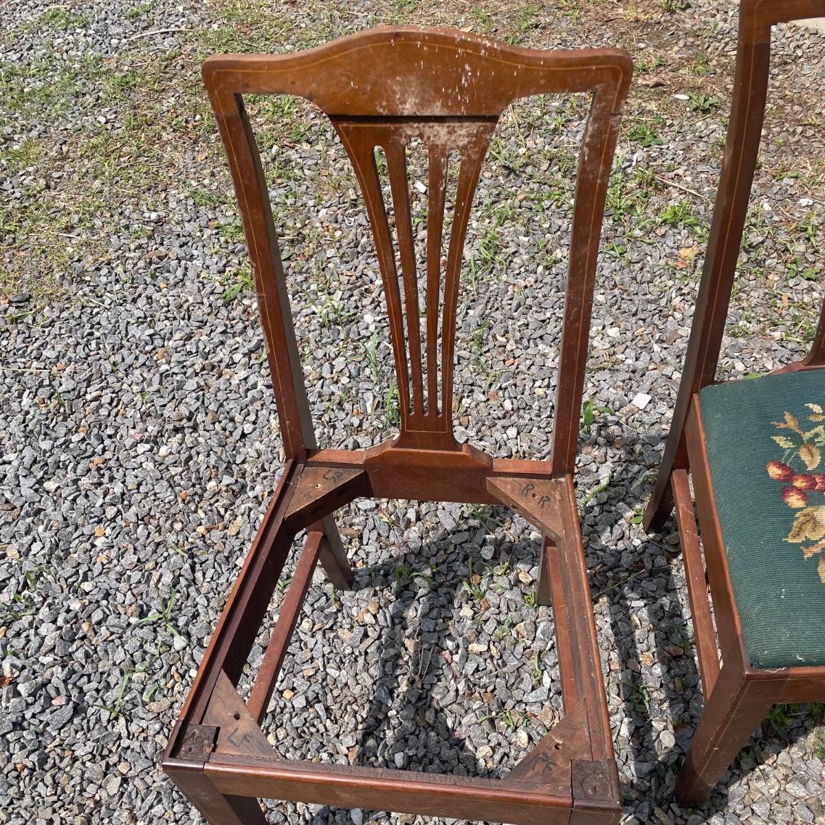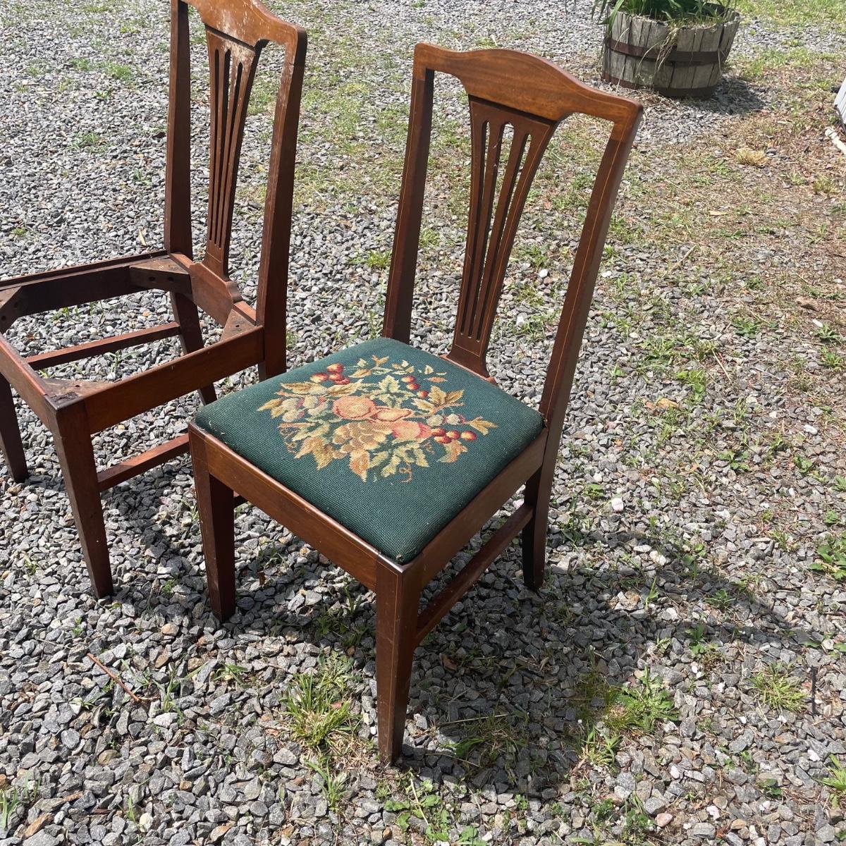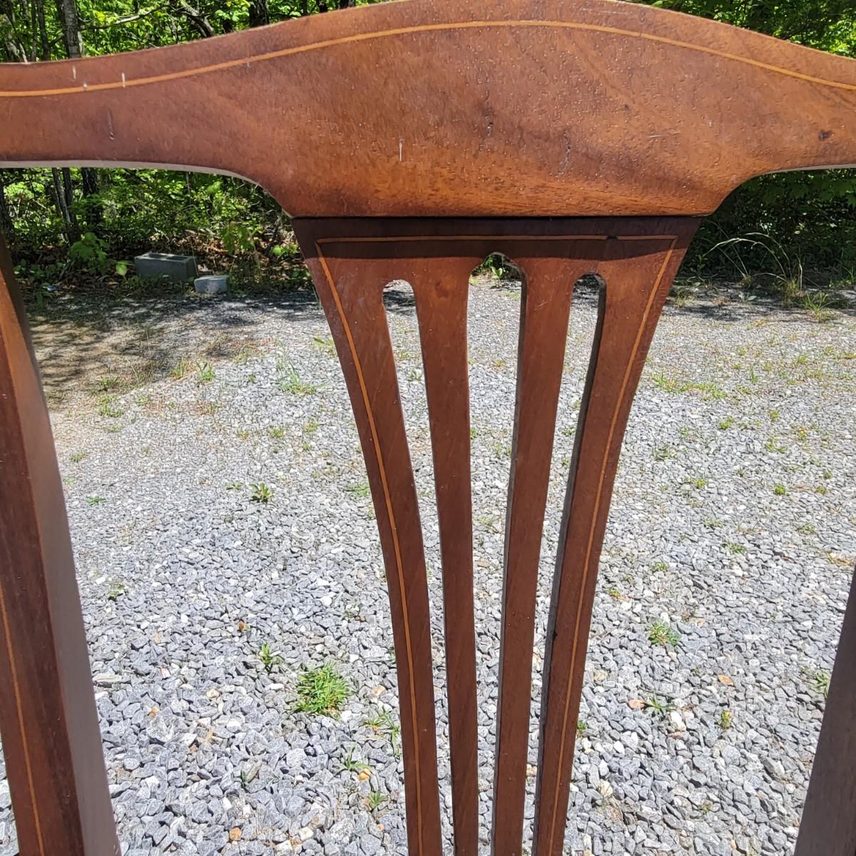 Wooden, dining room table with three 12" inserts. Table is solid wood with a maple veneer and some inlay. Table top has numerous small scratches, but no deep gouges. The veneer is peeling in multiple areas. Hardware to mount the base and slides for the inserts is included. The 6 chairs are in good condition but seats will likely need to be upholstered. One chair has arms, the other 3 do not. Includes extra seat cushion.