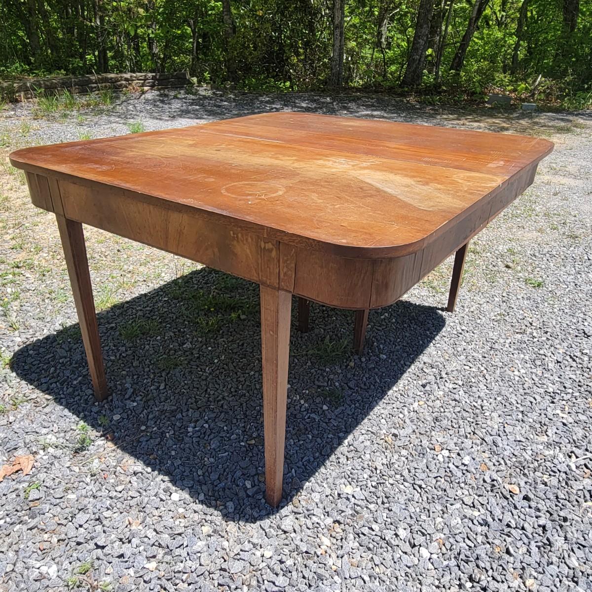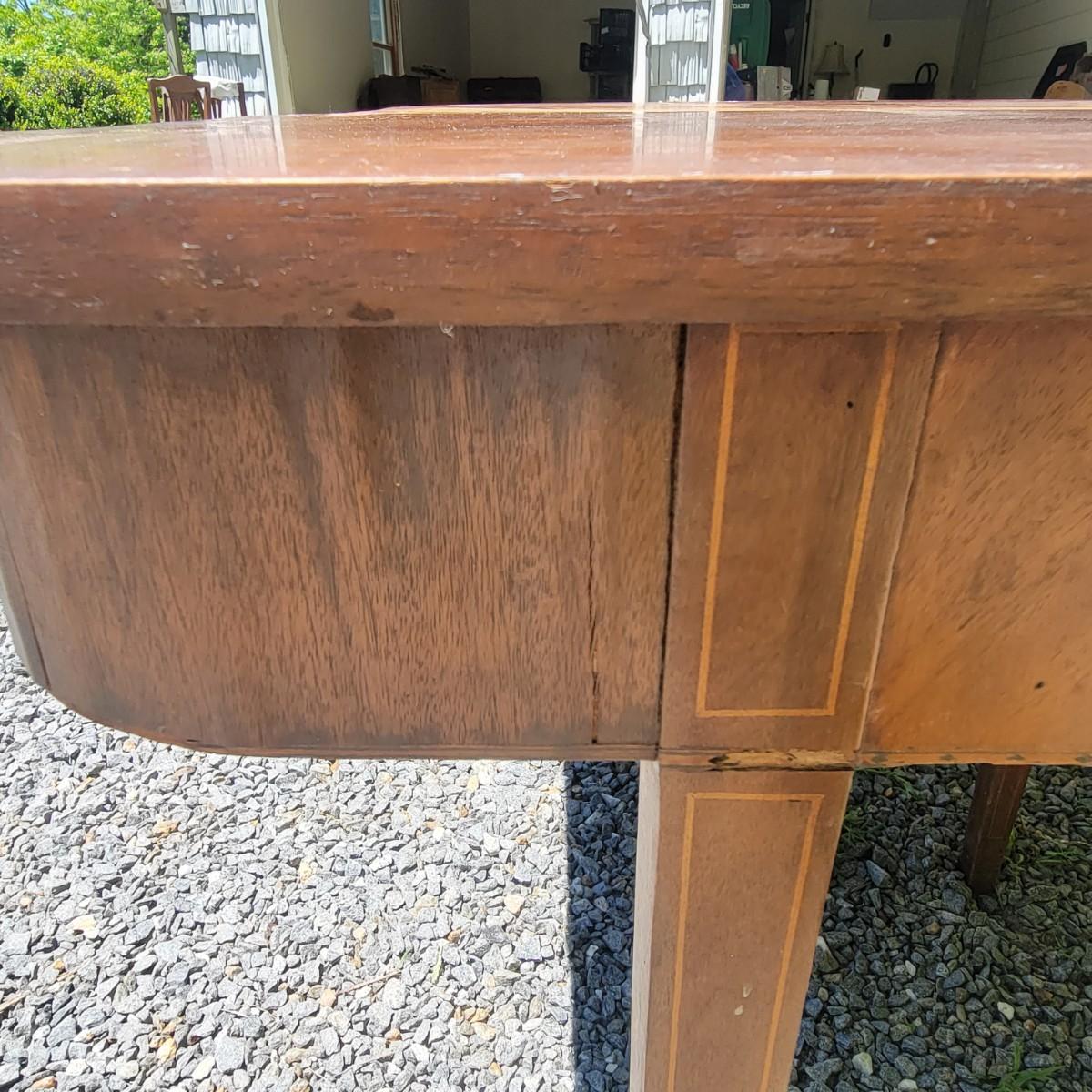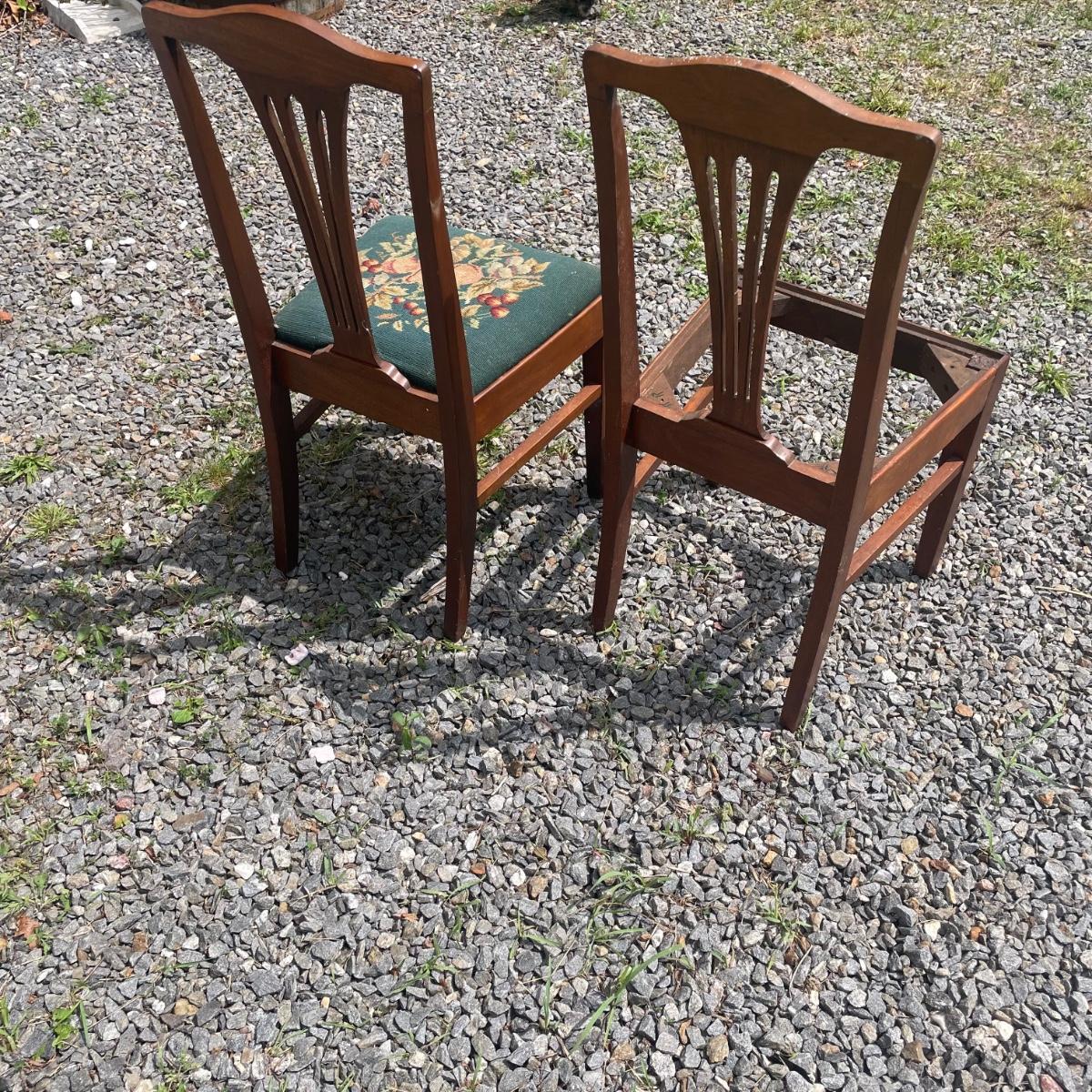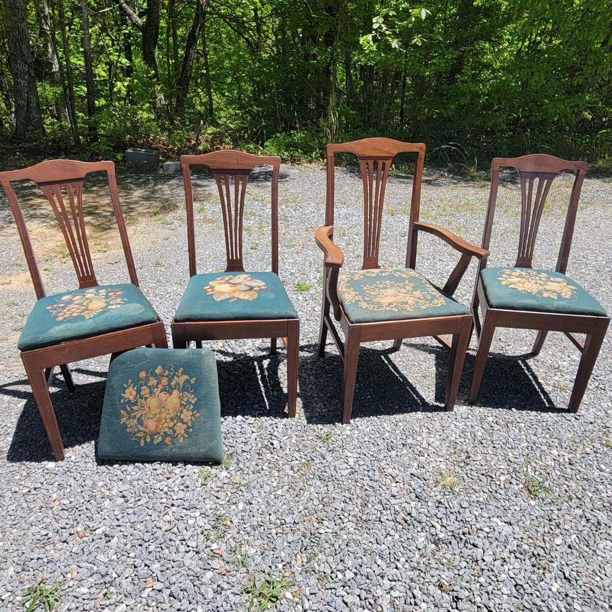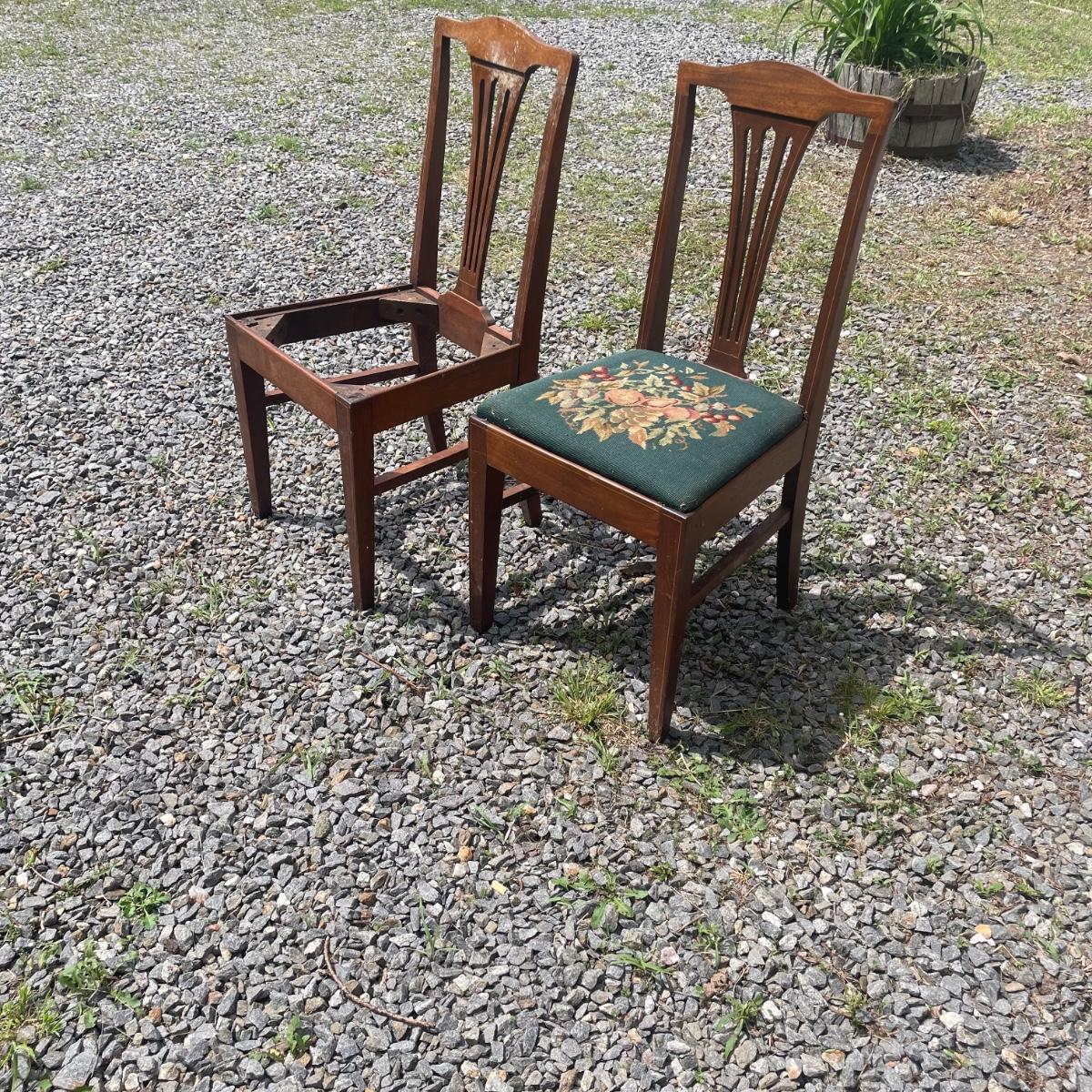 Wooden, dining room table with three 12" inserts. Table is solid wood with a maple veneer and some inlay. Table top has numerous small scratches, but no deep gouges. The veneer is peeling in multiple areas. Hardware to mount the base and slides for the inserts is included. The 6 chairs are in good condition but seats will likely need to be upholstered. One chair has arms, the other 3 do not. Includes extra seat cushion.