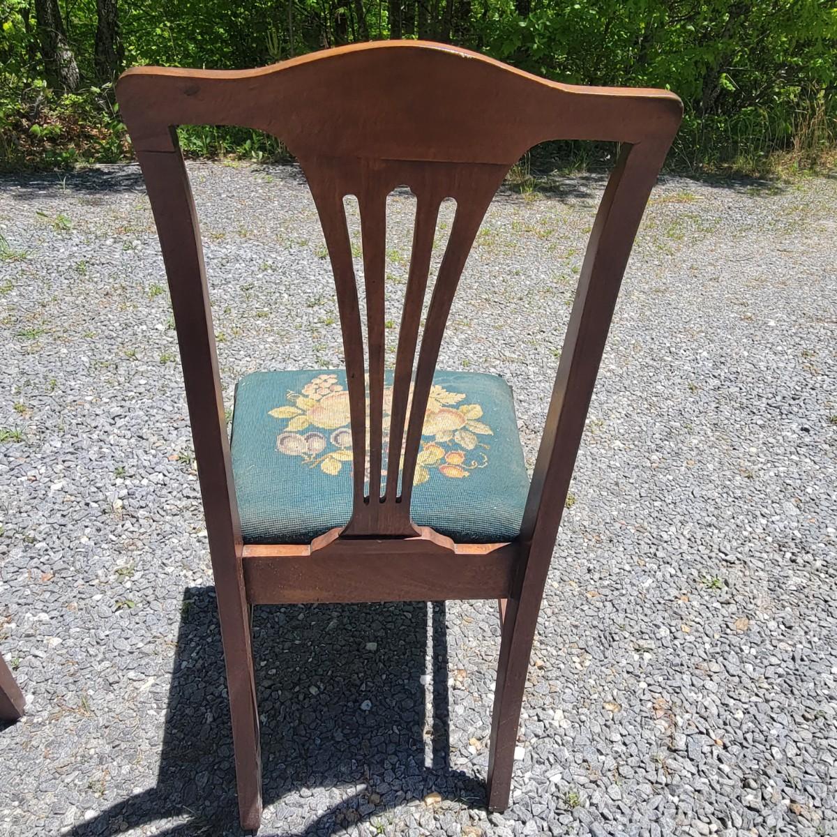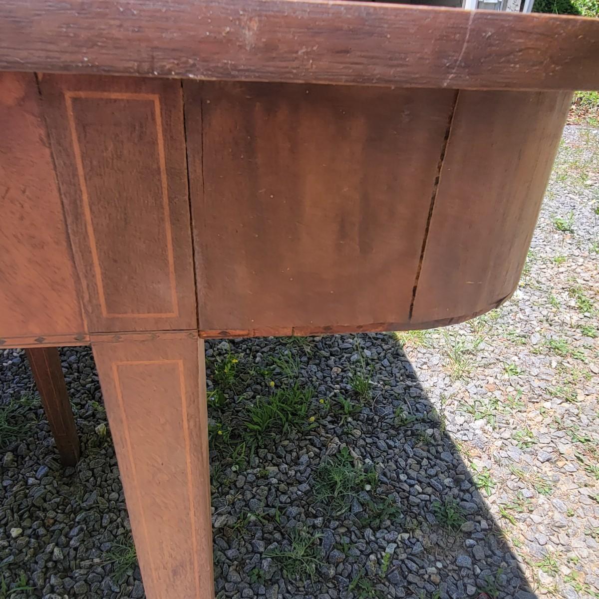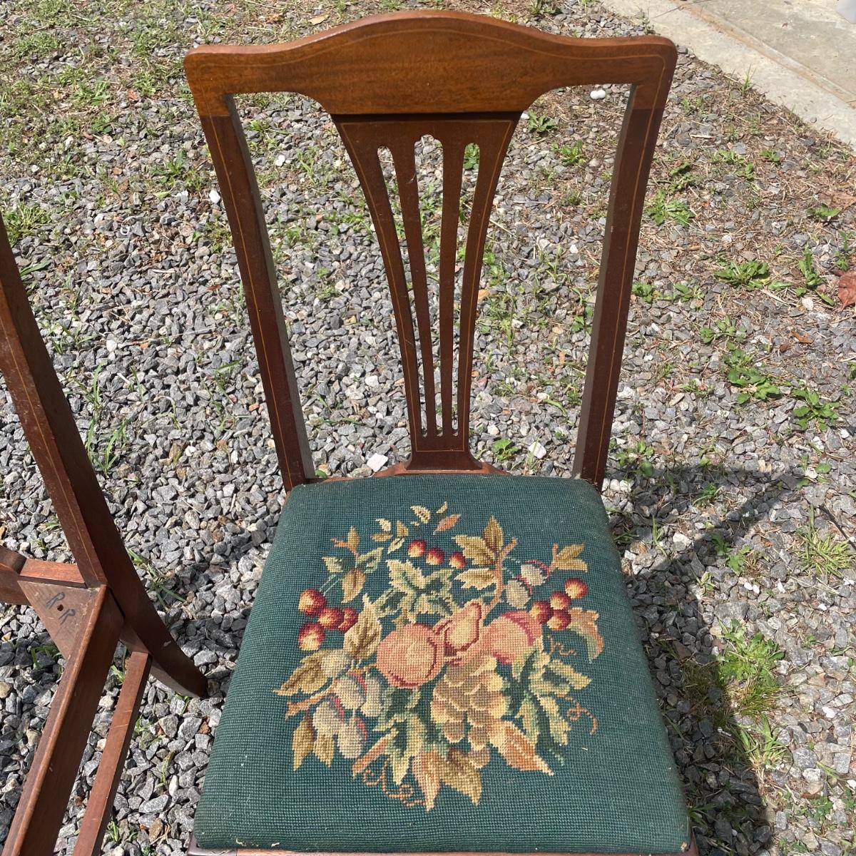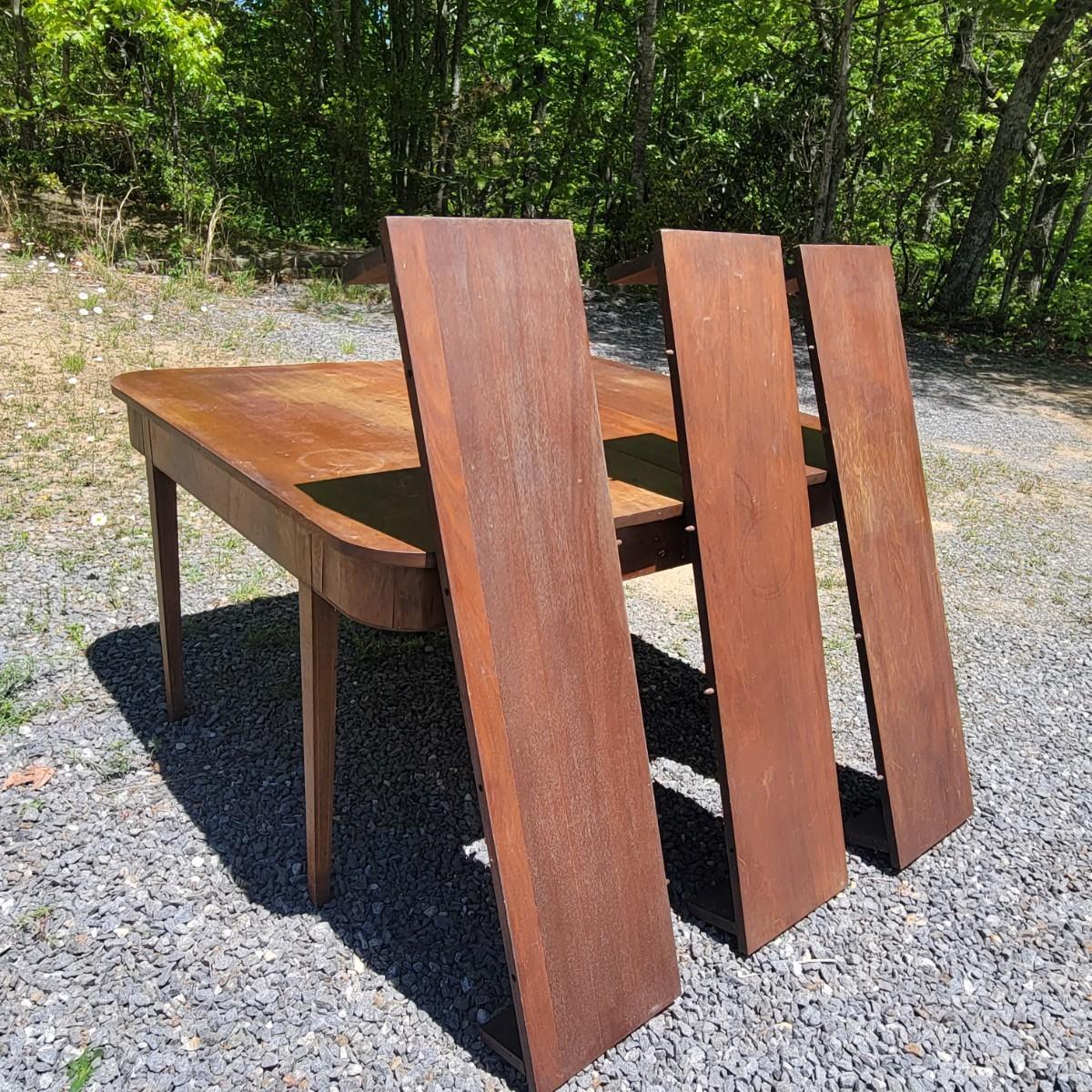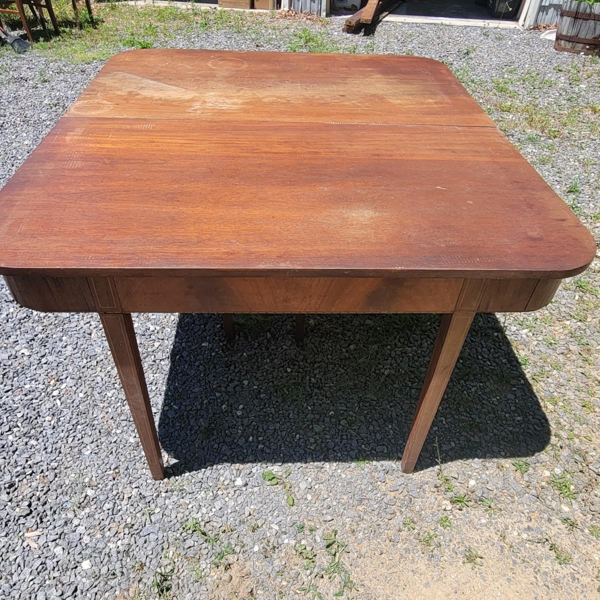 Wooden, dining room table with three 12" inserts. Table is solid wood with a maple veneer and some inlay. Table top has numerous small scratches, but no deep gouges. The veneer is peeling in multiple areas. Hardware to mount the base and slides for the inserts is included. The 6 chairs are in good condition but seats will likely need to be upholstered. One chair has arms, the other 3 do not. Includes extra seat cushion.
