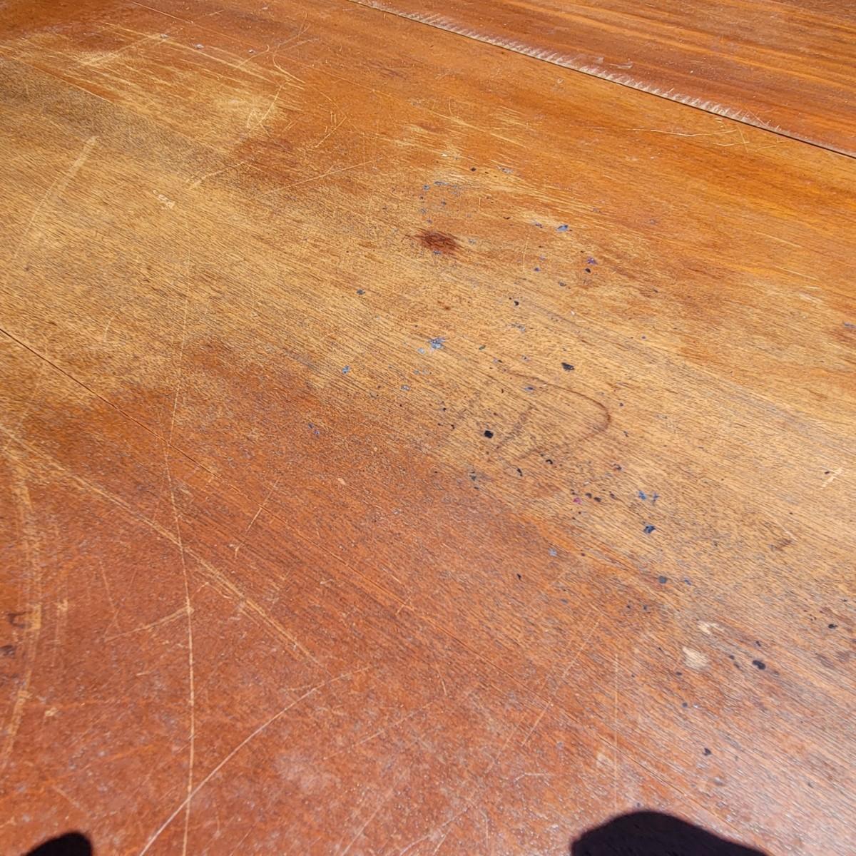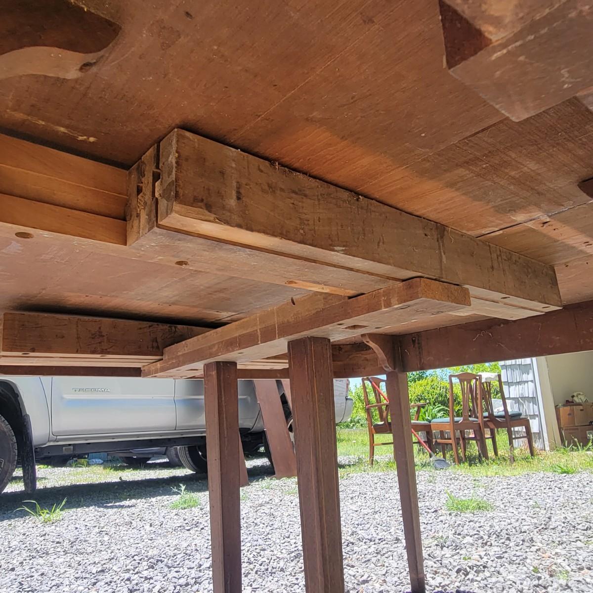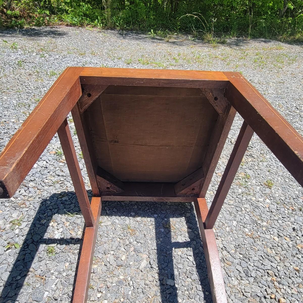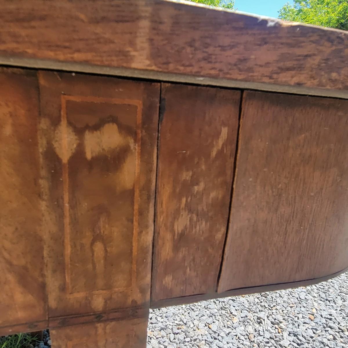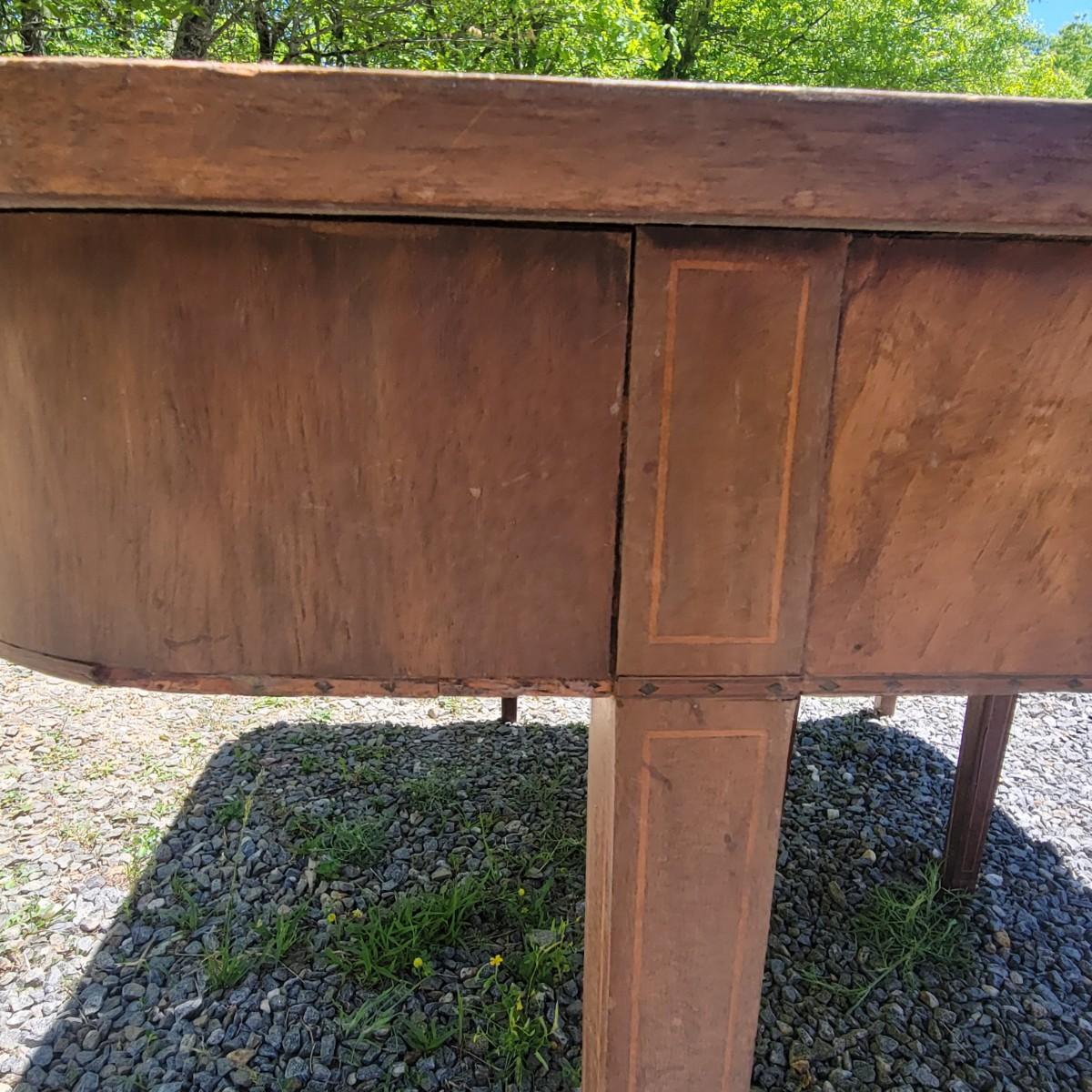 Wooden, dining room table with three 12" inserts. Table is solid wood with a maple veneer and some inlay. Table top has numerous small scratches, but no deep gouges. The veneer is peeling in multiple areas. Hardware to mount the base and slides for the inserts is included. The 6 chairs are in good condition but seats will likely need to be upholstered. One chair has arms, the other 3 do not. Includes extra seat cushion.