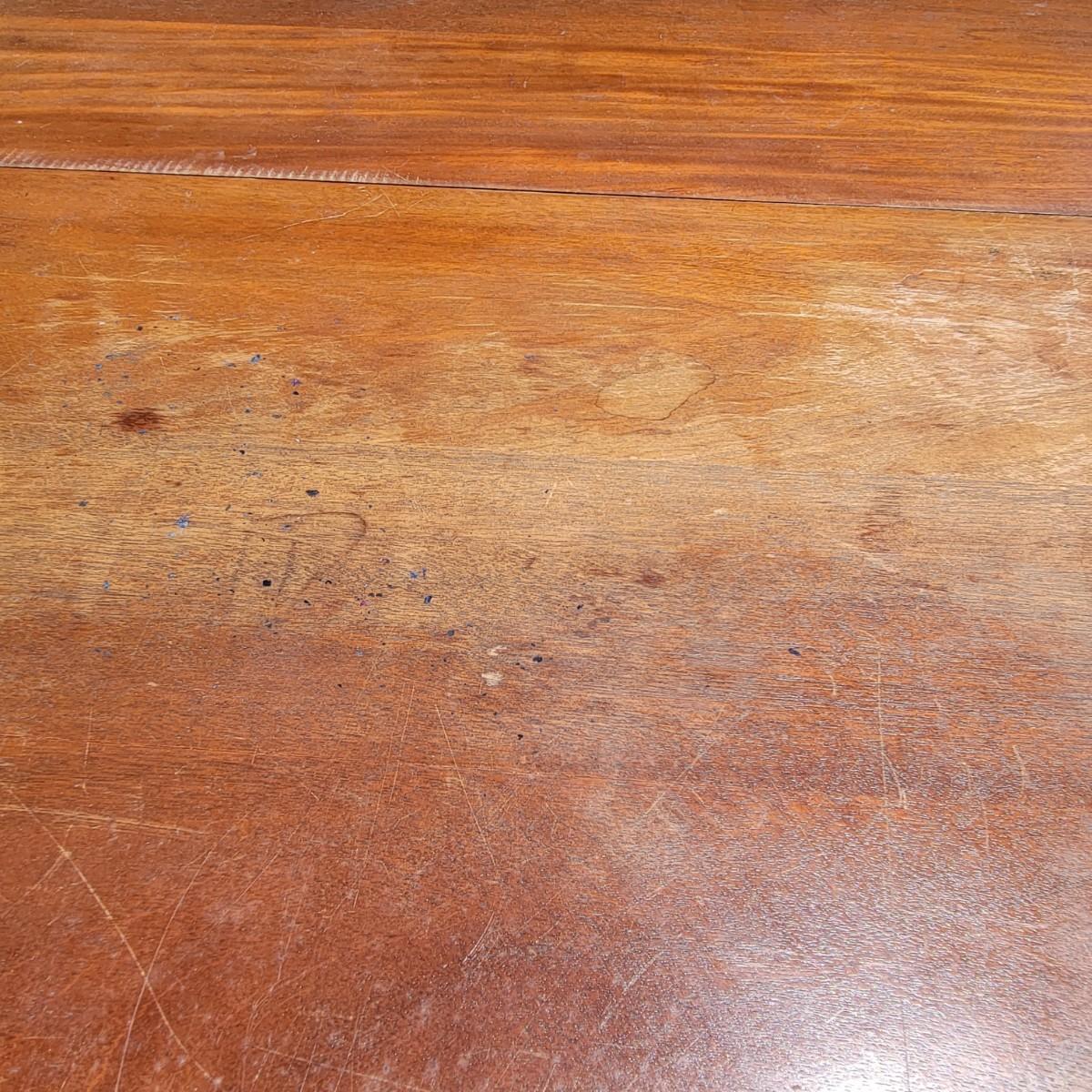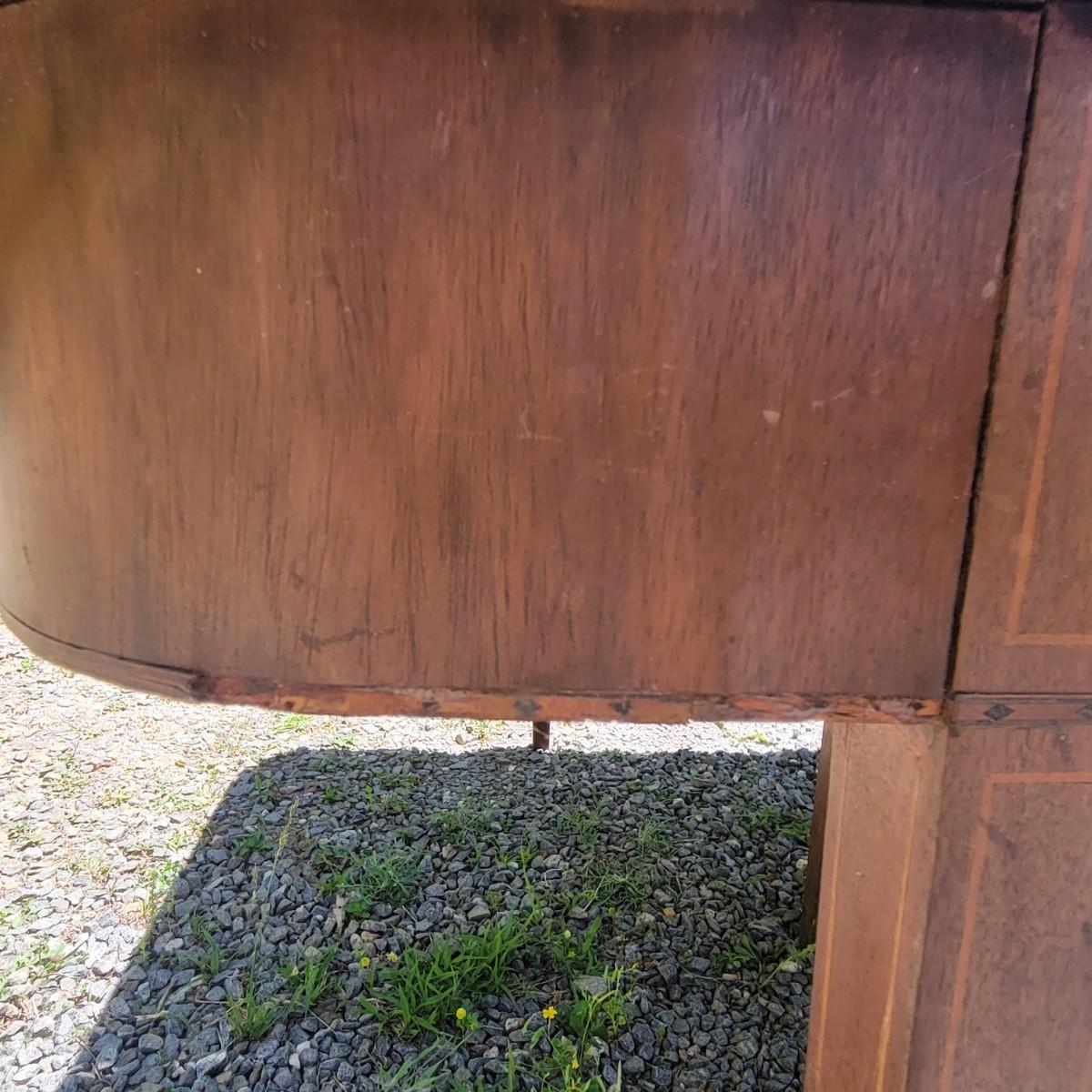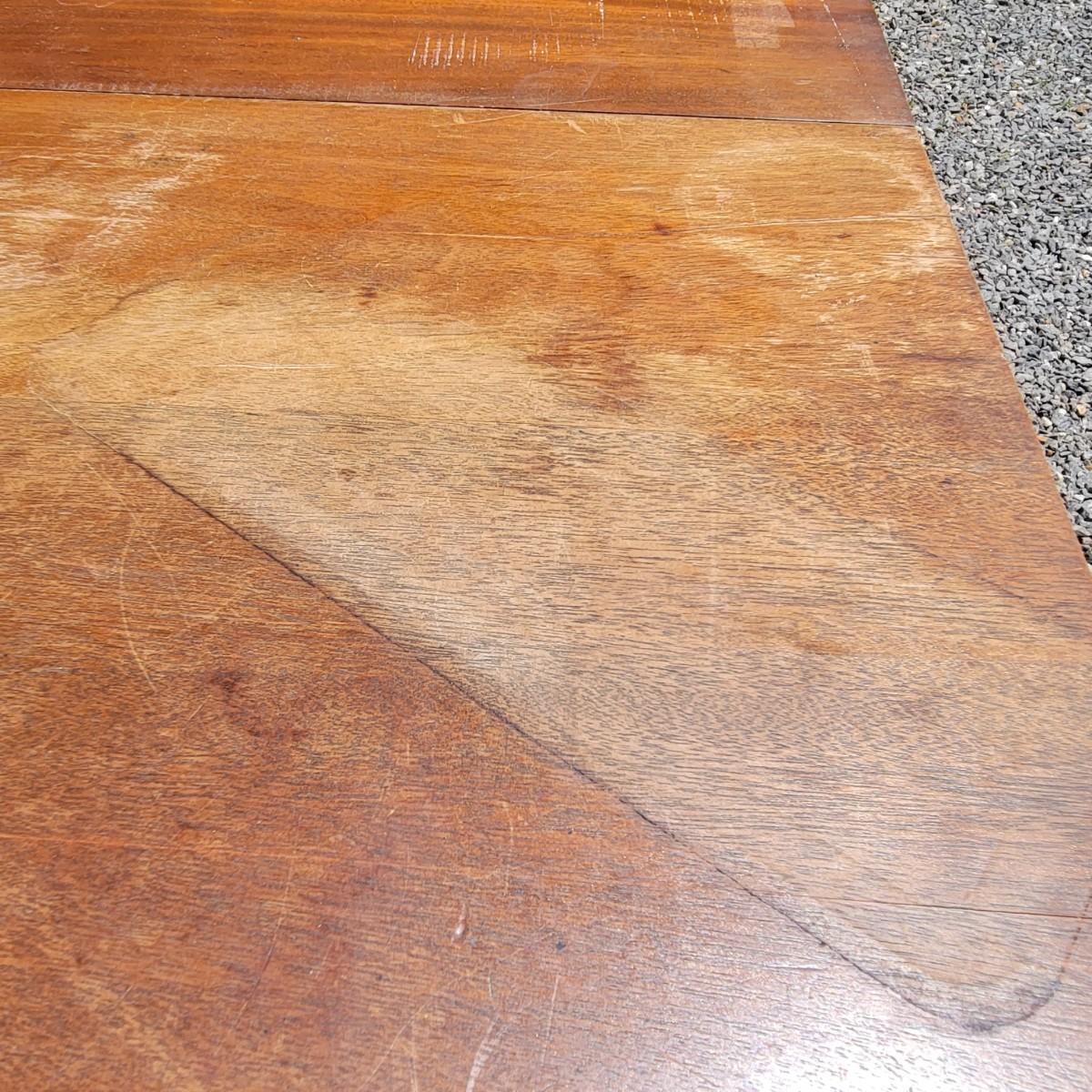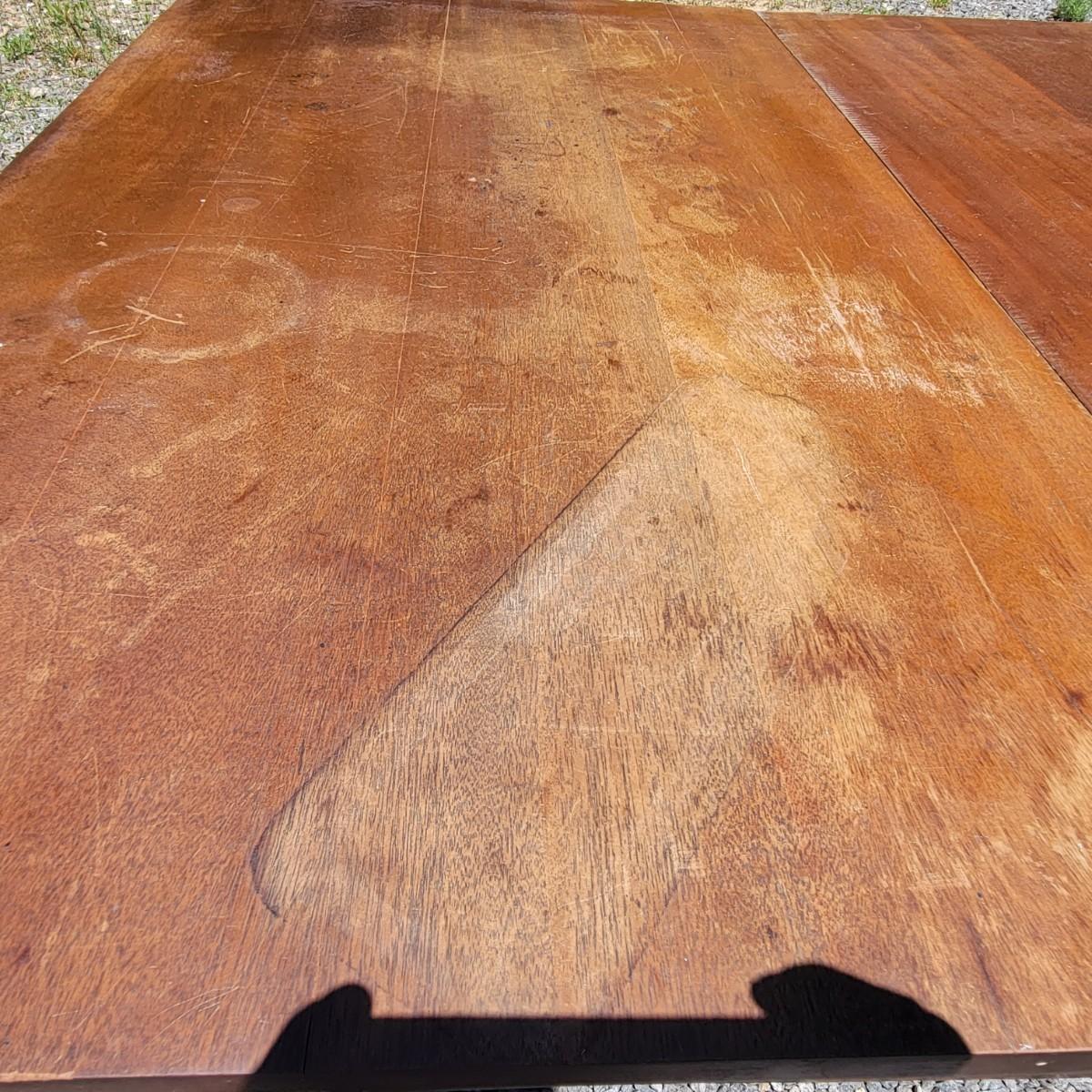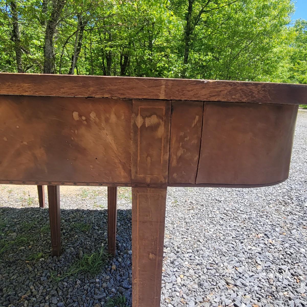 Wooden, dining room table with three 12" inserts. Table is solid wood with a maple veneer and some inlay. Table top has numerous small scratches, but no deep gouges. The veneer is peeling in multiple areas. Hardware to mount the base and slides for the inserts is included. The 6 chairs are in good condition but seats will likely need to be upholstered. One chair has arms, the other 3 do not. Includes extra seat cushion.