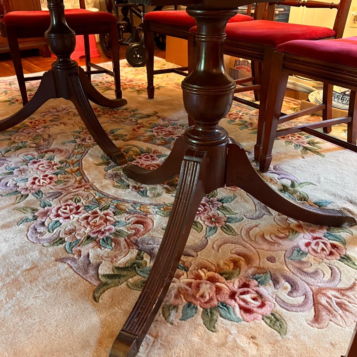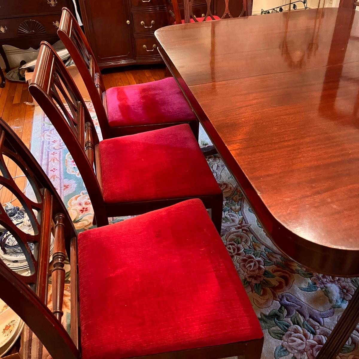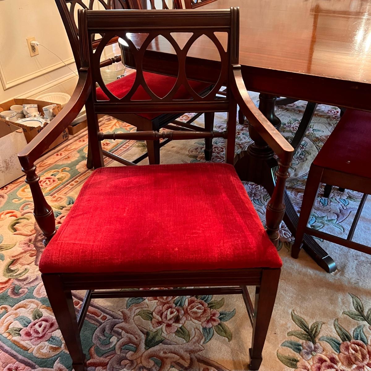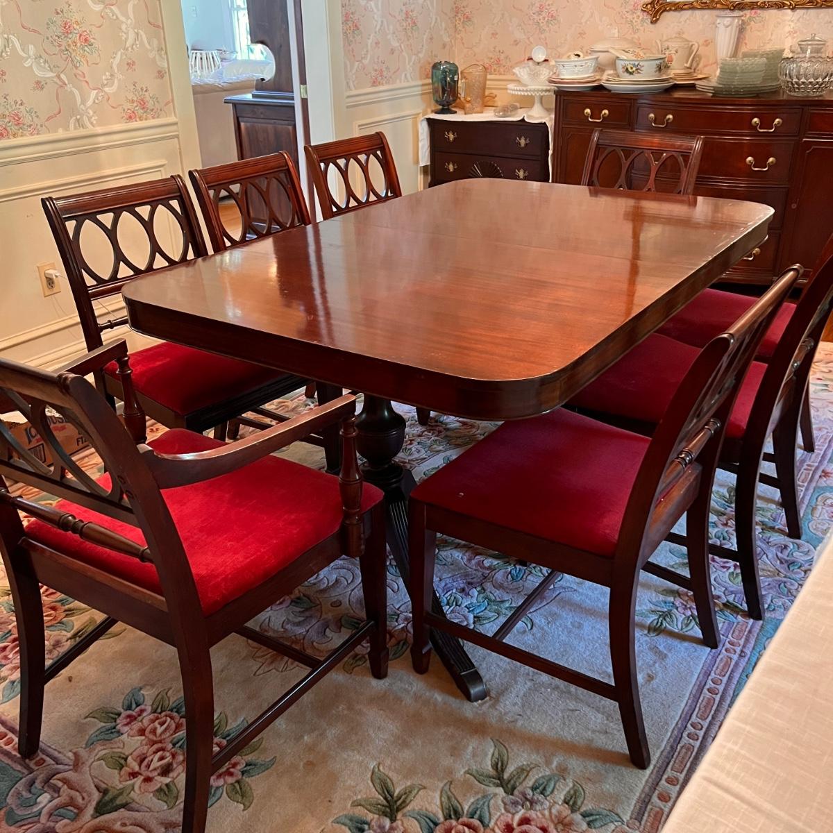 Antique table in the style of Duncan Phyfe, has a leaf that folds into the table. Without the leaves its 62" long. With the leaves its 90" long. The top shows wear and scratches as shown in pics. 8 chairs, 1 is a captains chair. Red upholstery, shows some age.