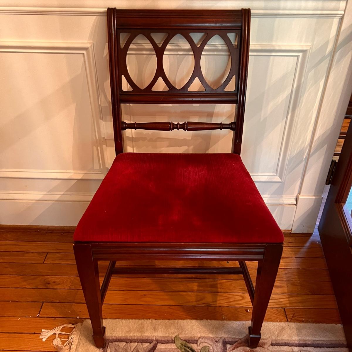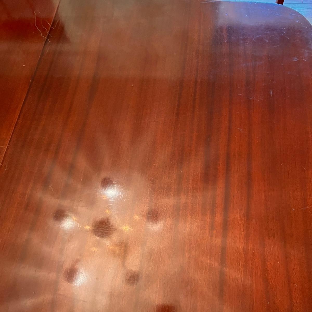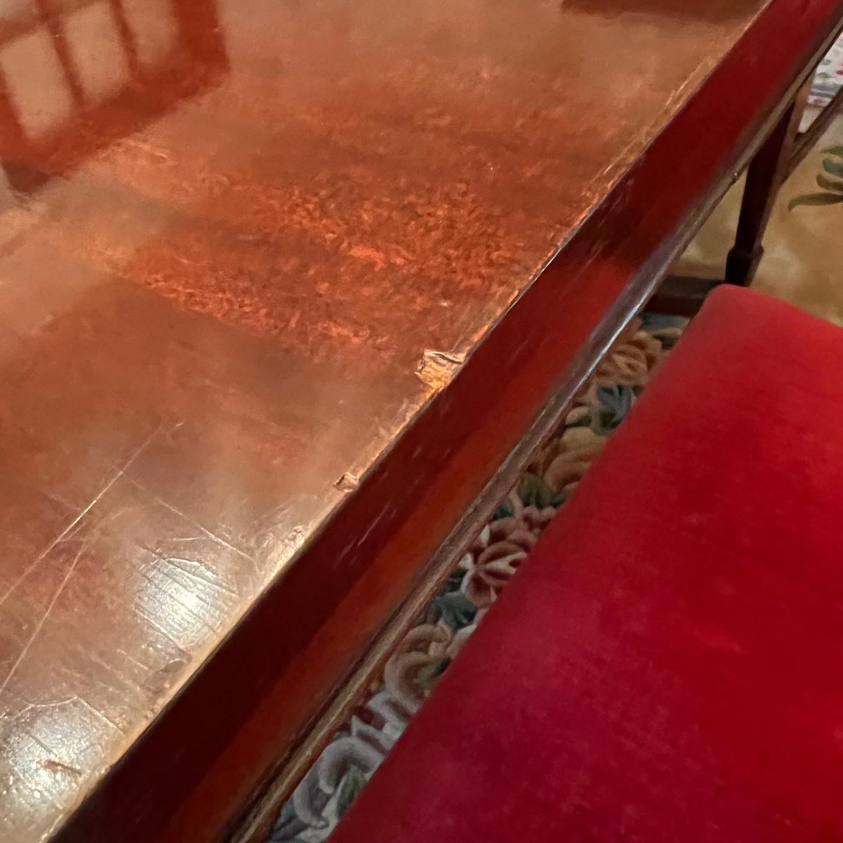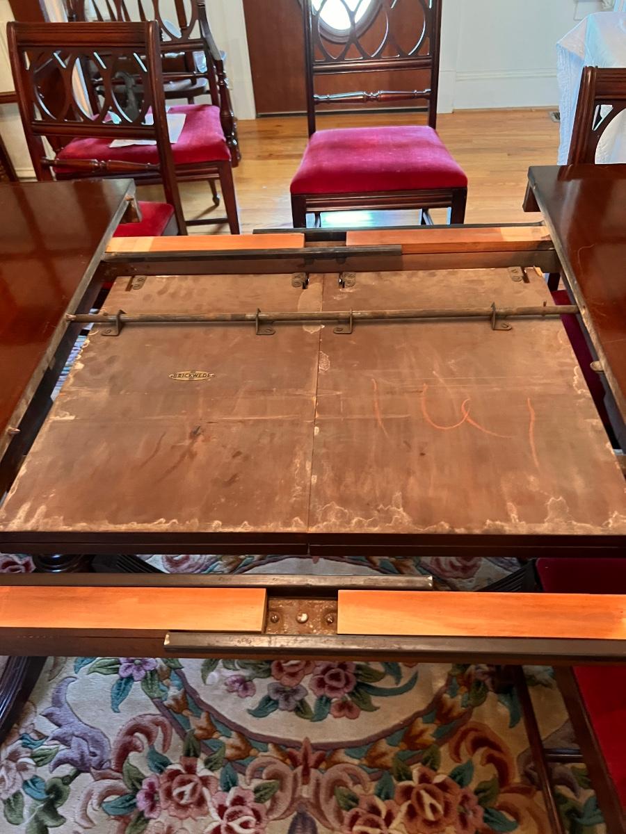 Antique table in the style of Duncan Phyfe, has a leaf that folds into the table. Without the leaves its 62" long. With the leaves its 90" long. The top shows wear and scratches as shown in pics. 8 chairs, 1 is a captains chair. Red upholstery, shows some age.