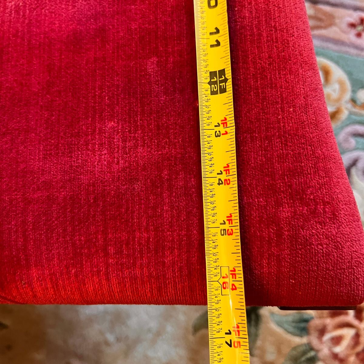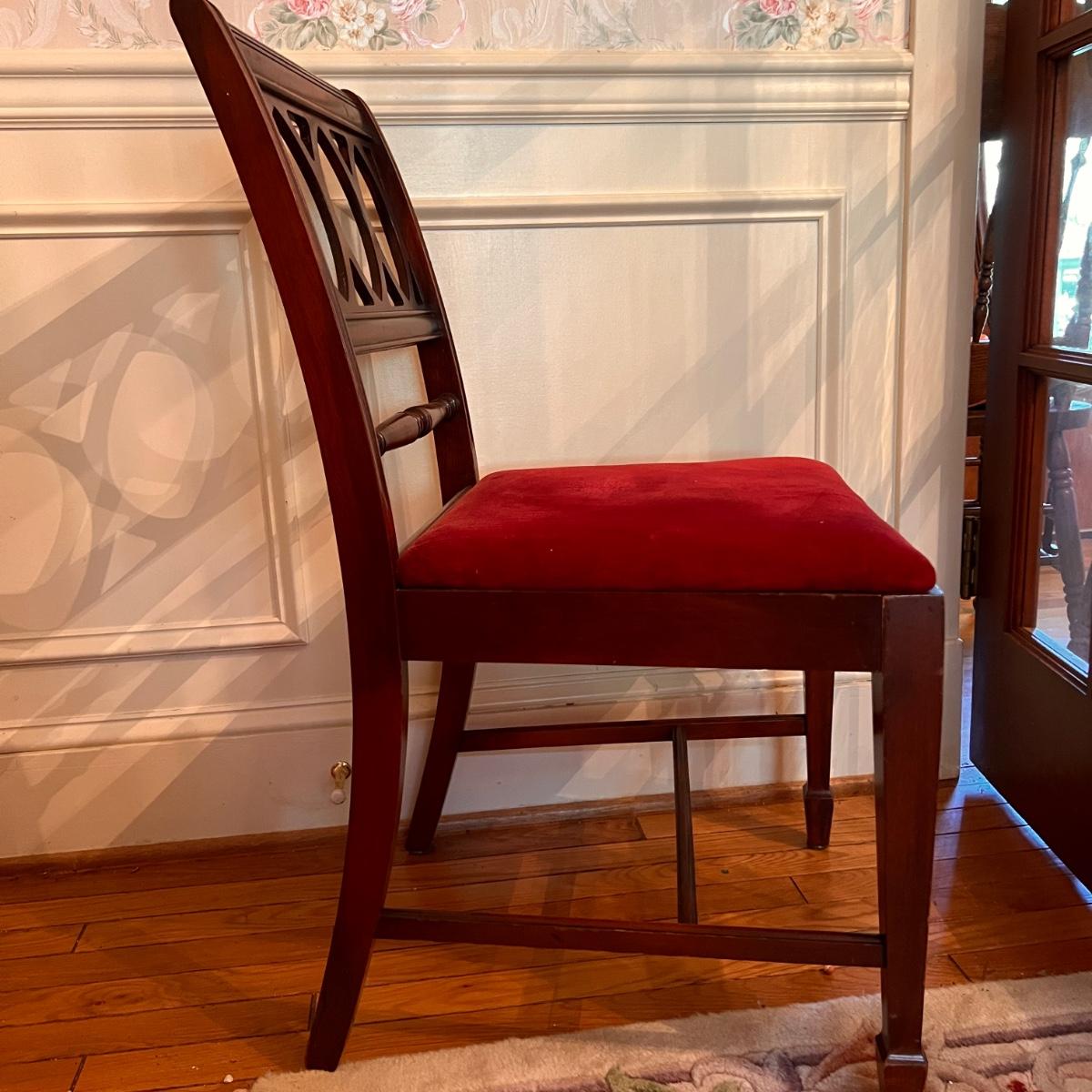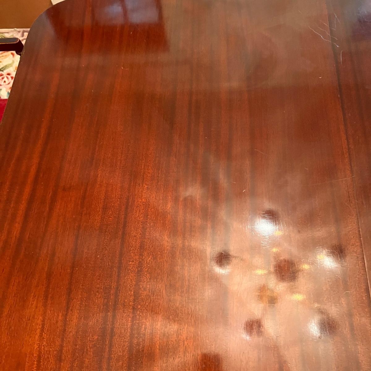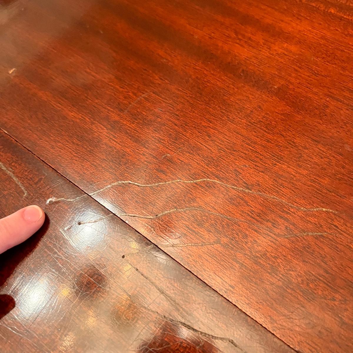 Antique table in the style of Duncan Phyfe, has a leaf that folds into the table. Without the leaves its 62" long. With the leaves its 90" long. The top shows wear and scratches as shown in pics. 8 chairs, 1 is a captains chair. Red upholstery, shows some age.