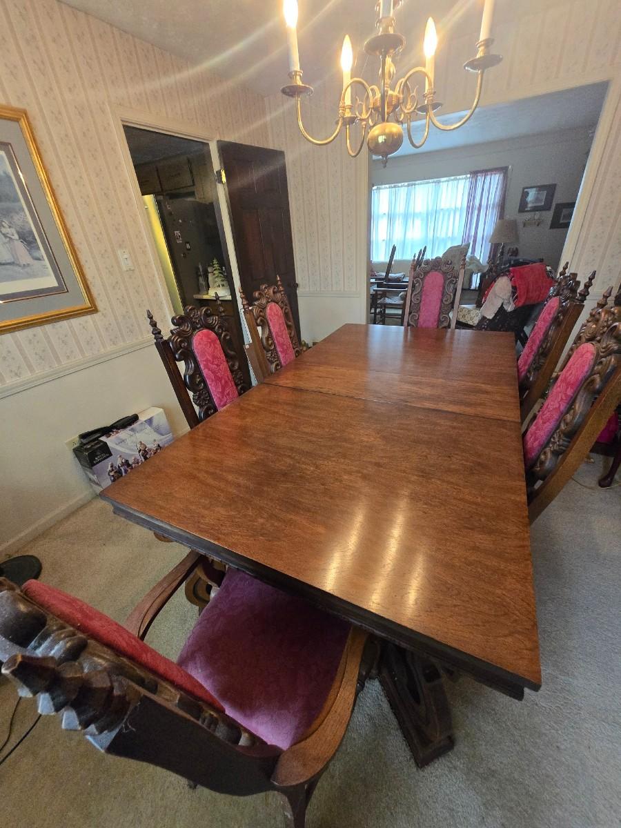 Antique Dining Table Set with Six Carved Chairs - This elegant antique dining table set features a beautifully crafted wood table with six intricately carved chairs. The chairs feature rich burgundy upholstery, adding a touch of luxury to any dining room. A perfect blend of vintage charm and real world personality. In stellar condition. Matching China cabinet for an additional $100.