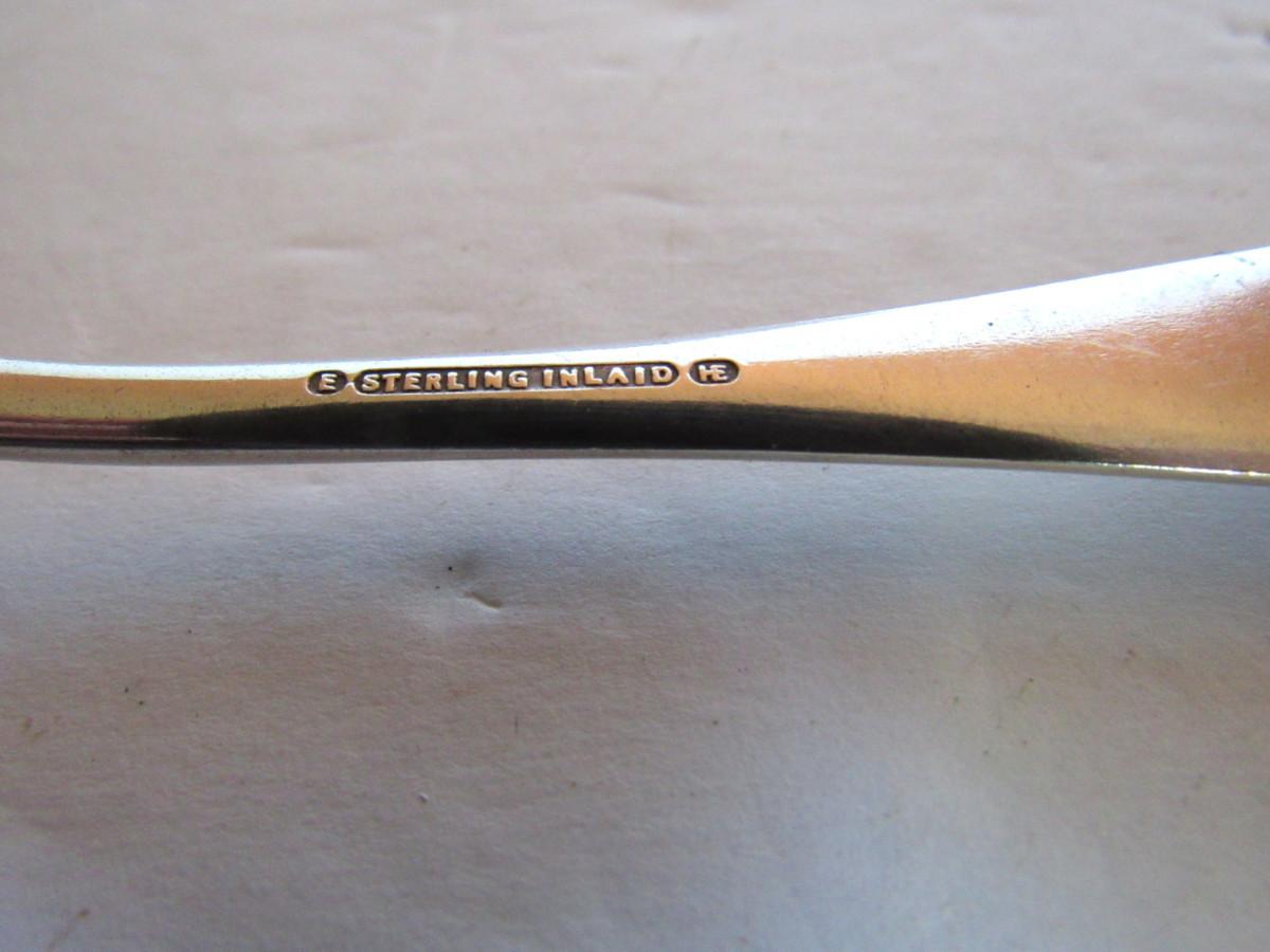 Very nice shape. Marked on backs. Note: according to the net, Sterling Inlaid means sterling silver was layered directly on the metal on the high wear spots and then the entire piece is silver plated. Shipping is available at actual shipping cost plus $5.00 handling fee per box for supplies/labor. See our terms for details. All sales are final. Condition notes may not be all inclusive, we may miss some issues as most vintage items are not in mint condition and have some degree of wear, paint loss, etc, but we always try to note obvious damage.