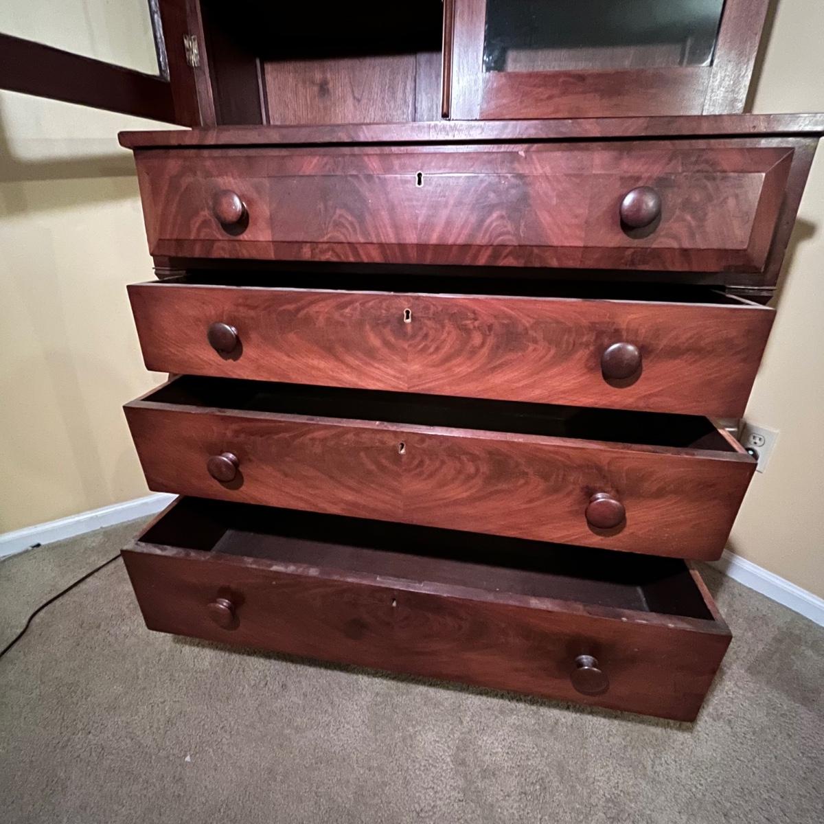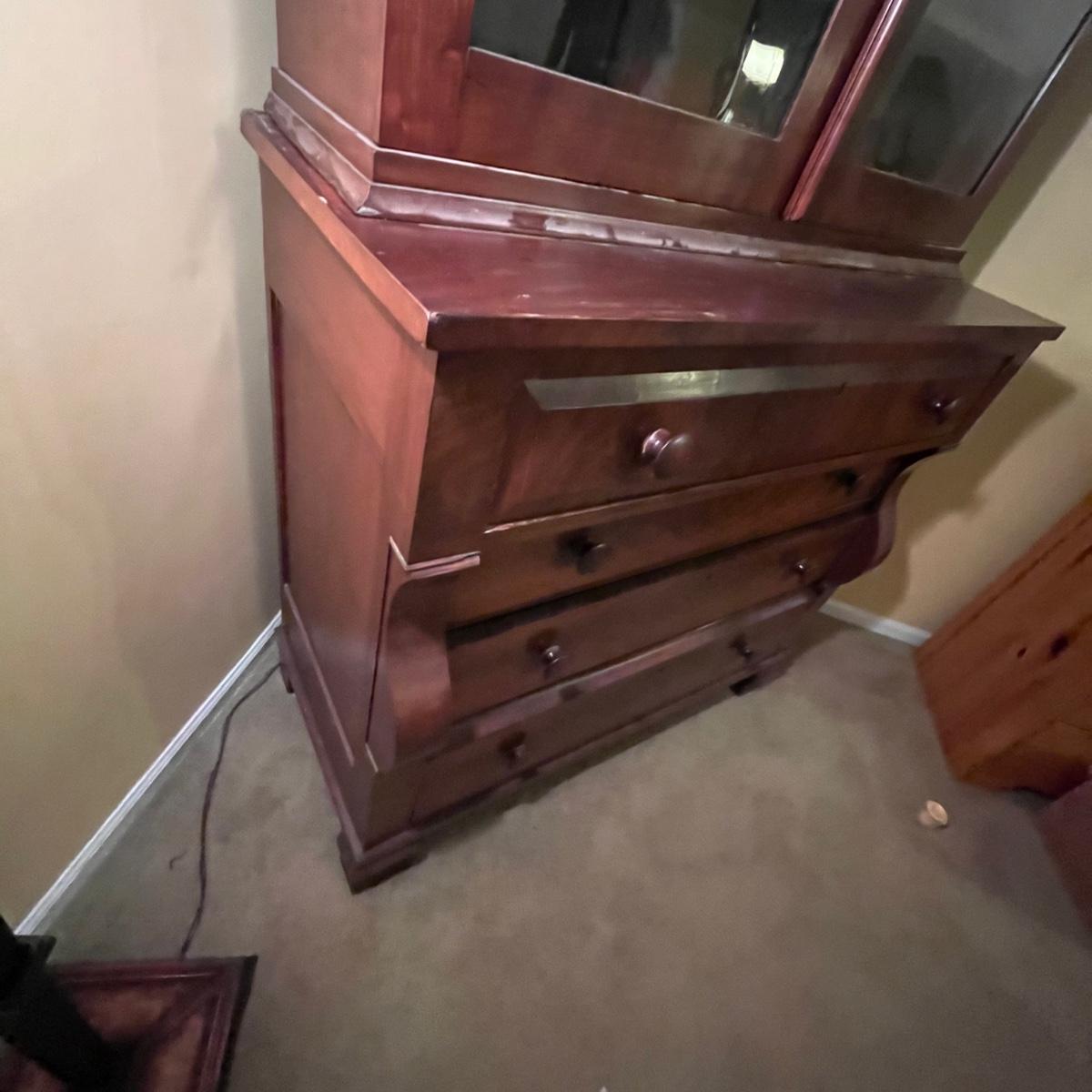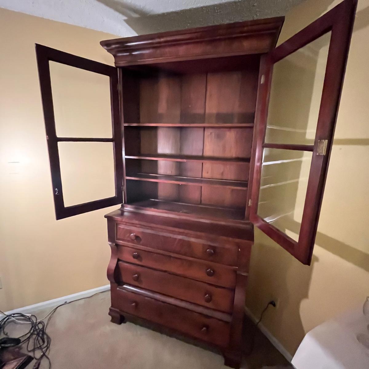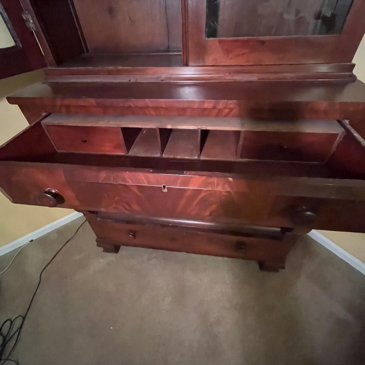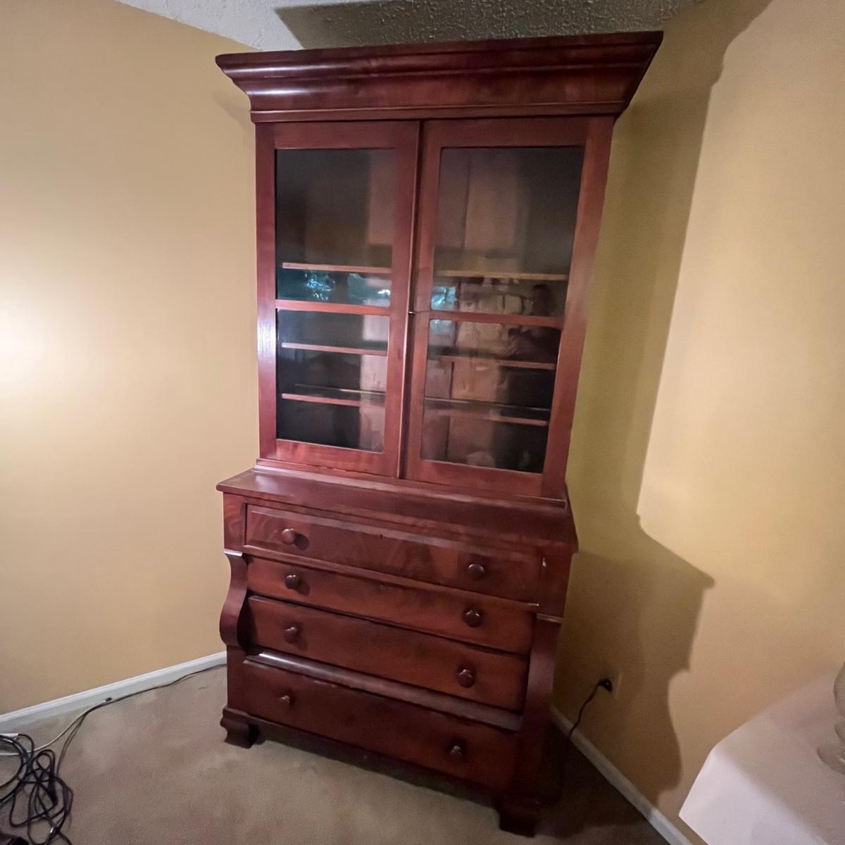 Lot includes an antique display hutch that is in two pieces. The top piece has glass doors with three adjustable wooden shelves and includes key. The bottom piece has four dovetailed drawers; top drawer has cubby holes and also includes the key. Bottom piece measures 20.5” x 44” x 39.5” and top piece measures 13” x 43” x 49.5”. Pictures do not do this piece justice, come check it out at preview. This piece is in great condition with a nick in one drawer, see image.