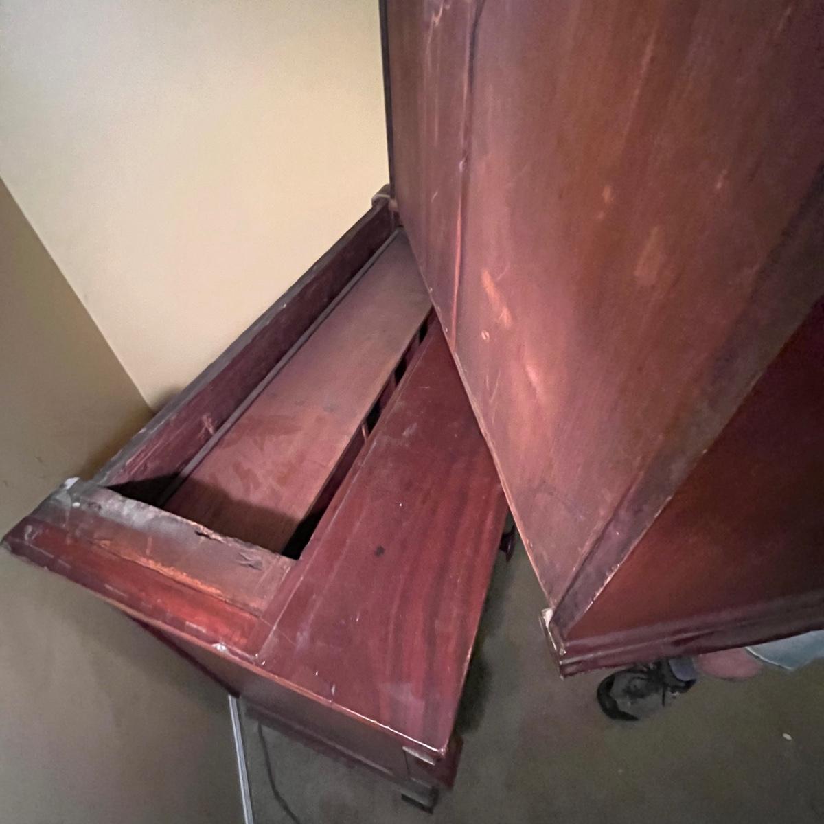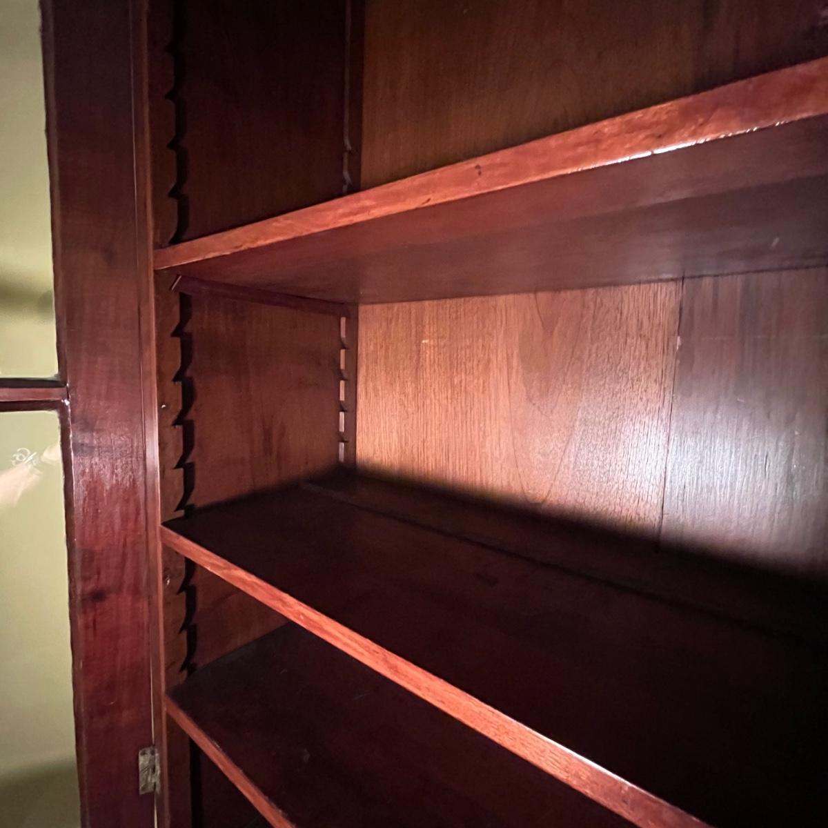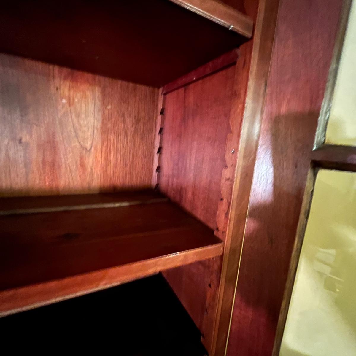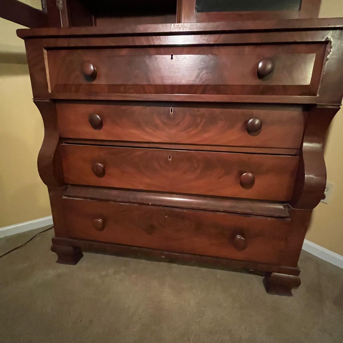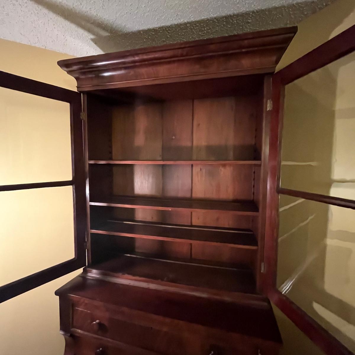 Lot includes an antique display hutch that is in two pieces. The top piece has glass doors with three adjustable wooden shelves and includes key. The bottom piece has four dovetailed drawers; top drawer has cubby holes and also includes the key. Bottom piece measures 20.5” x 44” x 39.5” and top piece measures 13” x 43” x 49.5”. Pictures do not do this piece justice, come check it out at preview. This piece is in great condition with a nick in one drawer, see image.